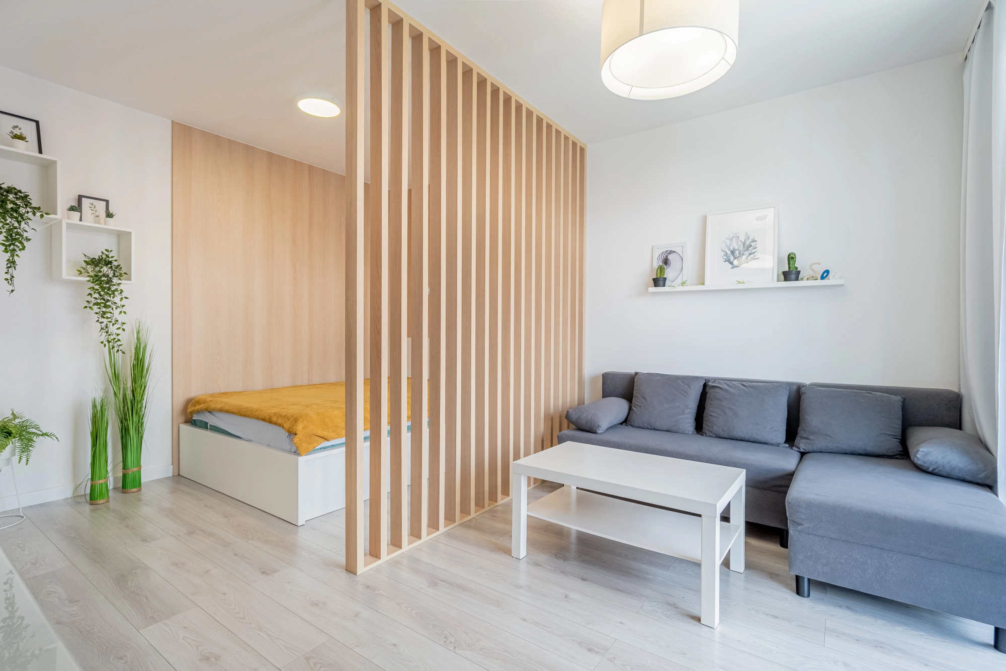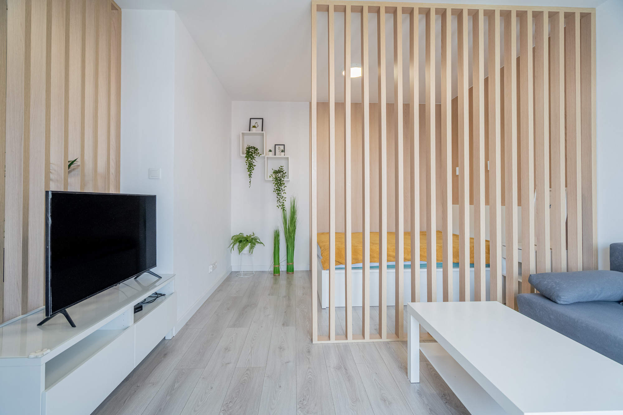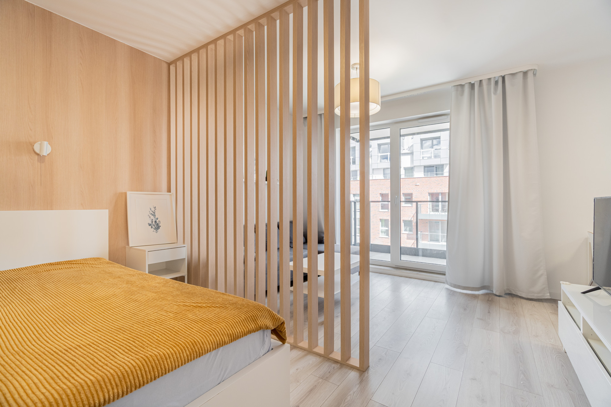 – W salonie została wydzielona część sypialniana, oddzielona eleganckimi lamelami,