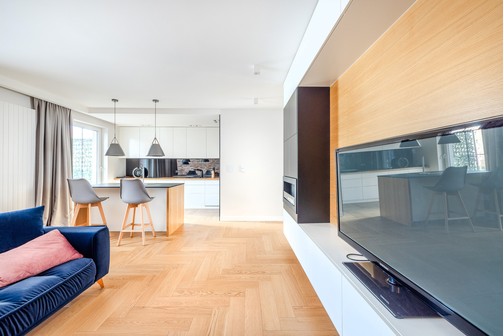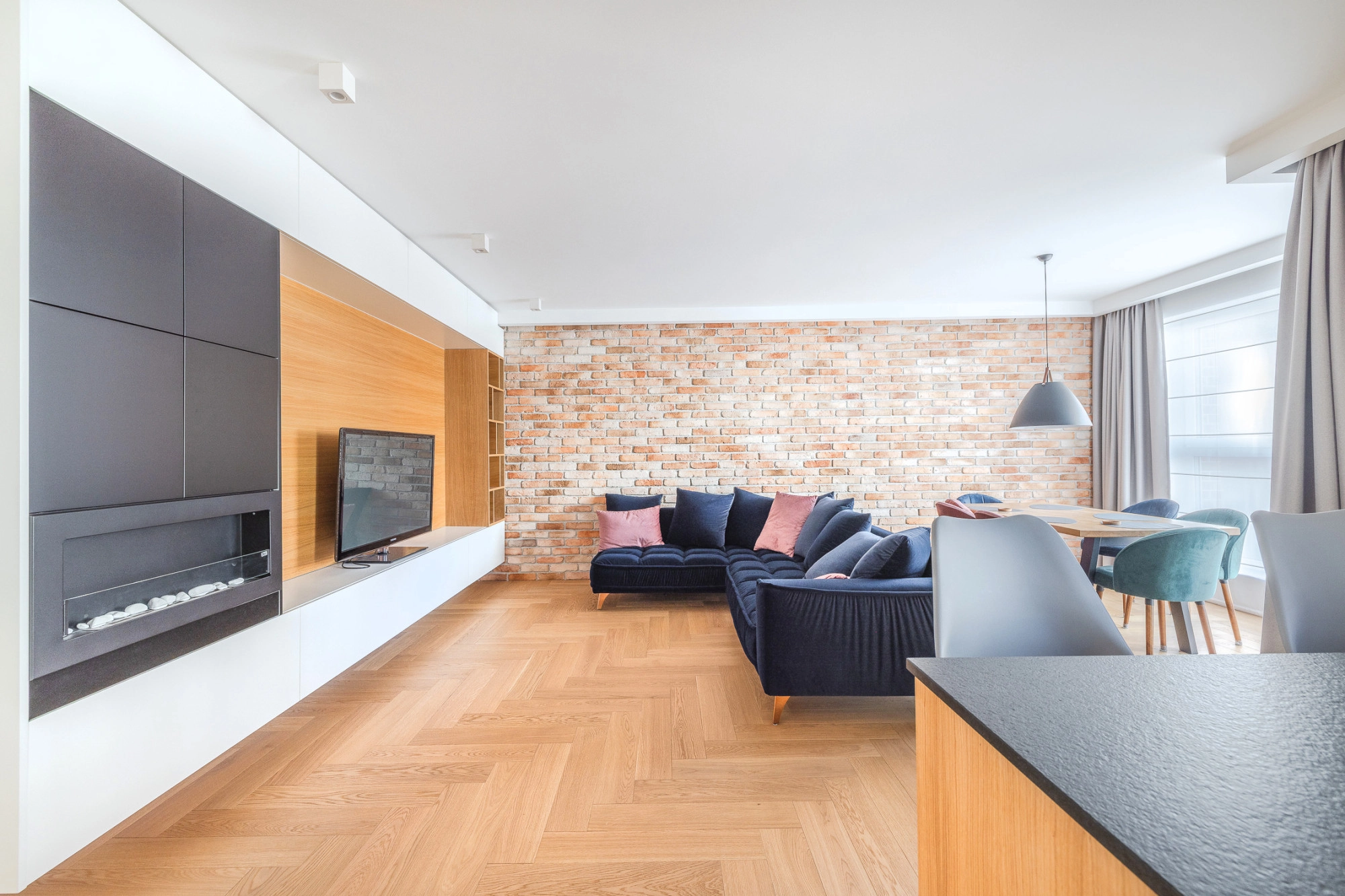 – salon z aneksem kuchennym o powierzchni ok. 39 m2 z wyjściem na słoneczny balkon,