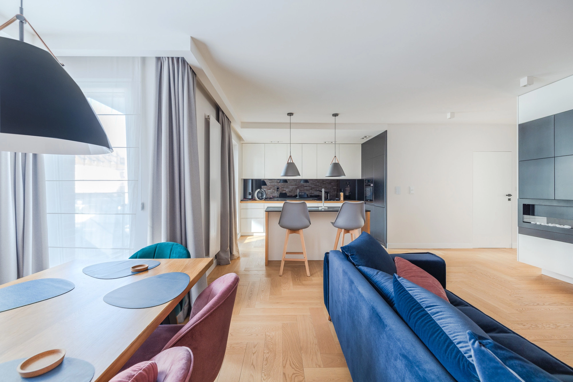 wspaniale zaprojektowany lokal mieszkalny o powierzchni 96,23 m2 położony na drugim piętrze w 6. piętrowym budynku. Apartament jest w całości umeblowany i wyposażony w wysokiej jakości sprzęt AGD (zmywarka, lodówka, kuchenka, piekarnik itp.). Komfortowo urządzony, wykończony materiałami wysokiej klasy, gotowy do zamieszkania. Wystrój wnętrza oraz jego rozkład zaprojektowany przez architekta.