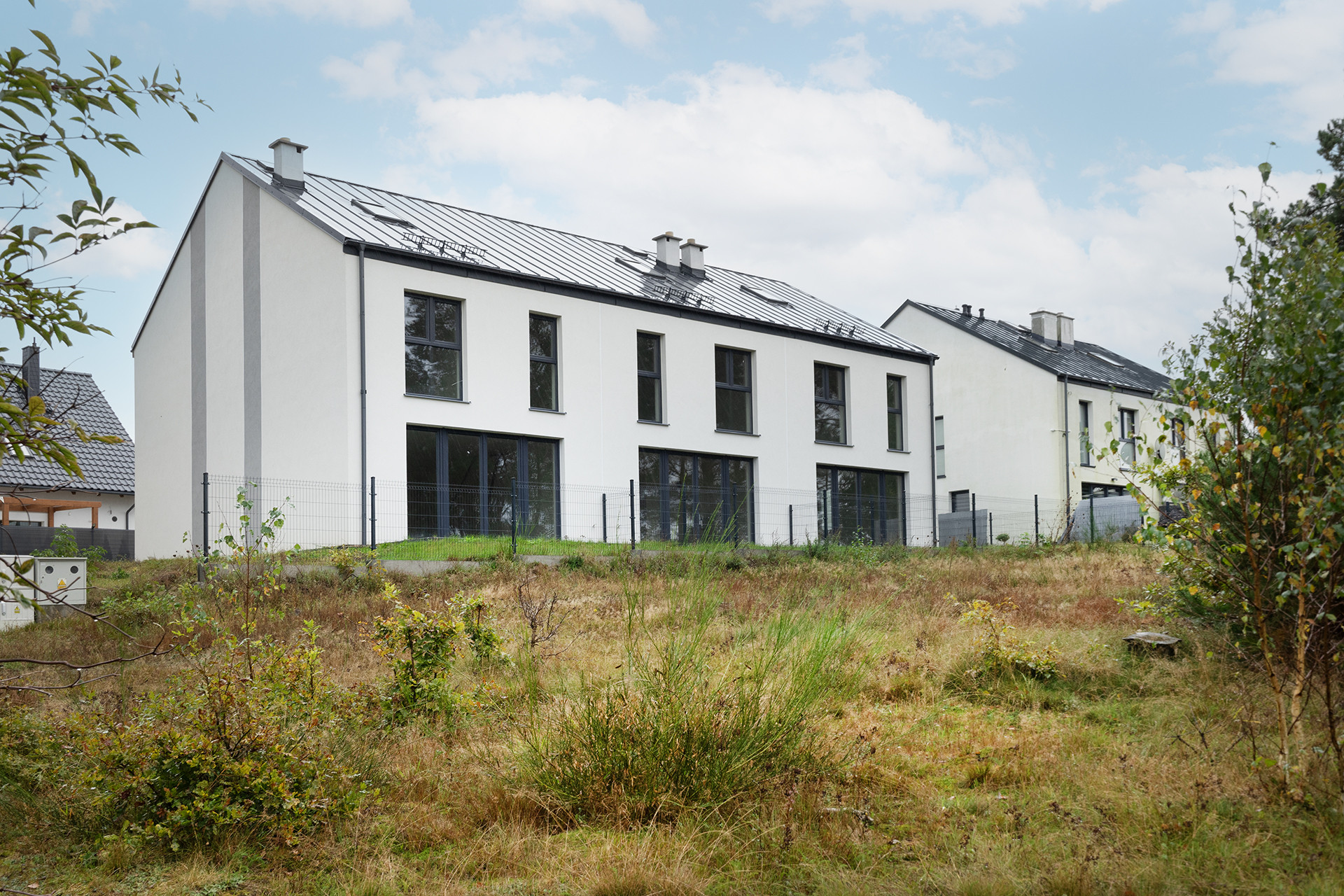 – dach dwuspadowy symetryczny pokryty blachą płaską na rąbek w kolorze antracyt lub zbliżony – rynny i rury spustowe stalowe