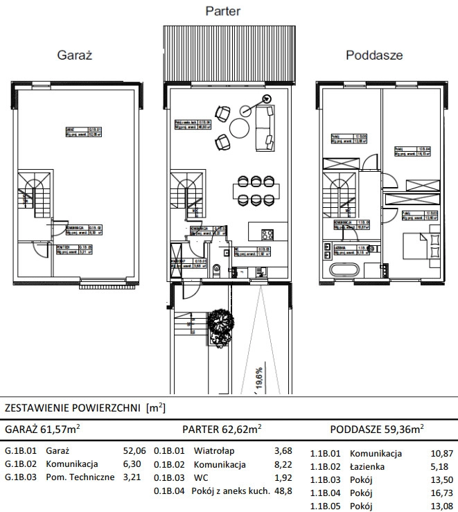 – garaż na 2 samochody (jeden za drugim) o pow. ok. 52 m2,