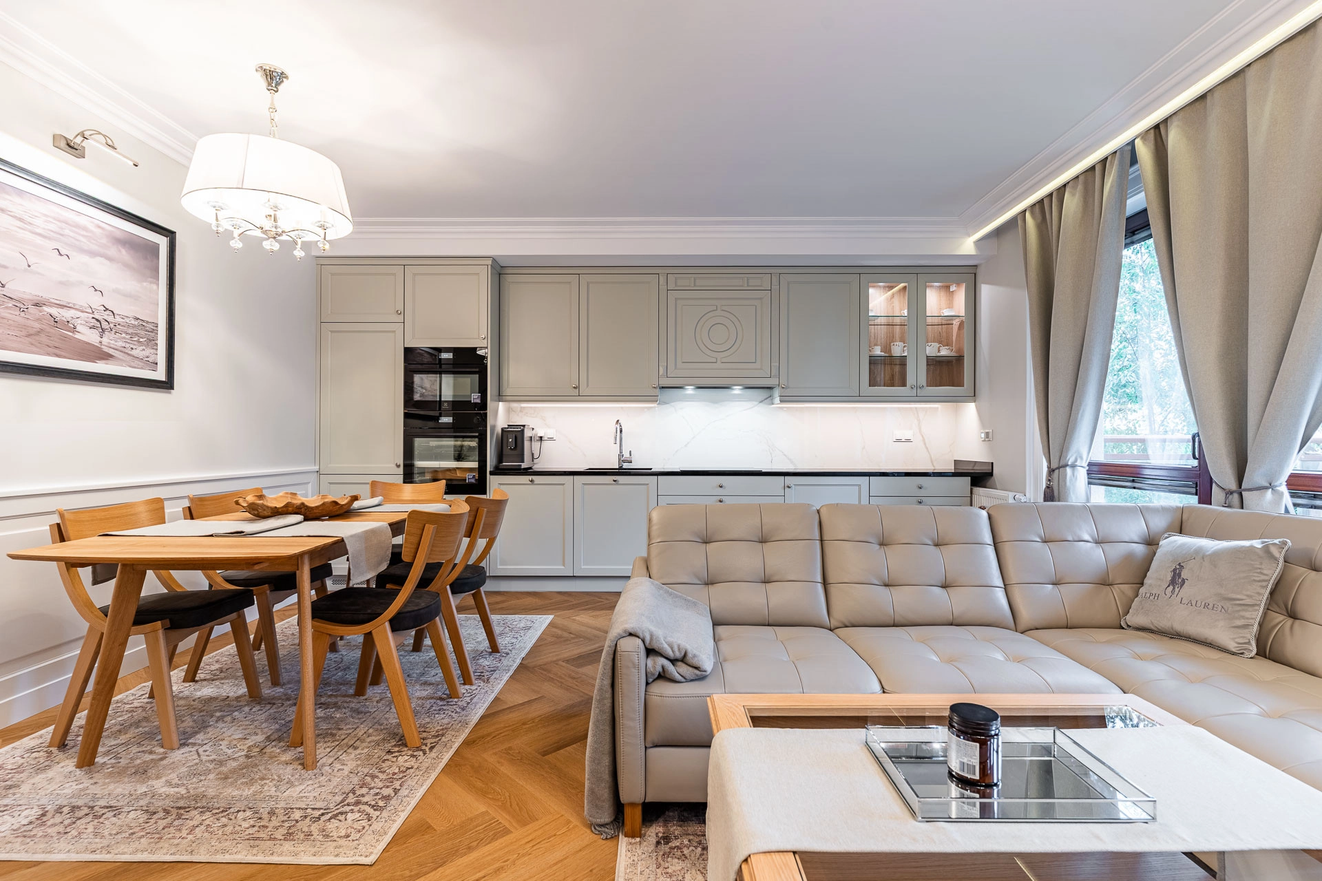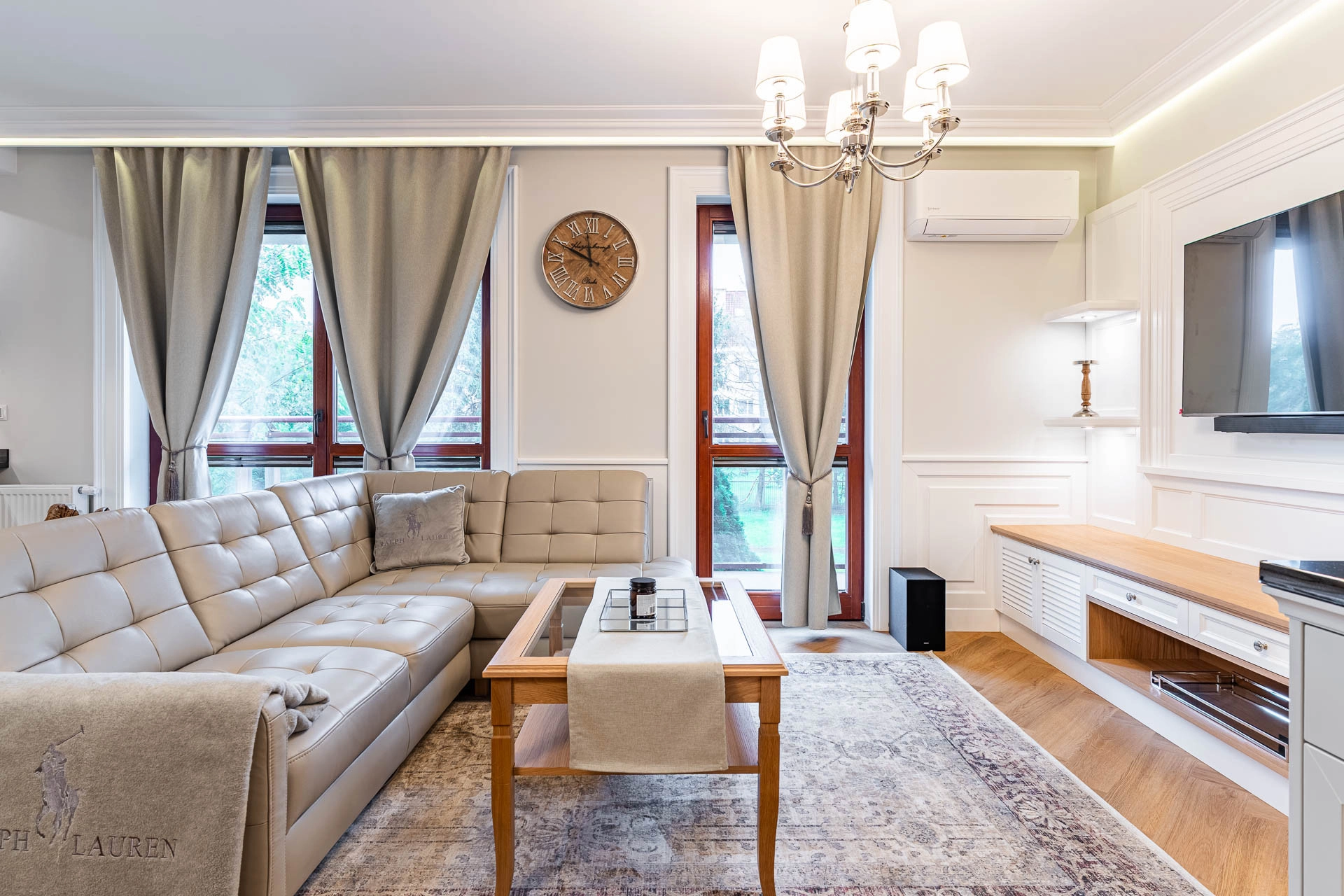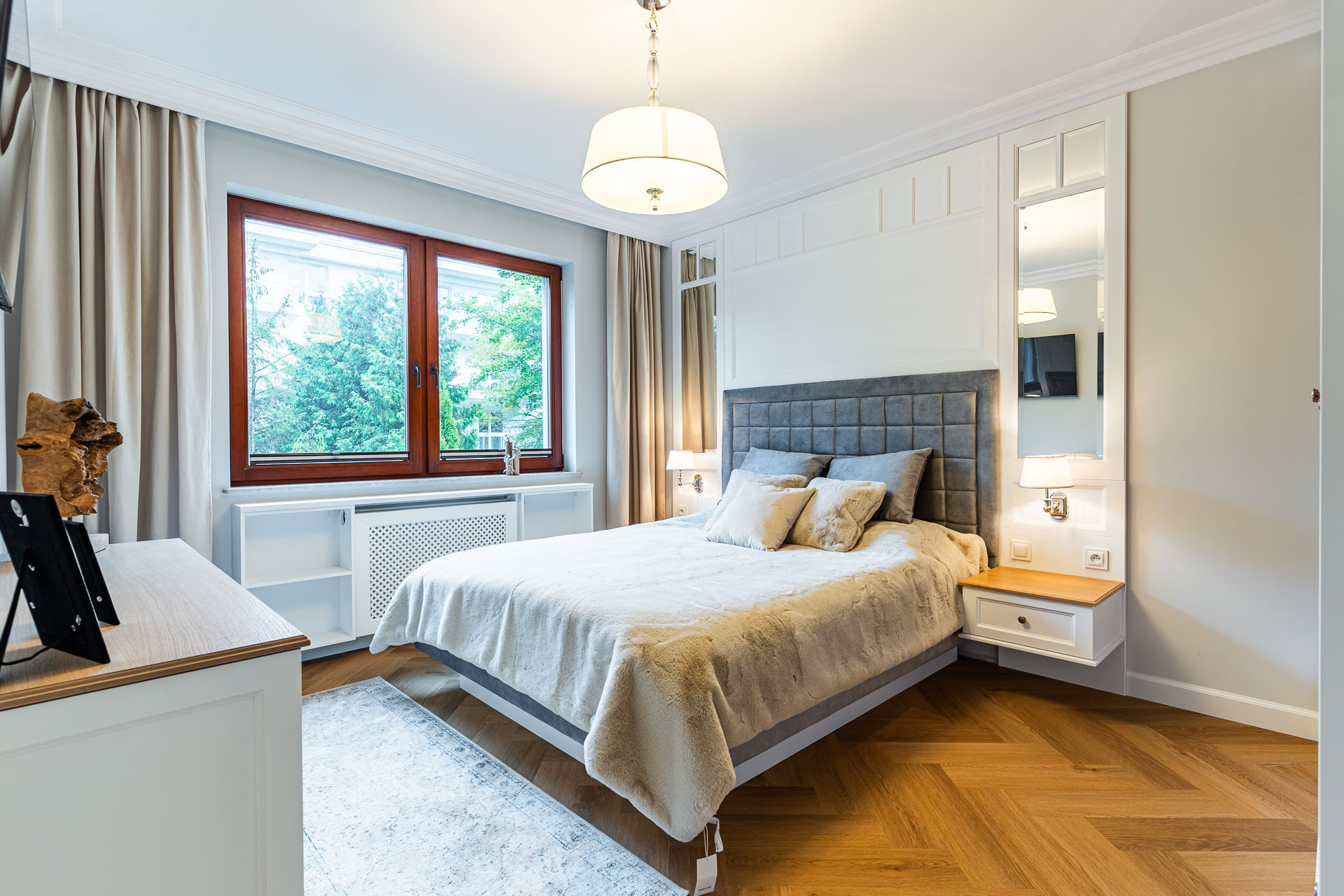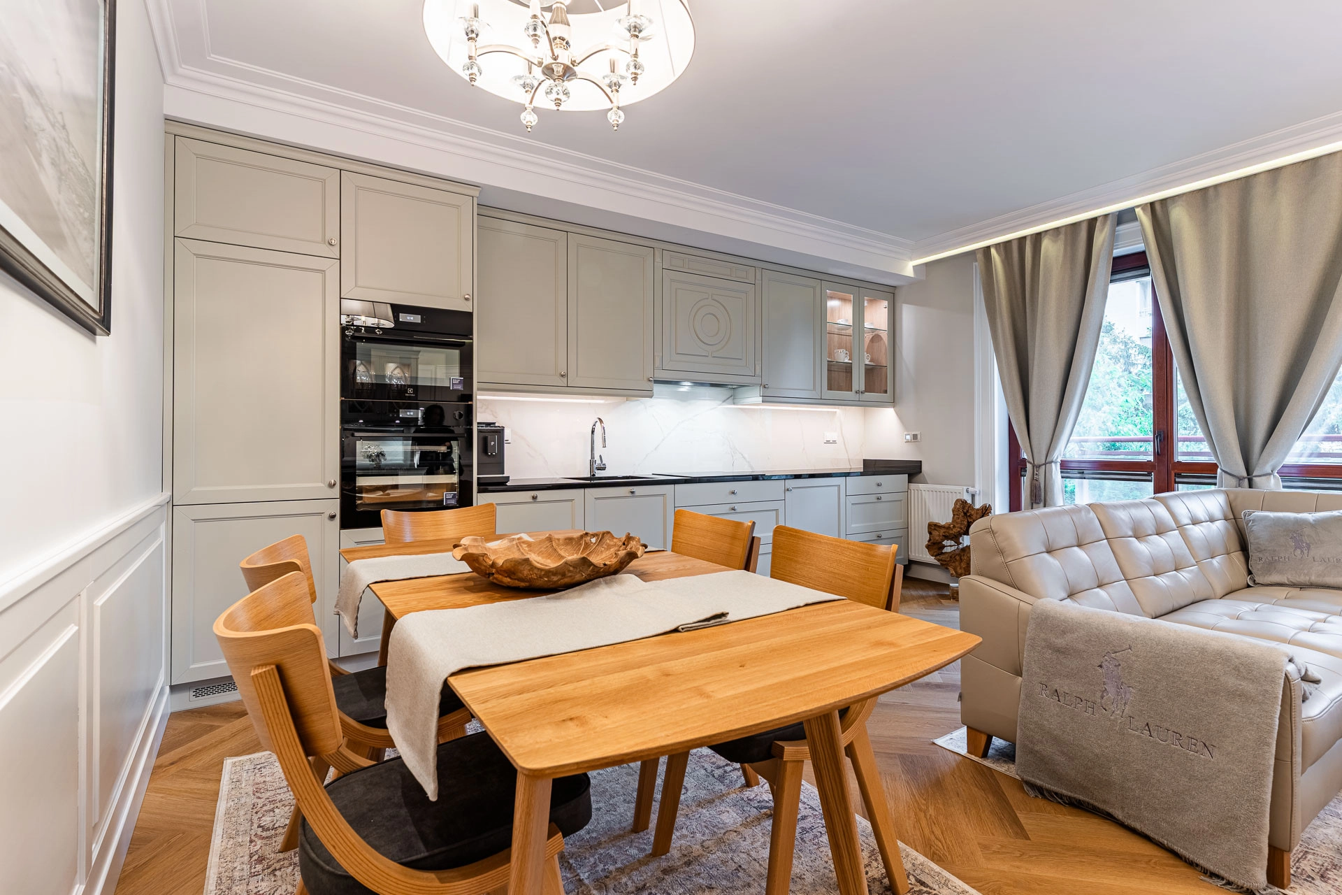 Okna wychodzą na cichy, zielony dziedziniec, co zapewnia prywatność i spokój. W latach 2024-2025 mieszkanie przeszło kompleksowy remont z wykorzystaniem materiałów najwyższej jakości. Cała stolarka meblowa (kuchnia, łazienka, garderoba, szafy w zabudowie) została wykonana na indywidualne zamówienie przez renomowaną firmę Kastol. Wnętrze utrzymane jest w eleganckim, spójnym stylu – z dbałością o każdy detal. Dodatkowym atutem jest klimatyzacja, gwarantująca komfort przez cały rok.