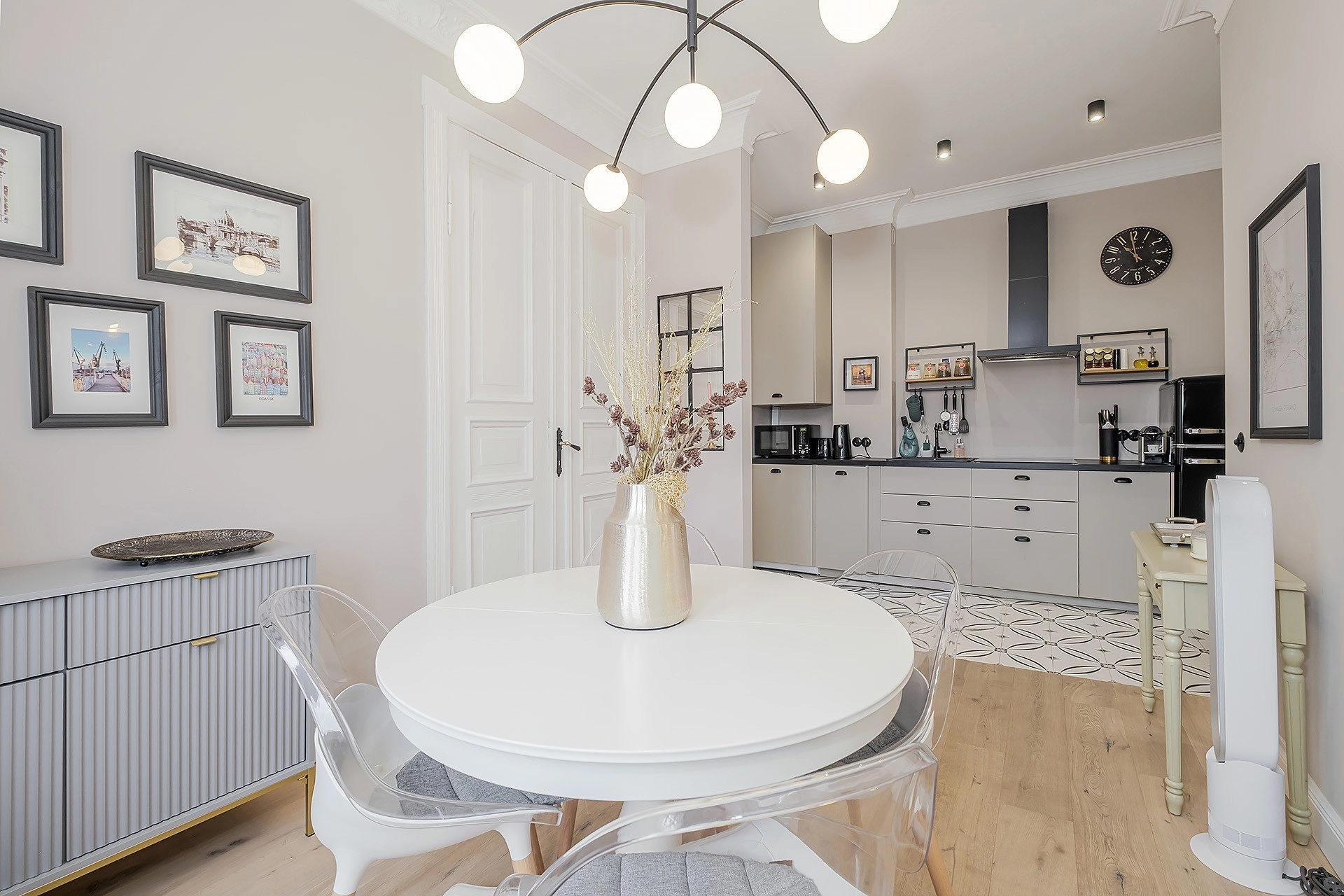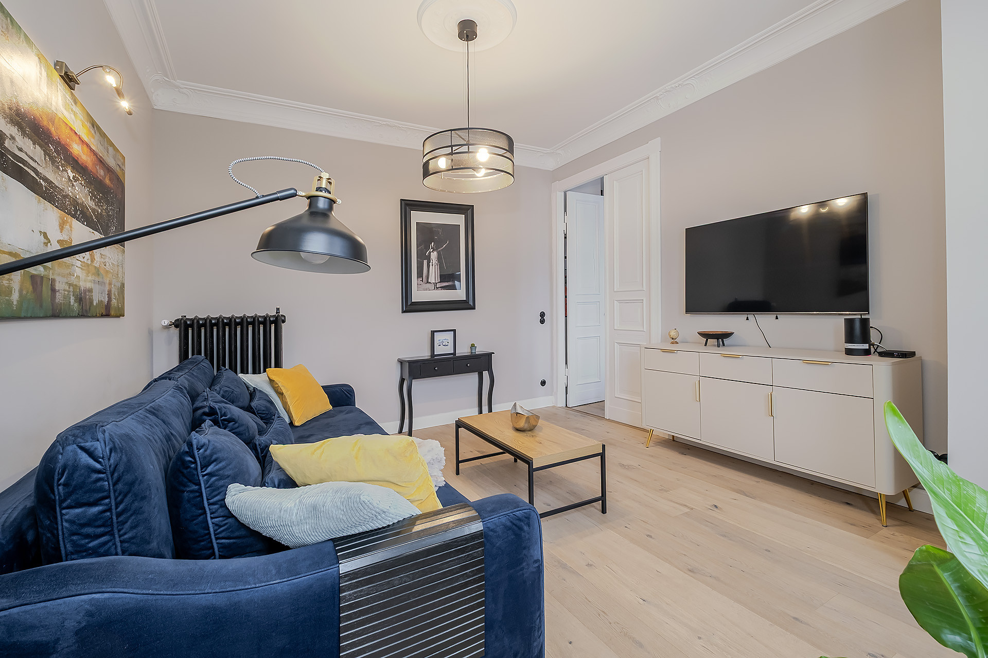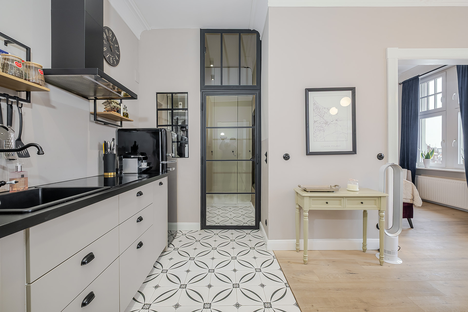 W grudniu 2024 roku zakończył się remont podczas którego mieszkanie przeszło pełną metamorfozę – od podstaw, z dbałością o każdy detal. Dębowa, olejowana i subtelnie przypalana deska, drewniane listwy przypodłogowe oraz włoskie kafle tworzą elegancką, harmonijną całość, nad którą unoszą się gipsowe sztukaterie. Wszystkie zabudowy wykonano na miarę przez stolarza, wnętrze wyposażono w nowy sprzęt, a nowoczesne instalacje i okrągłe włączniki oraz kontakty niemieckiej marki Berker podkreślają dopracowany charakter przestrzeni. Komfort ciszy zapewnia dodatkowe wygłuszenie ścian wełną mineralną, a historia kamienicy wybrzmiewa w odrestaurowanych, wysokich drewnianych drzwiach i pięknych żeliwnych grzejnikach- tworząc wnętrze z duszą, spokojne i ponadczasowe.