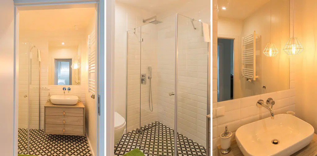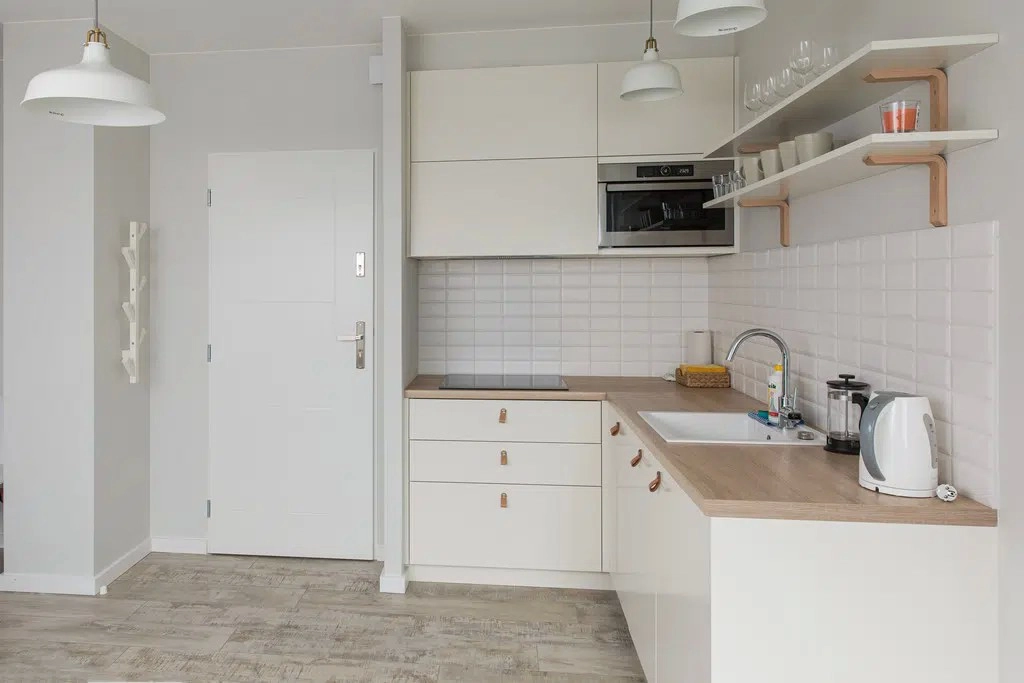 Apartament został całkowicie wyposażony- zabudowa kuchni wraz ze sprzętem AGD, zabudowana szafa w sypialni, łoże małżeńskie, w pełni wyposażona łazienka. Na podłodze znajduje się wysokiej jakości gres.