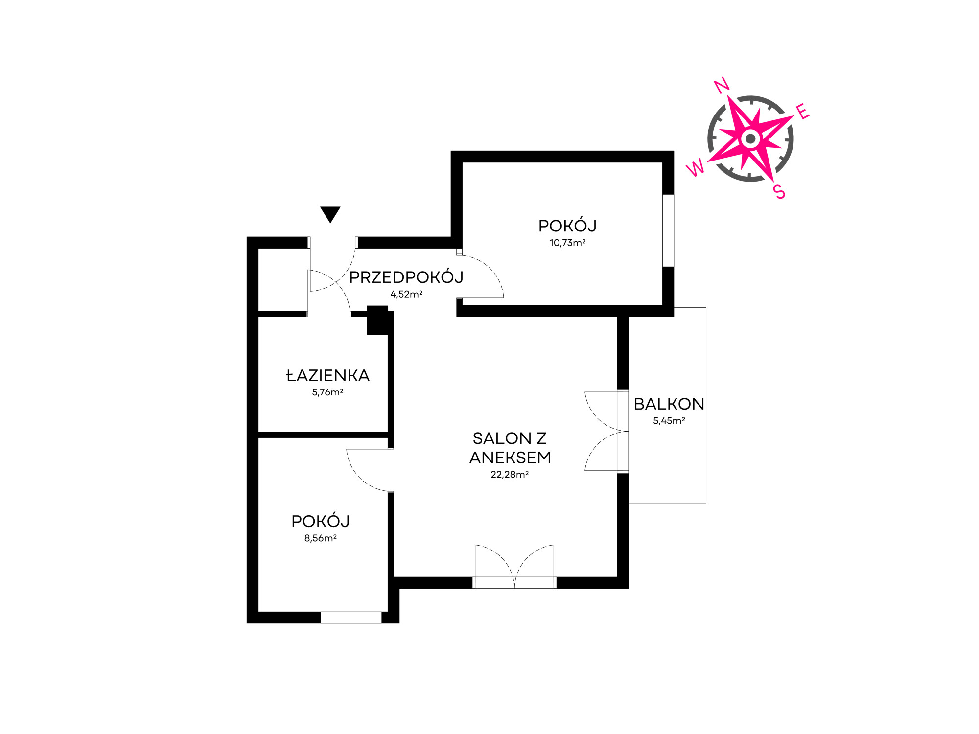 Balkon (5,45m2) oraz większa sypialnia ma wystawę wschodnią, natomiast okna w salonie oraz w mniejszej sypialni mają ekspozycje południową.