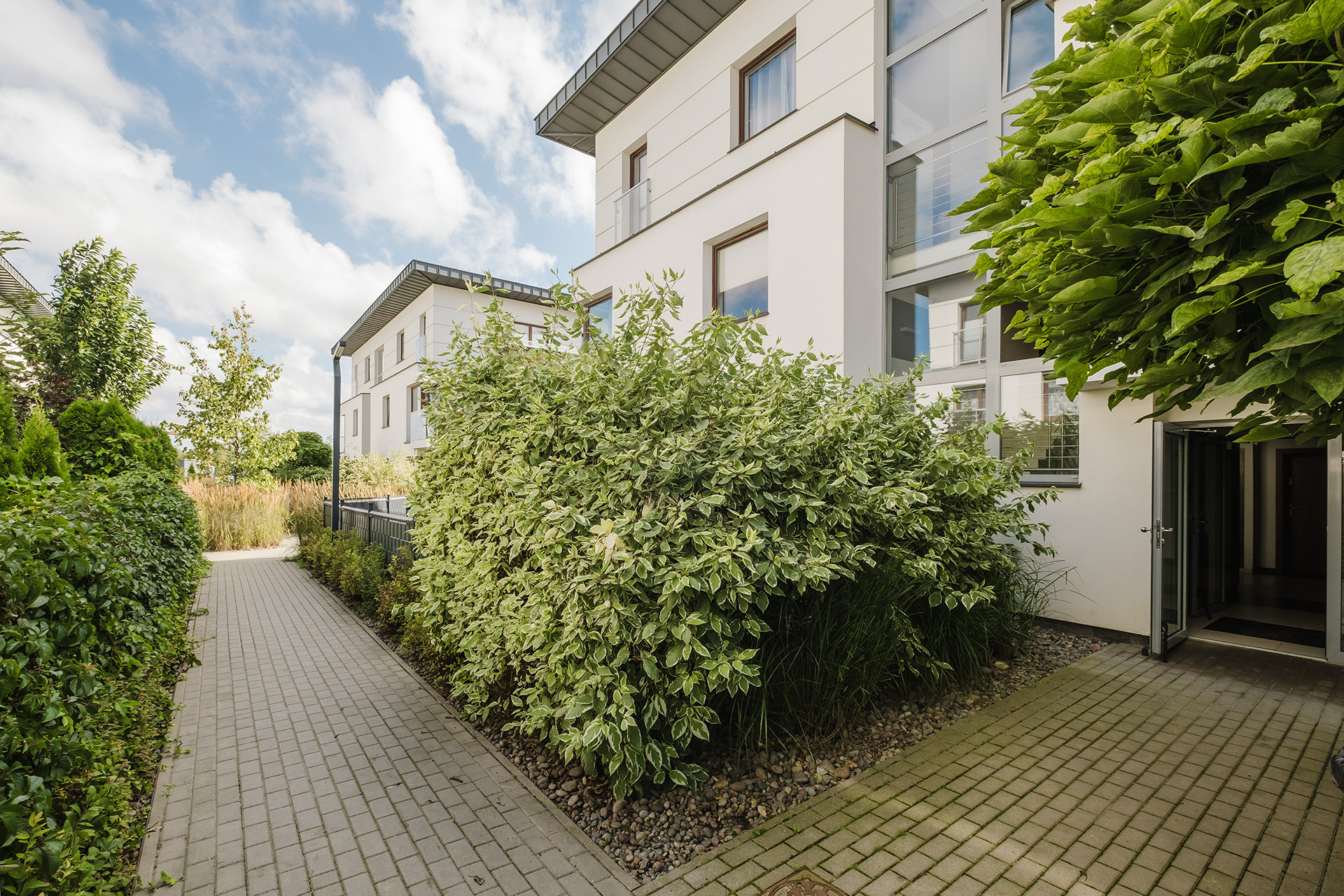 Teren osiedla jest w pełni ogrodzony, oświetlony i zabezpieczony bramą wjazdową. Znajduję się na nim plac zabaw. Wejście do klatki prowadzi przez ładnie zaaranżowaną zielenią dróżkę. Przed osiedlem znajduję się wiele miejsc ogólnodostępnych.