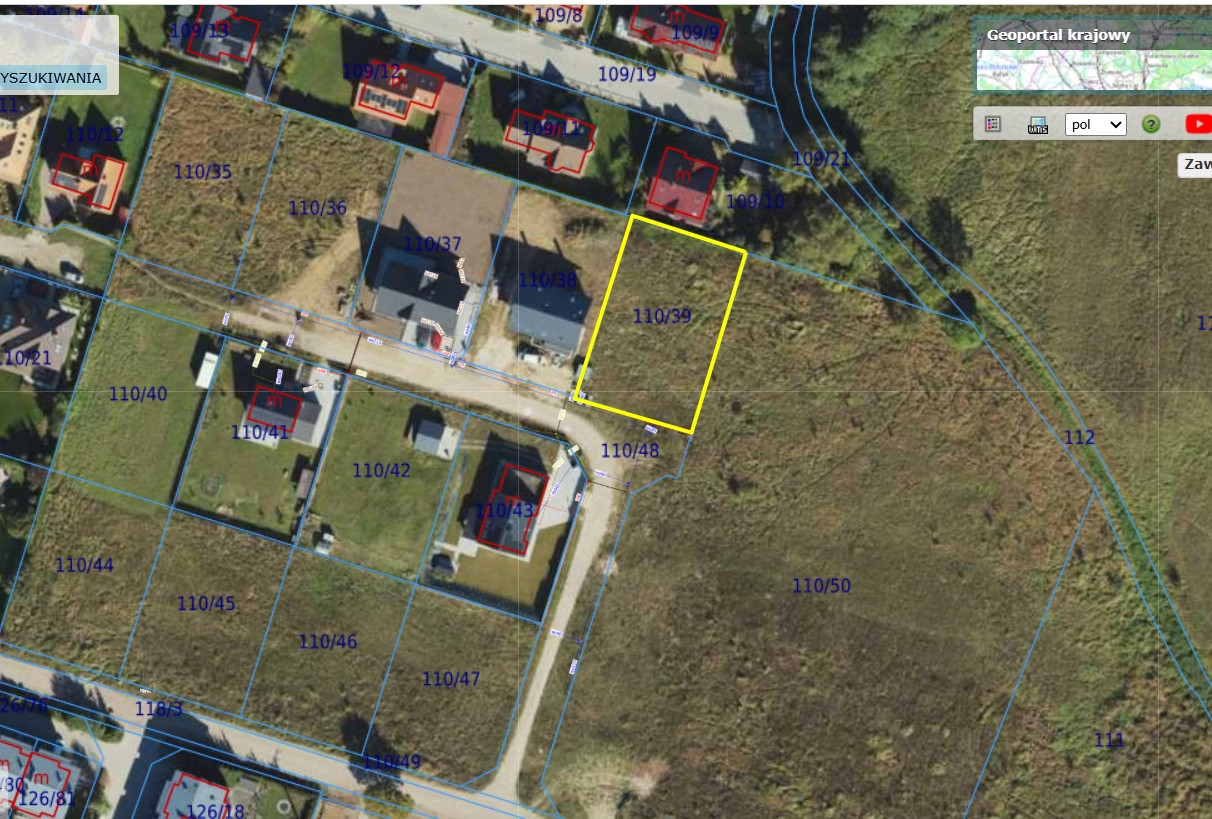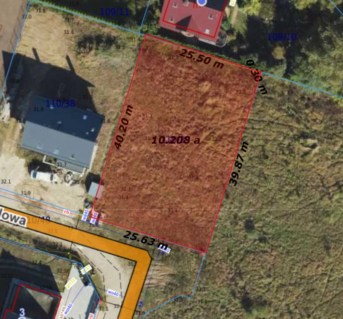 Działka budowlana o powierzchni 1019m2 przy wymiarach 40×25. Jest płaska i prostokątna. Na działce znajduję się skrzynka energetyczna oraz hydrant. Gaz jest w drodze tuż przed działką a kanalizacja jest w odległości 100 m od działki.