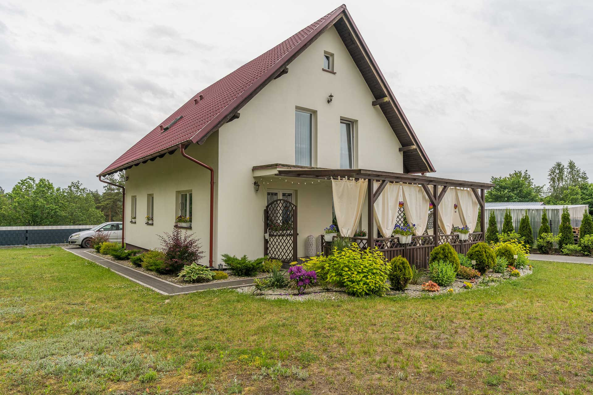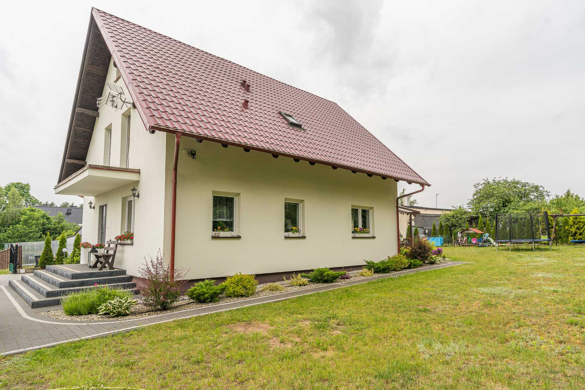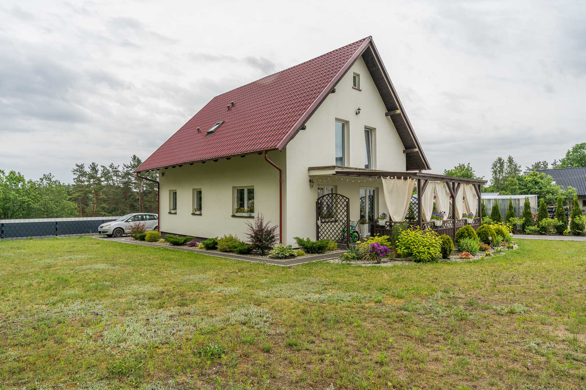Przestronny dom jednorodzinny gotowy do zamieszkania, wybudowany według projektu „Dom w prymulkach 2”. Dom wolnostojący o powierzchni użytkowej 124 m² (180 m2 powierzchni całkowitej), wybudowany w 2016 roku na działce o powierzchni 1113 m². Działka jest w pełni zagospodarowana, obsadzona roślinami i daje duży potencjał do dalszej aranżacji. Nieruchomość jest ogrodzona metalowym płotem, a podjazdy, taras i schody zostały wyłożone kostką Semerlock (200 m²). Na działce znajdują się także dwa blaszane garaże o wymiarach 3×5 m. Dom ogrzewany jest piecem na pellet drzewny. Budynek został wybudowany z pustaków technologią tradycyjną. Dach dwuspadowy w konstrukcji drewnianej pokryty blachodachówką. Okna PCV. Mury ocieplone styropianem o grubości 12 cm, dach ocieplony wełną mineralną.