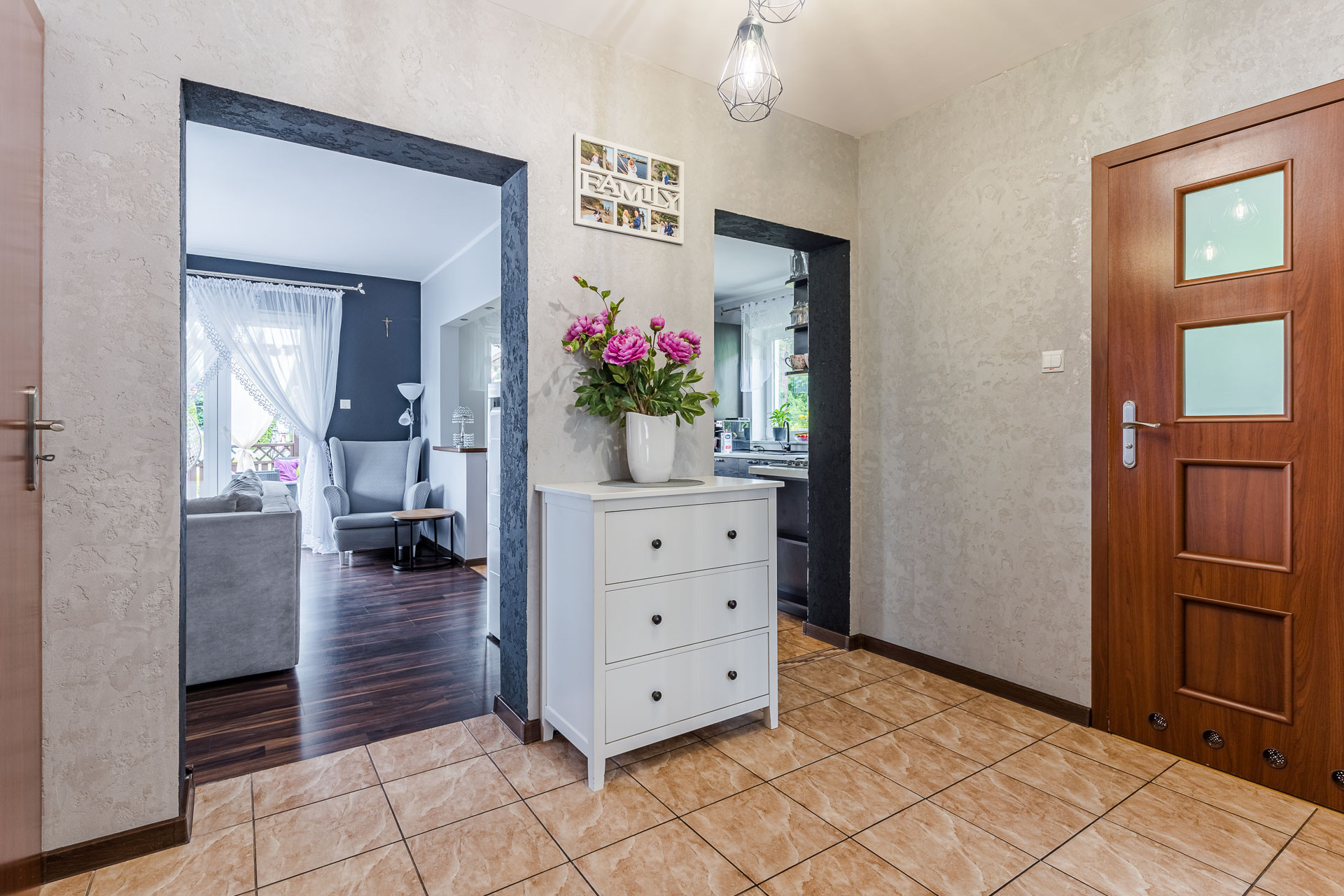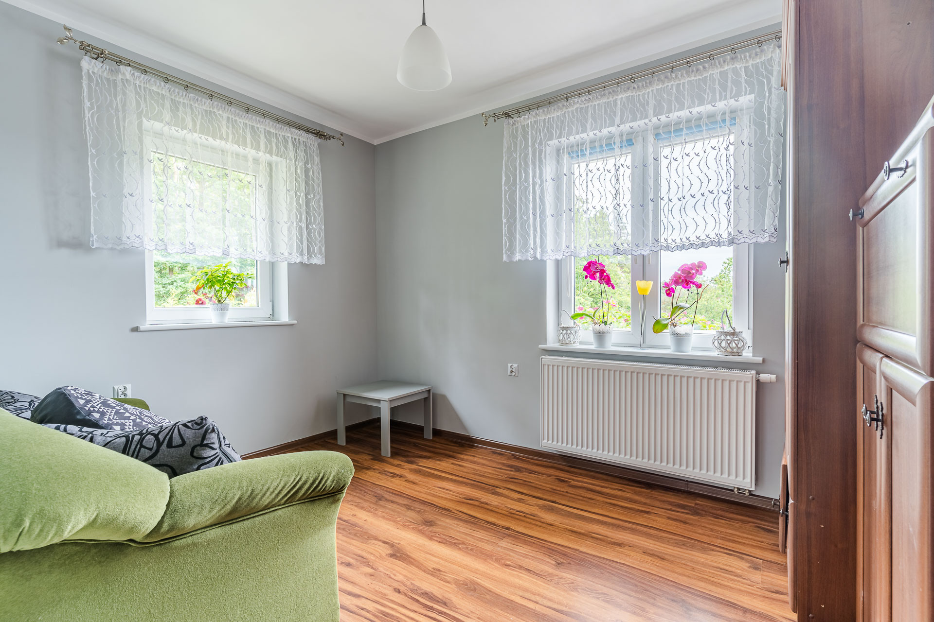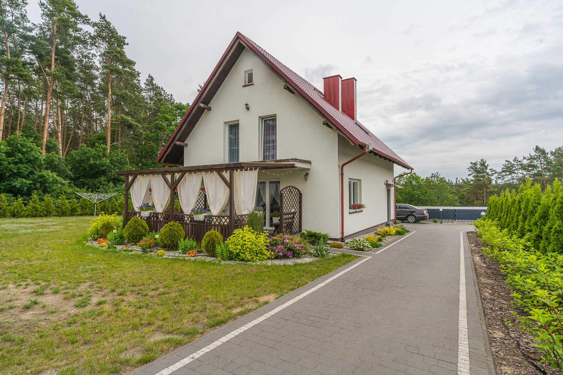 Przestronny dom jednorodzinny gotowy do zamieszkania, wybudowany według projektu „Dom w prymulkach 2”. Dom wolnostojący o powierzchni użytkowej 124 m² (180 m2 powierzchni całkowitej), wybudowany w 2016 roku na działce o powierzchni 1113 m². Działka jest w pełni zagospodarowana, obsadzona roślinami i daje duży potencjał do dalszej aranżacji. Nieruchomość jest ogrodzona metalowym płotem, a podjazdy, taras i schody zostały wyłożone kostką Semerlock (200 m²). Na działce znajdują się także dwa blaszane garaże o wymiarach 3×5 m. Dom ogrzewany jest piecem na pellet drzewny. Budynek został wybudowany z pustaków technologią tradycyjną. Dach dwuspadowy w konstrukcji drewnianej pokryty blachodachówką. Okna PCV. Mury ocieplone styropianem o grubości 12 cm, dach ocieplony wełną mineralną.