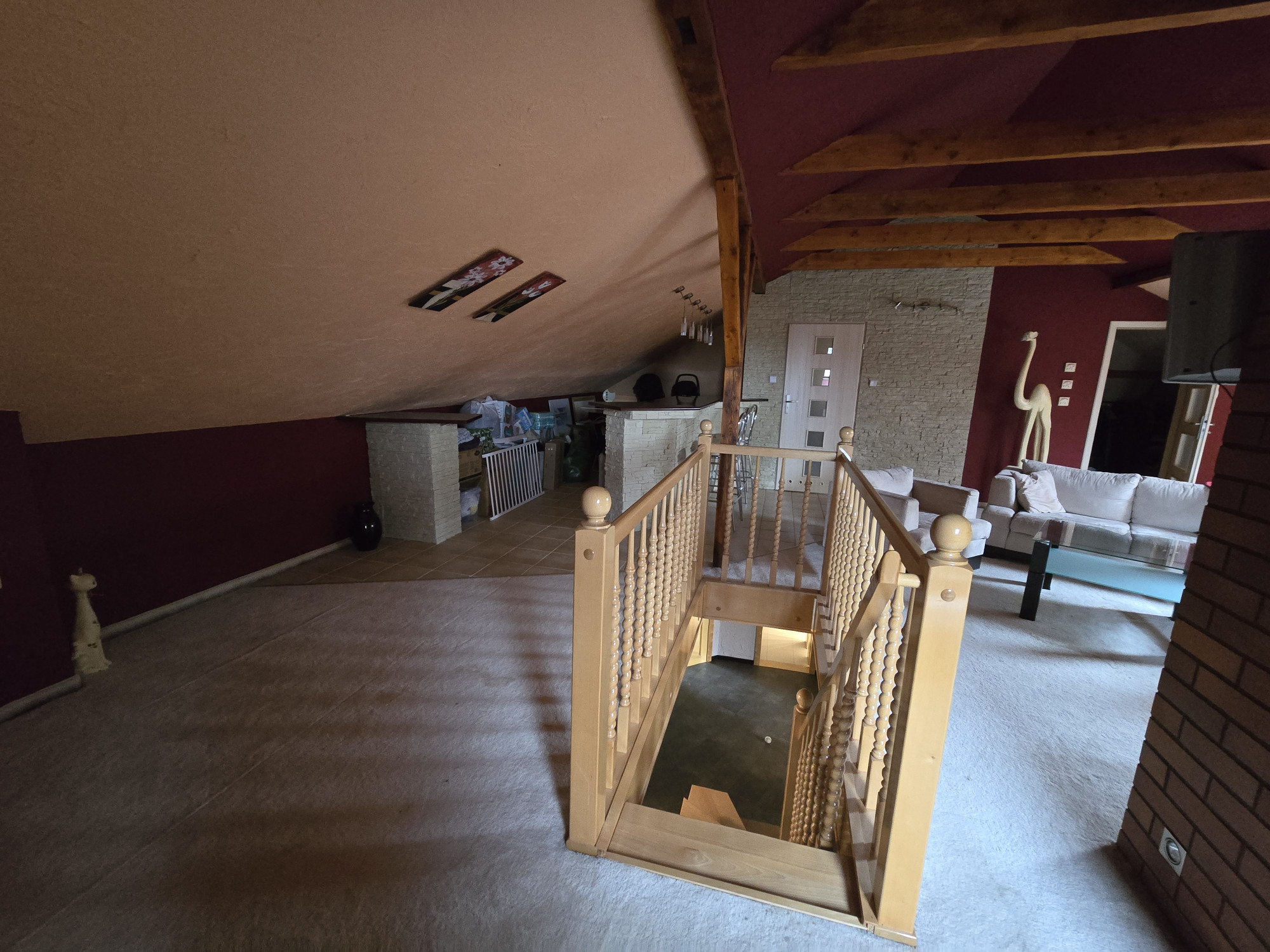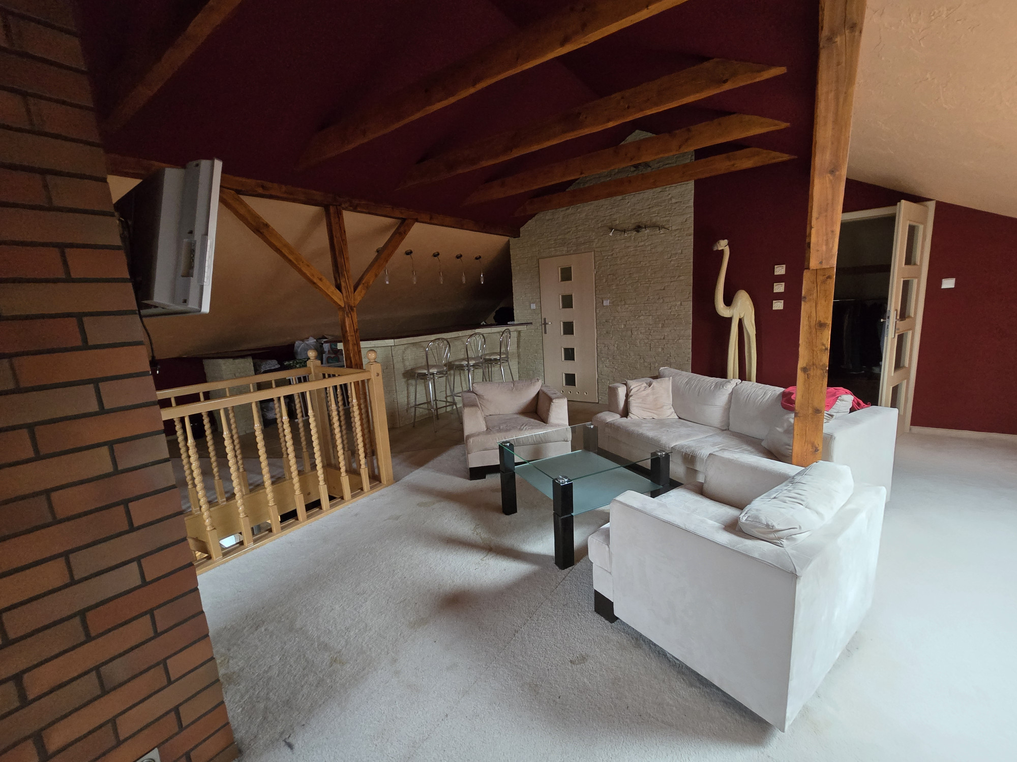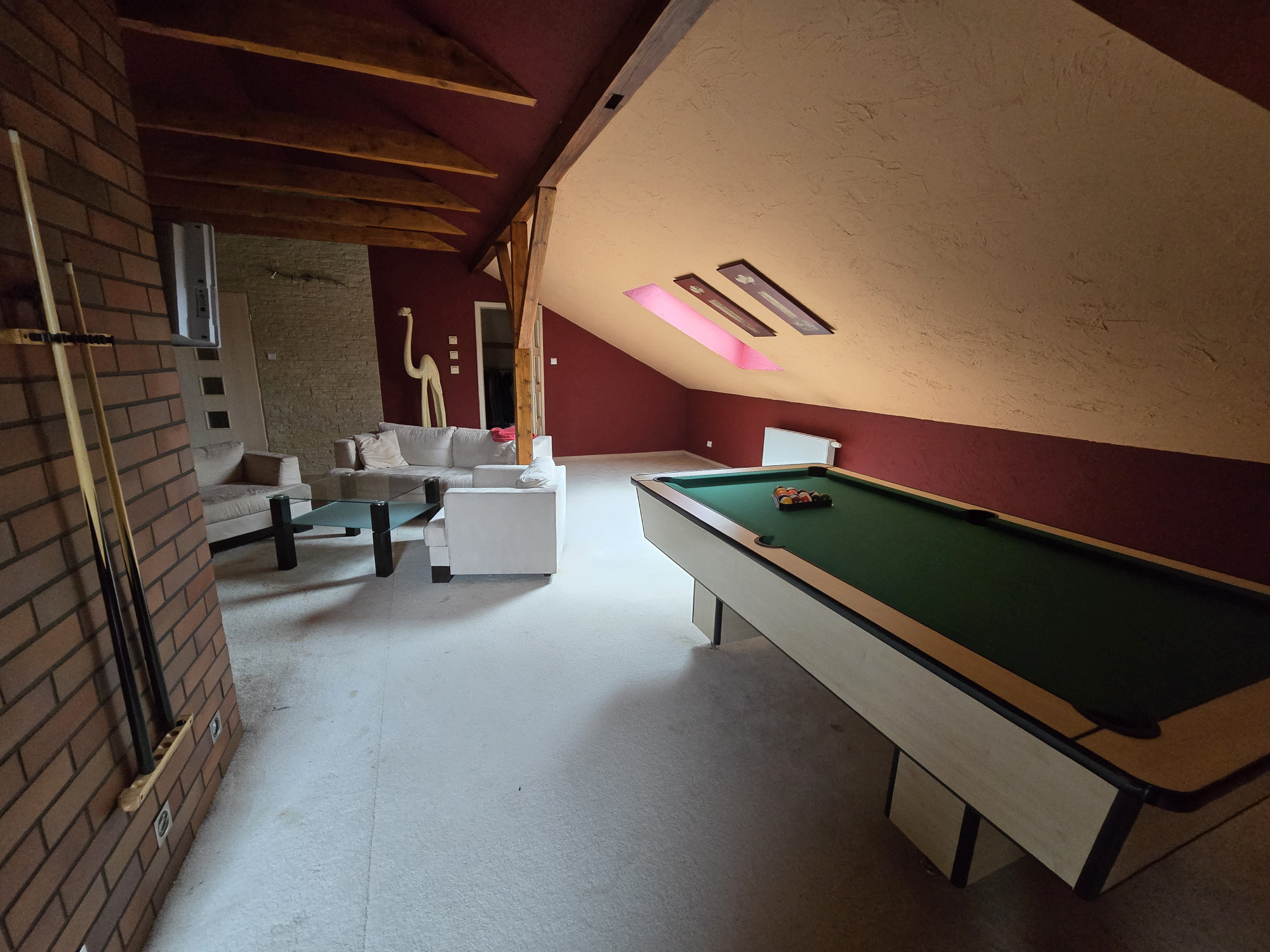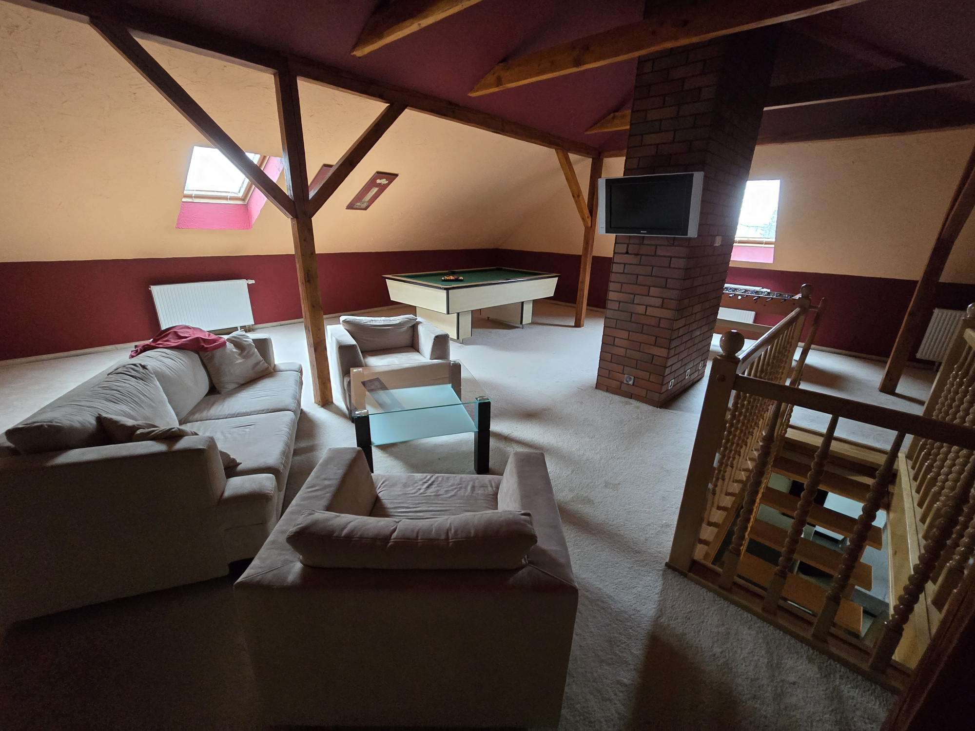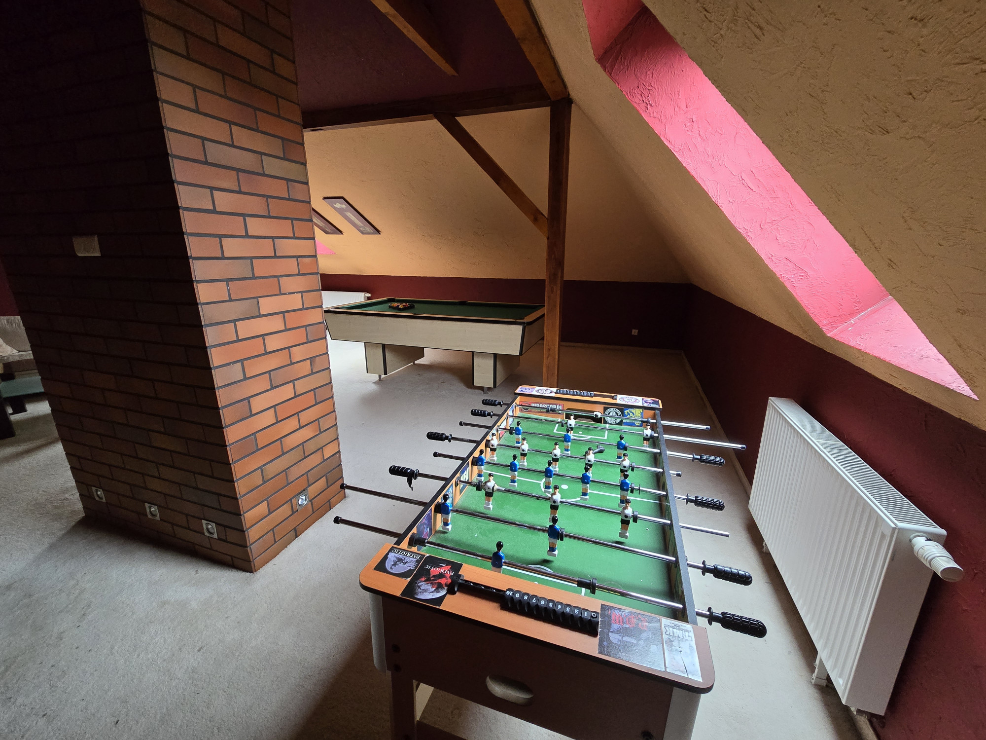 Piętro domu to otwarta przestrzeń gdzie znajdziemy m.in. stół do bilardu, strefę kinową, bar. Na piętrze znajduje się również łazienka.