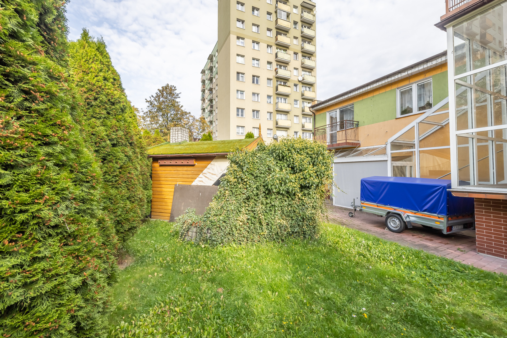 Budynek z 6 lokalami handlowo-usługowymi o łącznej powierzchni użytkowej ok.600m2, będących przedmiotem najmu oraz część mieszkalna o powierzchni użytkowej ok.260m2, obejmującej dwa mieszkania, garaż dwustanowiskowy, część gospodarczo-techniczną i rekreacyjną.
