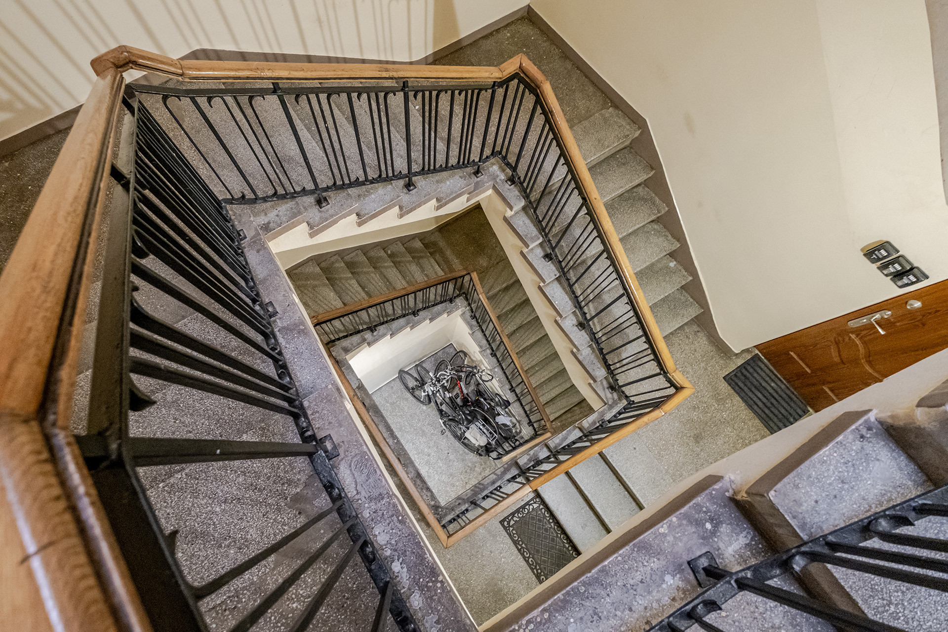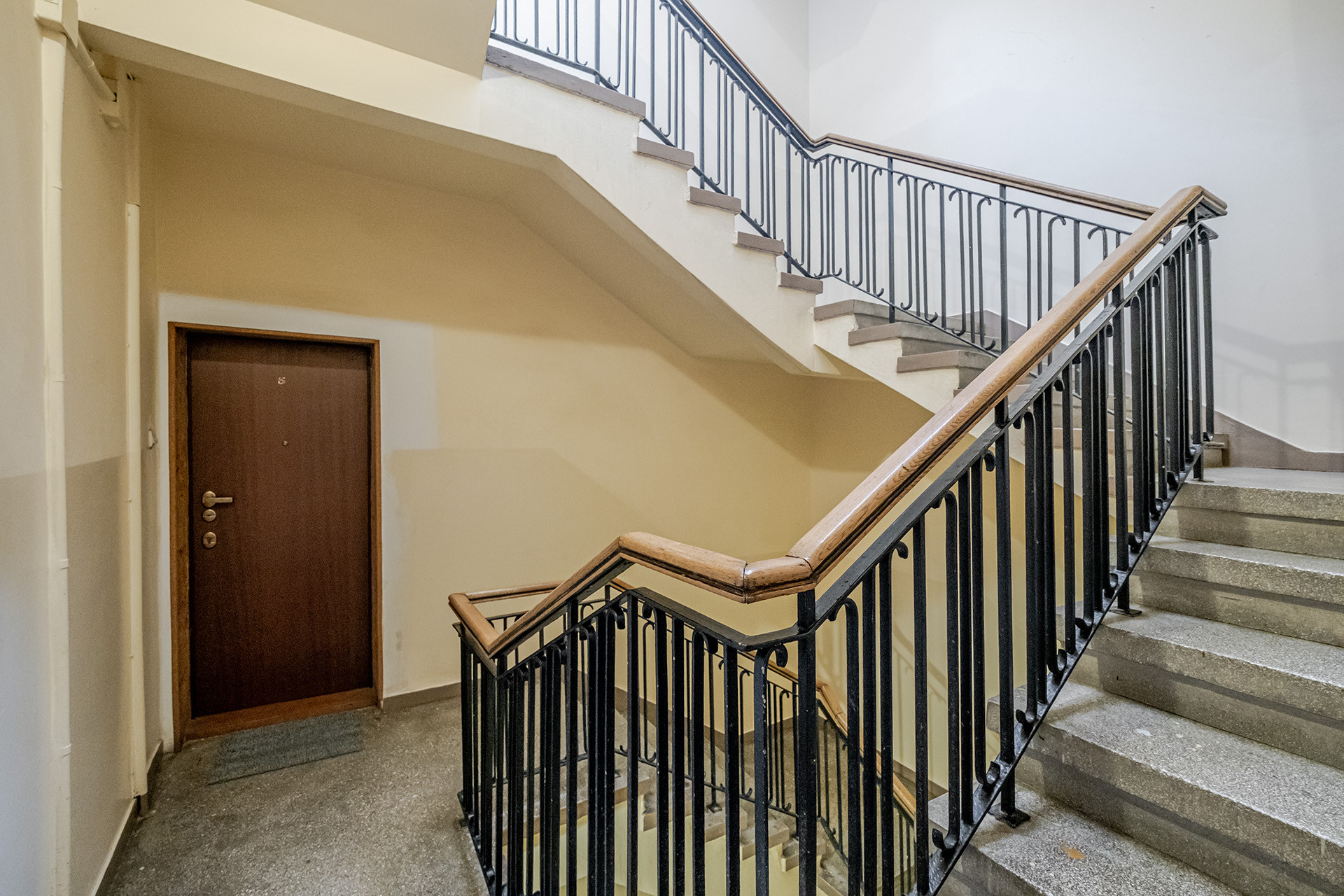 Mieszkanie mieści się na 2,5 piętrze (kamienica ma półpiętra) w 4-piętrowej kamienicy z 1960 roku, którą wykonano z cegieł, a na dachu ułożono dachówkę ceramiczną. Ogólny stan całej nieruchomości należy uznać za bardzo dobry. Charakterystyczna, odważna elewacja, bardzo szeroka, monitorowana, odnowiona klatka schodowa i wyremontowany dach, to tylko niektóre elementy potwierdzające wyjątkowość budynku. Wejście do klatki schodowej zabezpieczone jest domofonem. Jest ona zadbana i czysta.