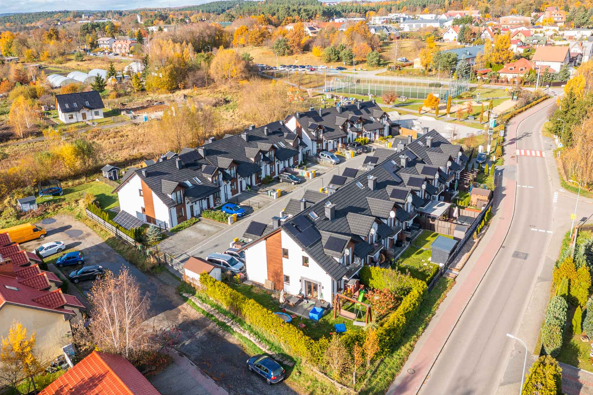 Dom znajduje się w spokojnej i zielonej części Straszyna, przy ul. Kwiatowej. W okolicy znajdują się szkoła, boisko, skatepark, ścieżki rowerowe, jezioro i las – wszystko, czego potrzebujesz, by cieszyć się aktywnym i bezpiecznym życiem rodzinnym.
