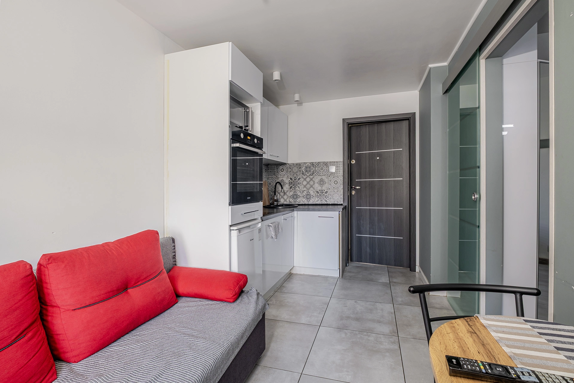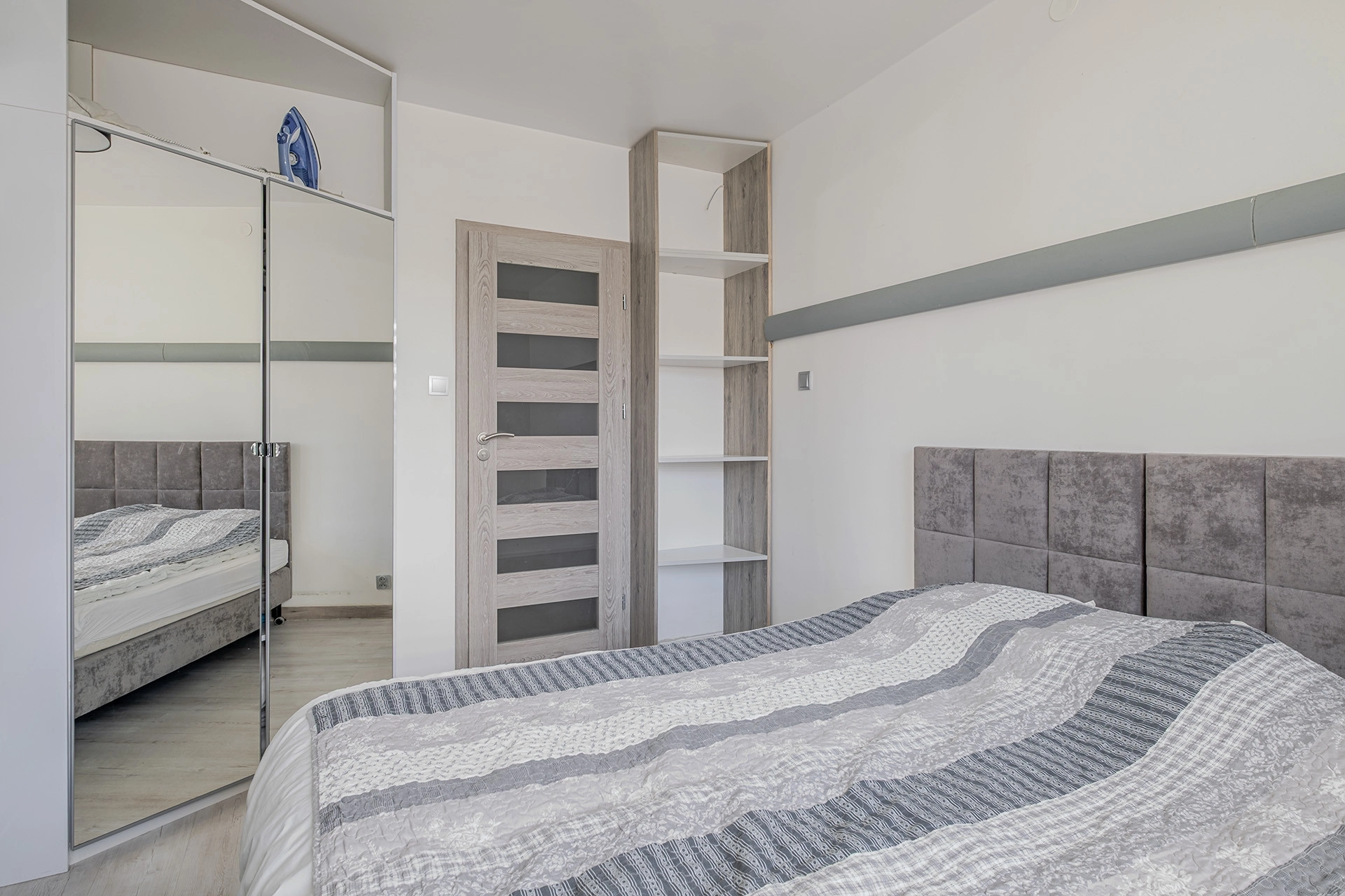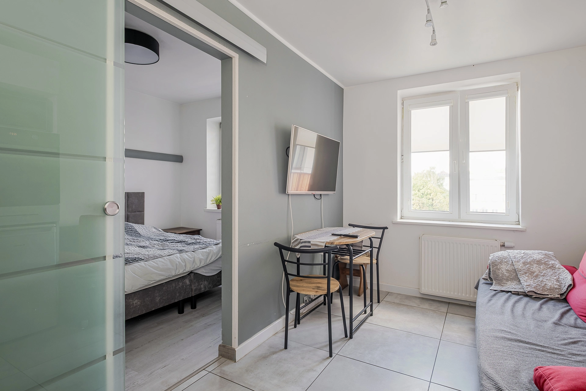 Mieszkanie składa się z niewielkiego, ale funkcjonalnego salonu z aneksem kuchennym, oddzielnej sypialni oraz łazienki z prysznicem. Przestrzeń została urządzona w sposób wygodny i praktyczny, dzięki czemu idealnie sprawdzi się dla jednej lub dwóch osób.