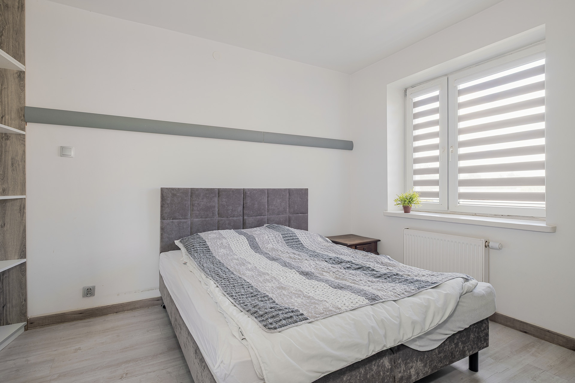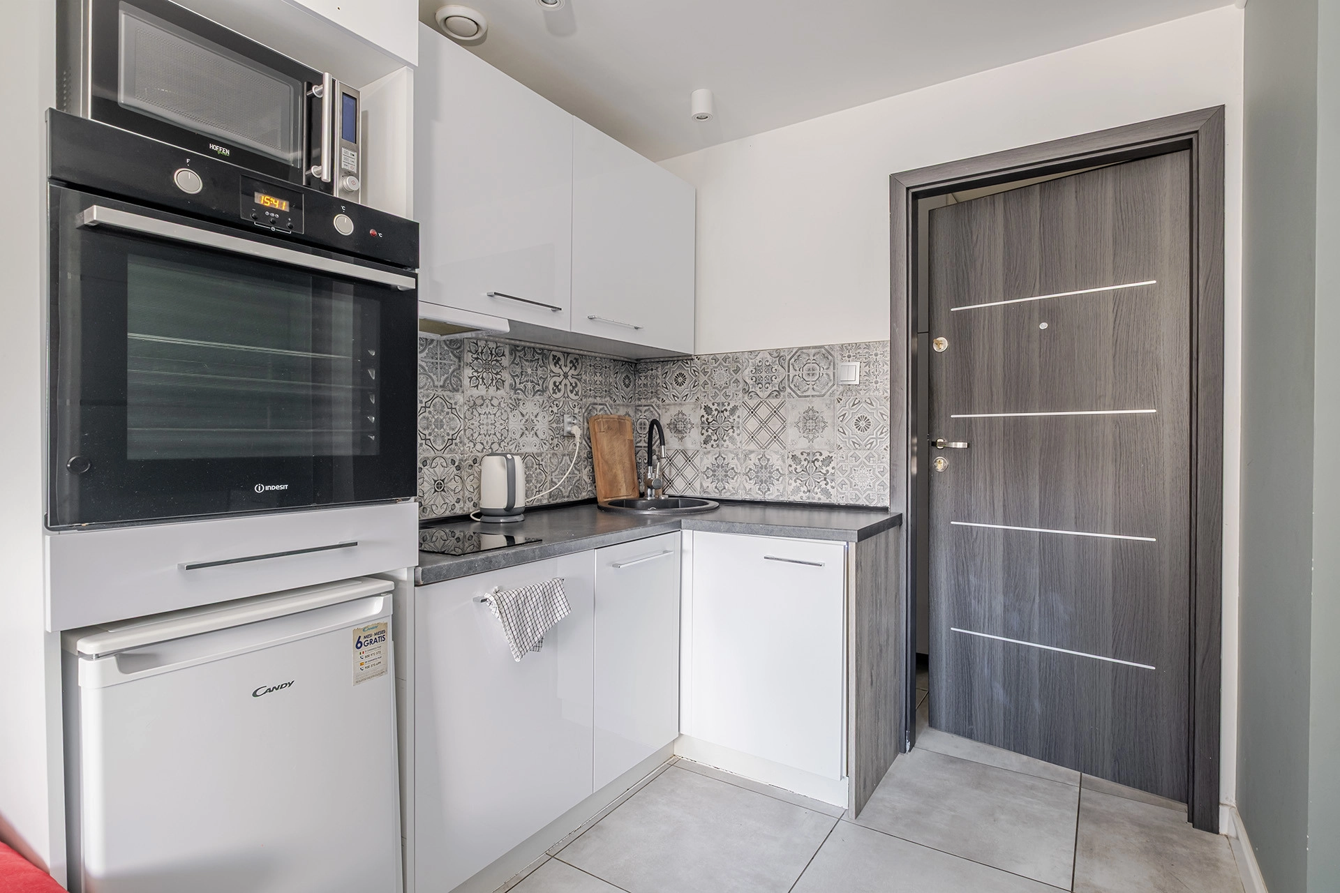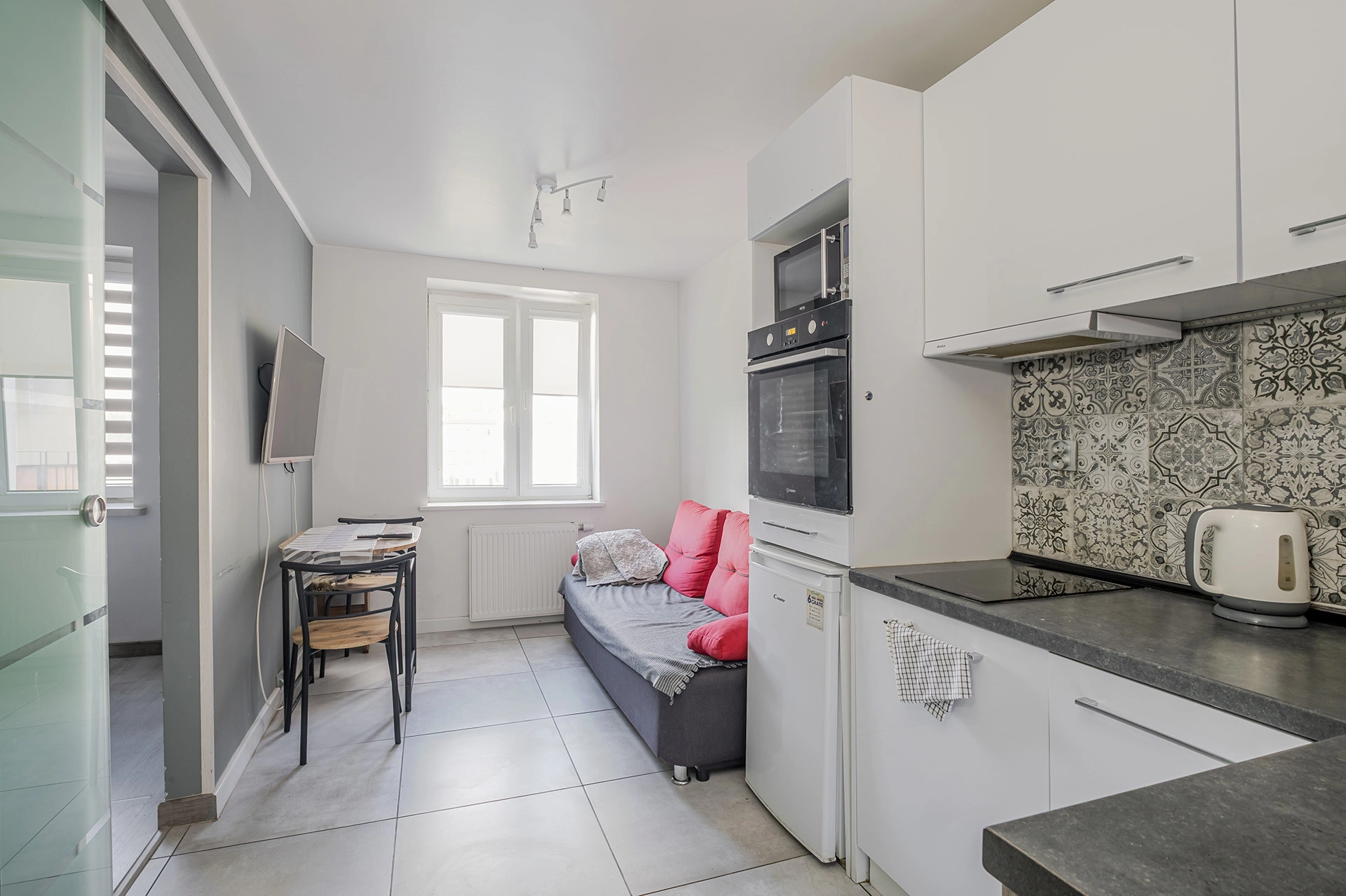 Mieszkanie składa się z niewielkiego, ale funkcjonalnego salonu z aneksem kuchennym, oddzielnej sypialni oraz łazienki z prysznicem. Przestrzeń została urządzona w sposób wygodny i praktyczny, dzięki czemu idealnie sprawdzi się dla jednej lub dwóch osób.