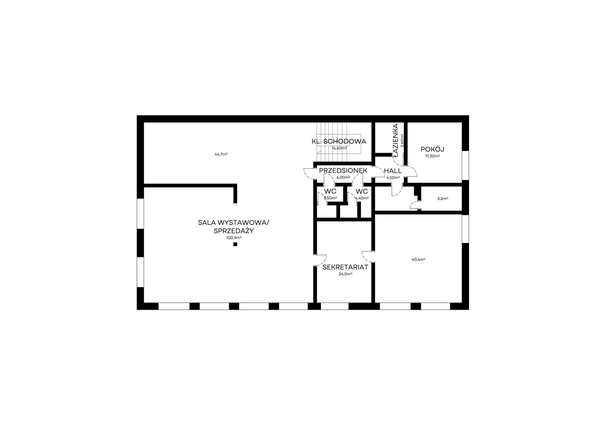 Lokal o powierzchni 252 m2 znajduje się na I piętrze budynku i składa się z częsci open space o powierzchni 152m2 i 3 pomieszczeń biurowych (40m2, 24m2 i 17m2), kuchni oraz łazienek.