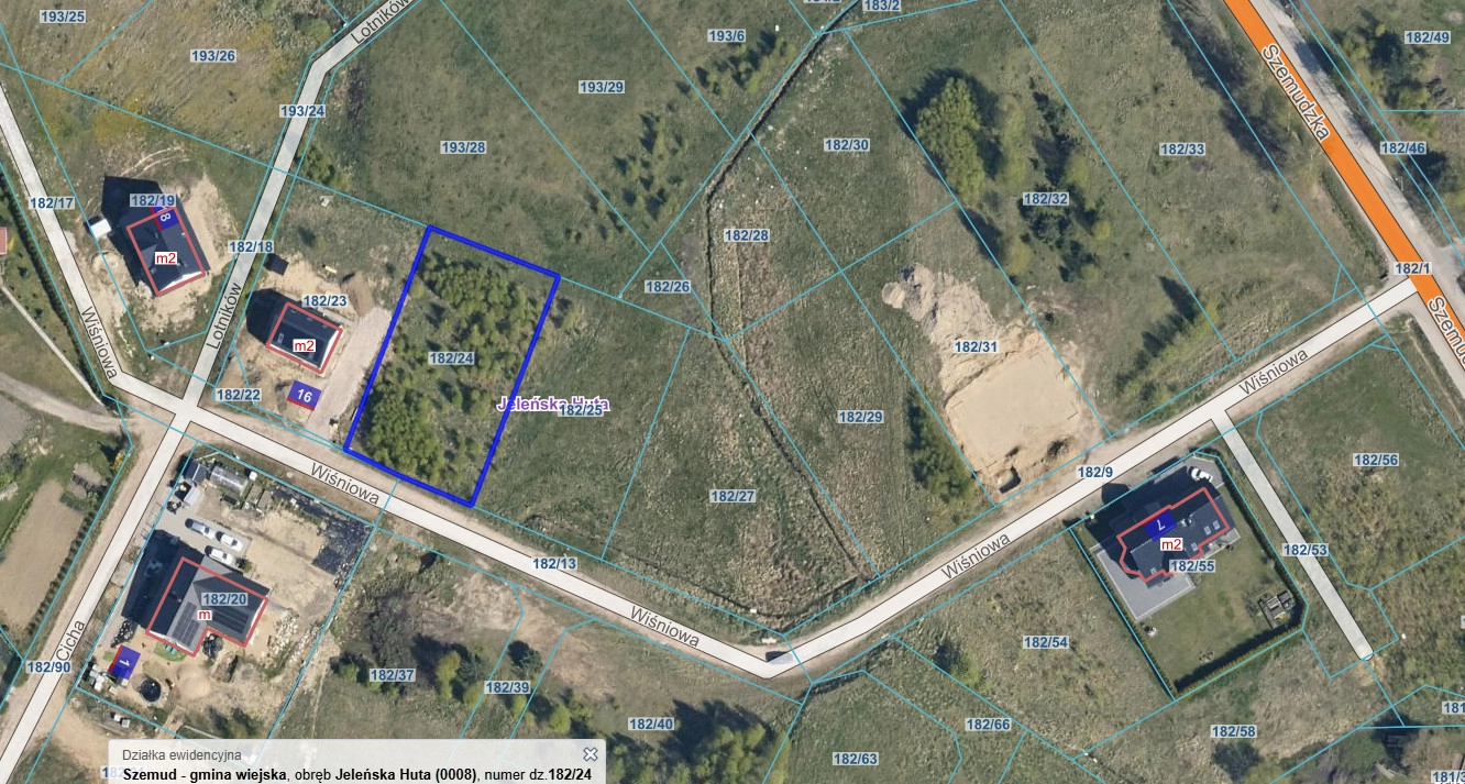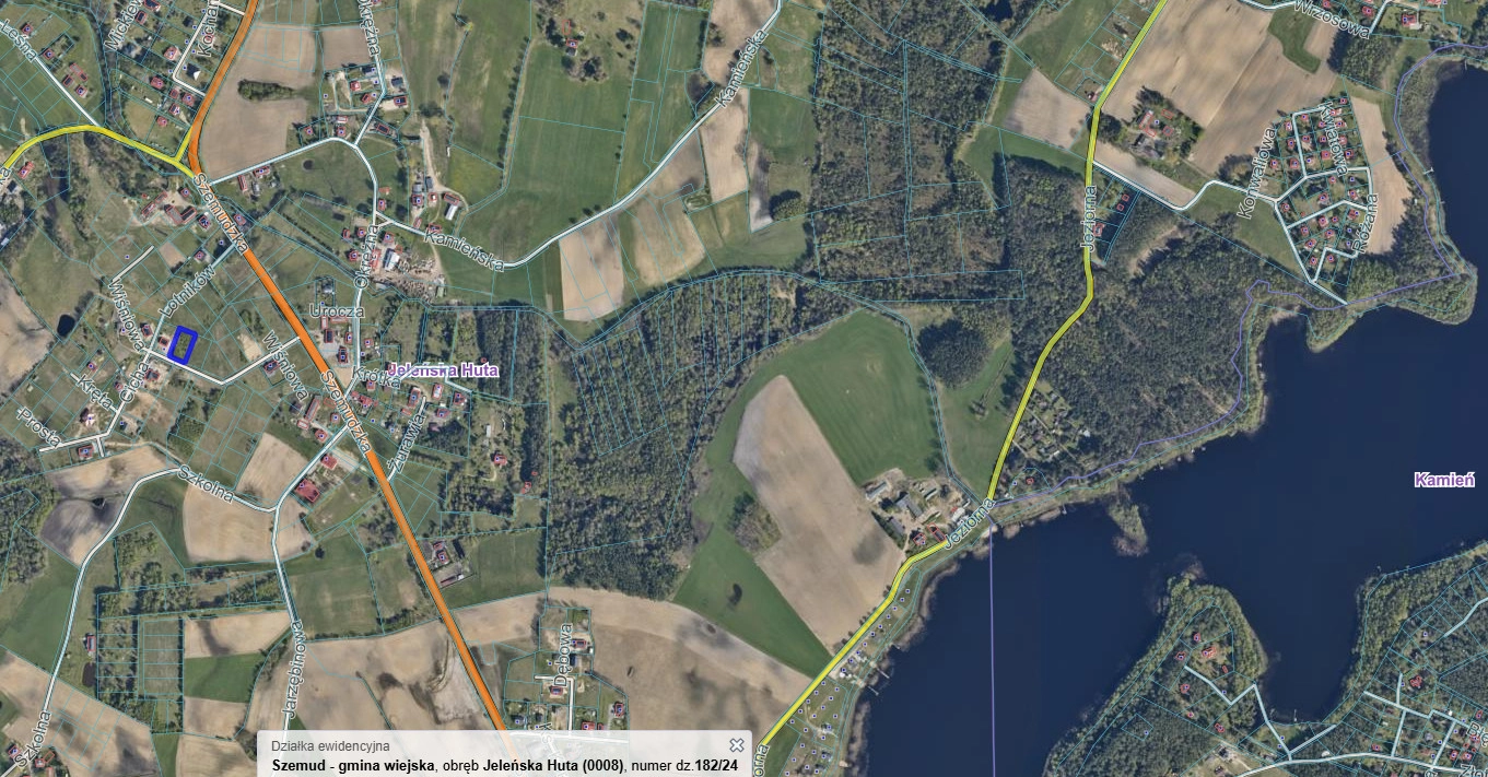 Działka położona jest w Jeleńskiej Hucie 7 km od zjazdu z trasy Kaszubskiej w Gminie Szemud w powiecie Wejherowskim. Ok 200 m drogą gruntową utwardzoną dojeżdżamy do drogi asfaltowej -ul. Szemudzkiej. W pobliżu  lasy i jeziora , ok 2 km do Jeziora Wysoka i kąpieliska w Kamieniu. Z drugiej strony w podobnej odległości Jezioro Otalżyno. Najbliższa szkoła podstawowa w Szemudzie ok 4,5km. Przystanek autobusowy w Jeleńskiej Hucie -5min pieszo.