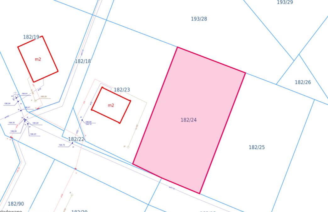 Kształt działki zbliżony do prostokątna, a sama działka jest płaska. Sąsiednie działki częściowo zabudowane budynkami jednorodzinnymi.