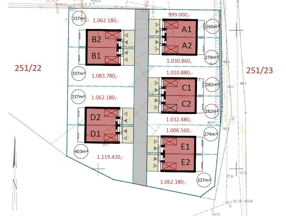 Łącznie 10 domów w zabudowie bliźniaczej z garażami w bryle budynku.