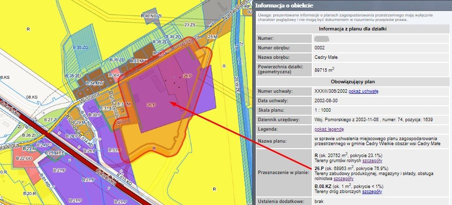 Przeznaczenie w MPZP – symbol 26.P – Zgodnie z miejscowym planem zagospodarowania przestrzennego (Uchwała Gminy Cedry Wielkie):
