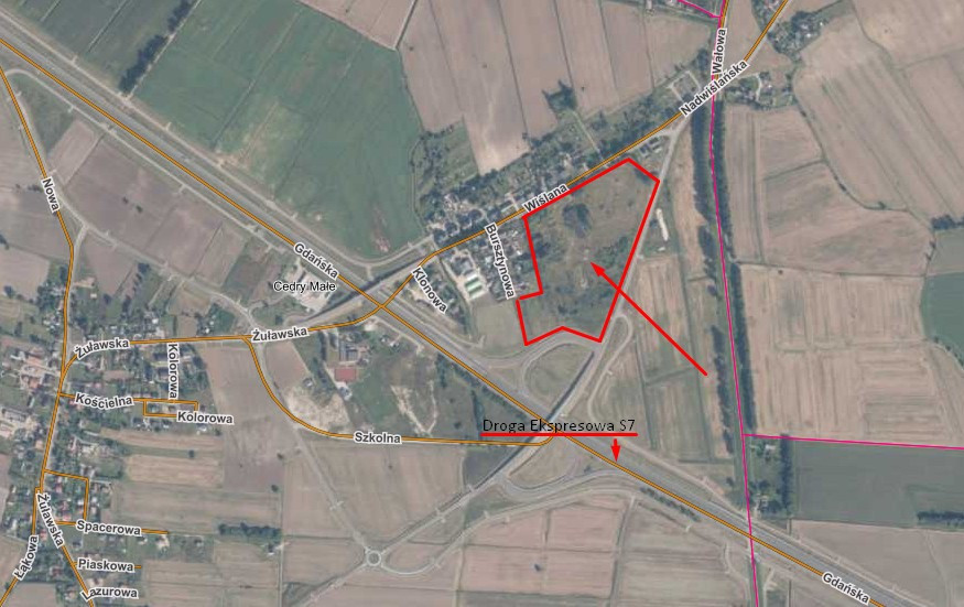 LOKALIZACJA: Działka inwestycyjna położona bezpośrednio przy pętli zjazdowej z drogi krajowej S7, na wysokości miejscowości Cedry Małe, gmina Cedry Wielkie. Doskonała ekspozycja, bardzo dobry dojazd oraz strategiczne położenie pod działalność produkcyjną, magazynową lub logistyczną.