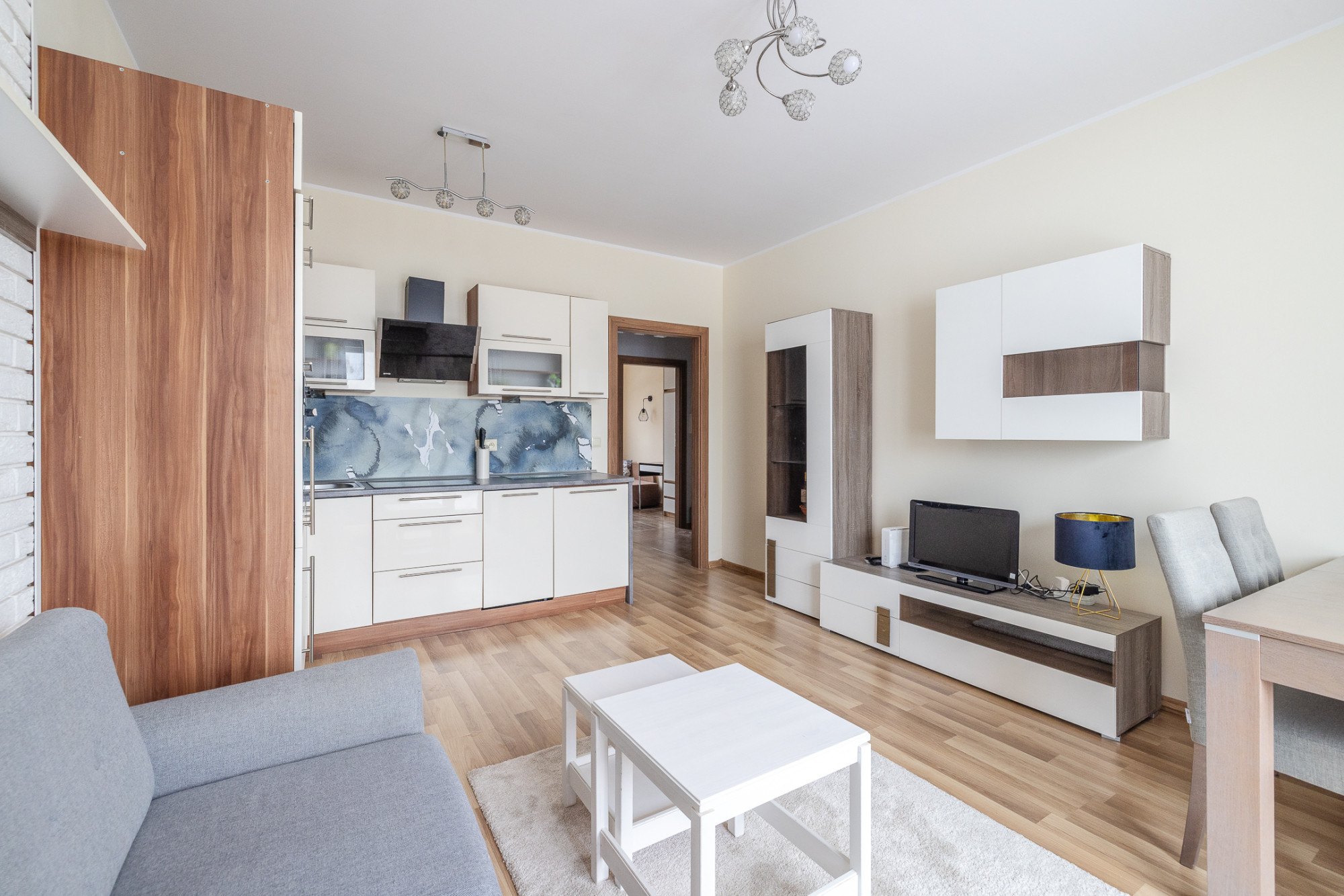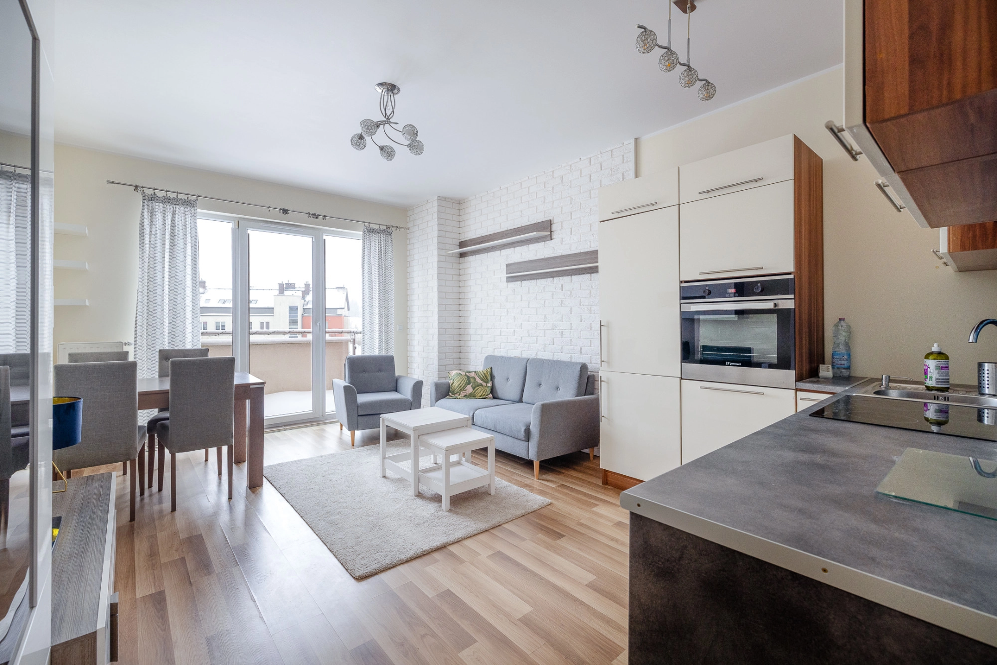 – salon z aneksem kuchennym (19,7 m²) – ekspozycja południowa zapewniająca bardzo dobre doświetlenie wnętrza