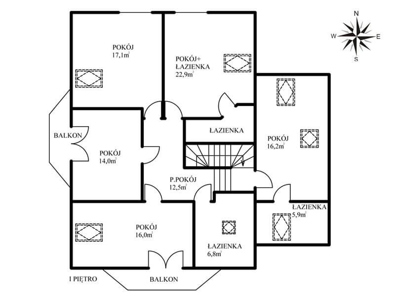 Piętro to 5 przestronnych pokoi oraz dwie łazienki ( jedna z bezpośrednim wejściem z sypialni )