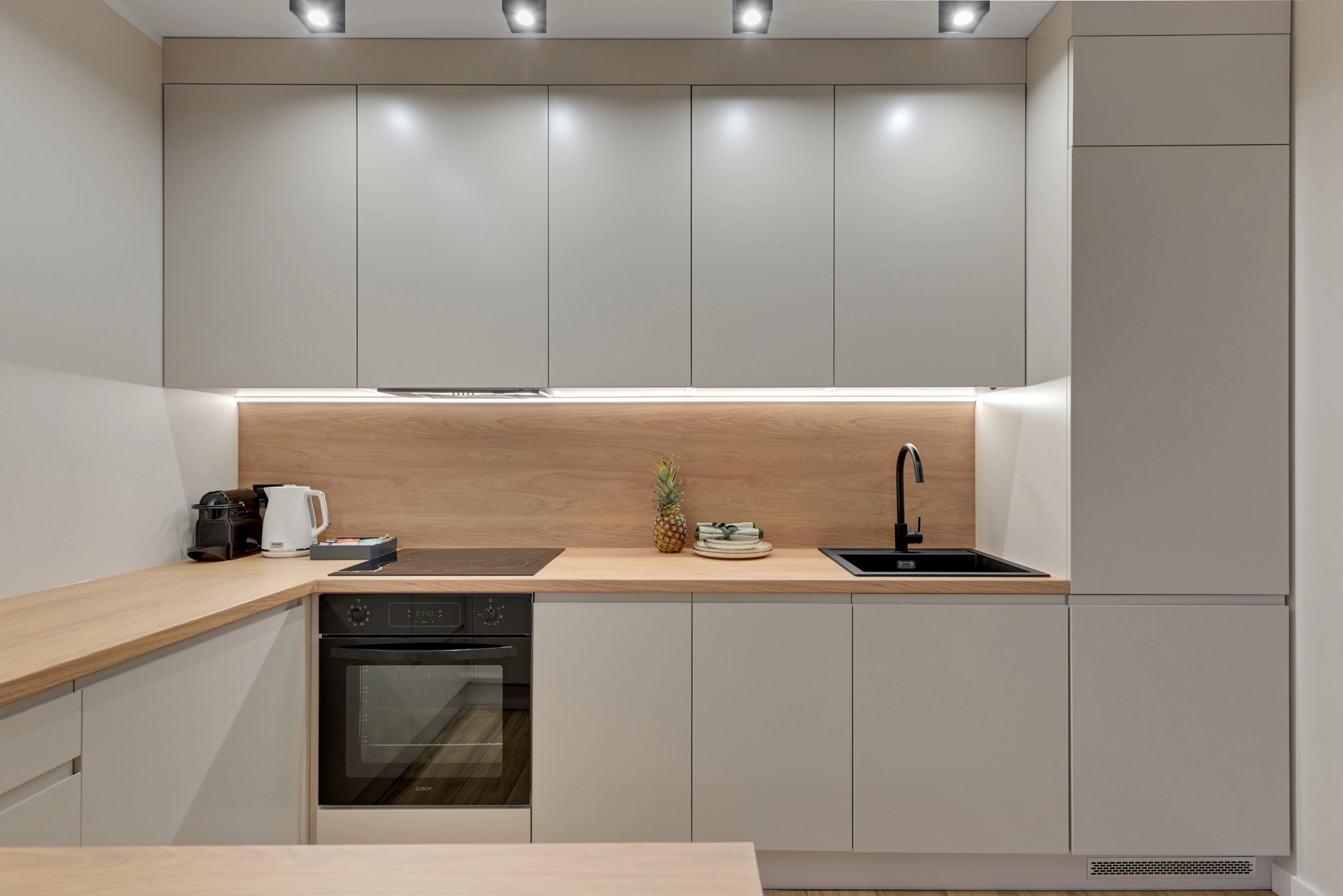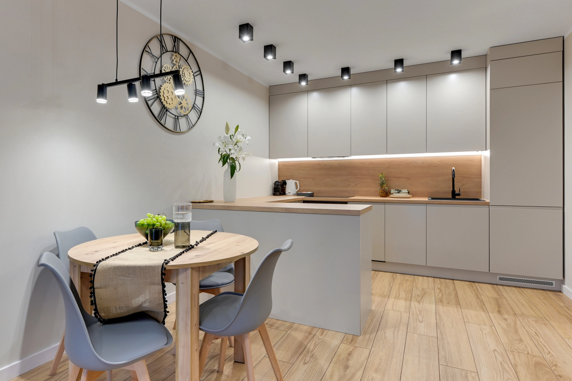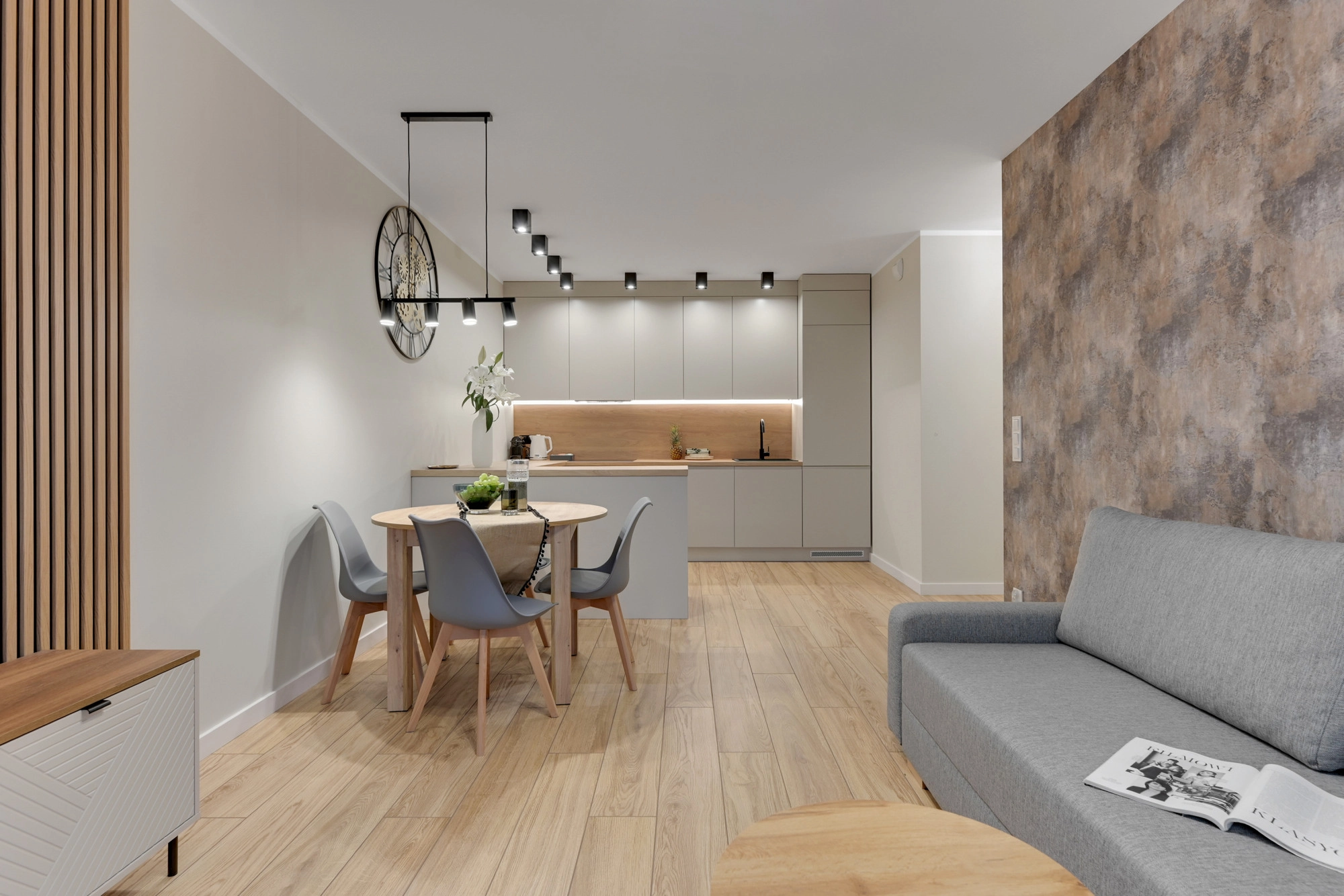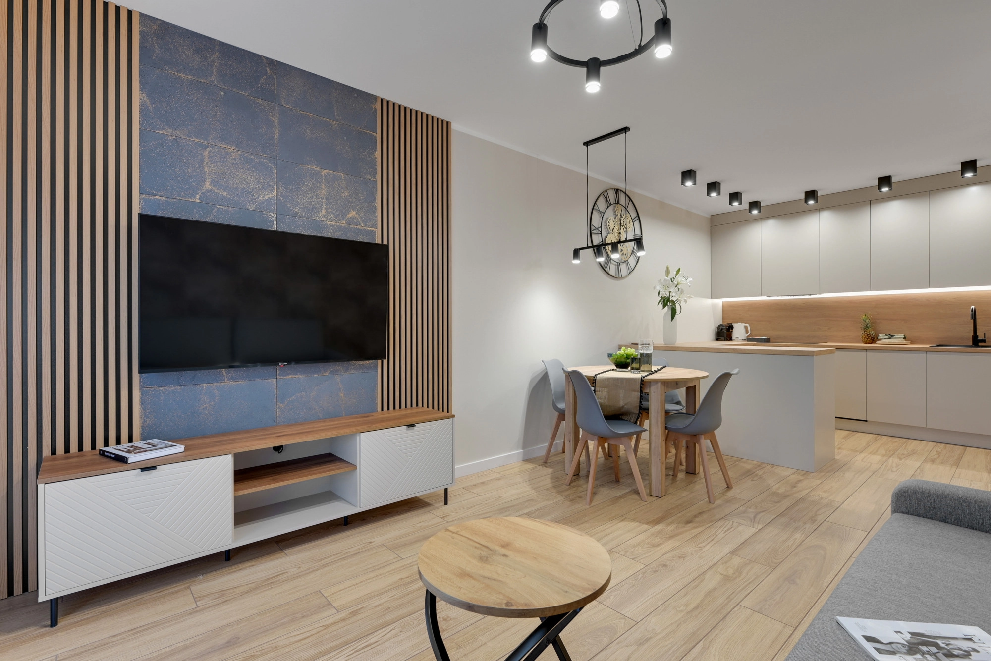 – salon z aneksem kuchennym (24,35 m2) oraz wyjściem na ogród; aneks z meblami w zabudowie oraz wyposażeniem w sprzęt AGD,