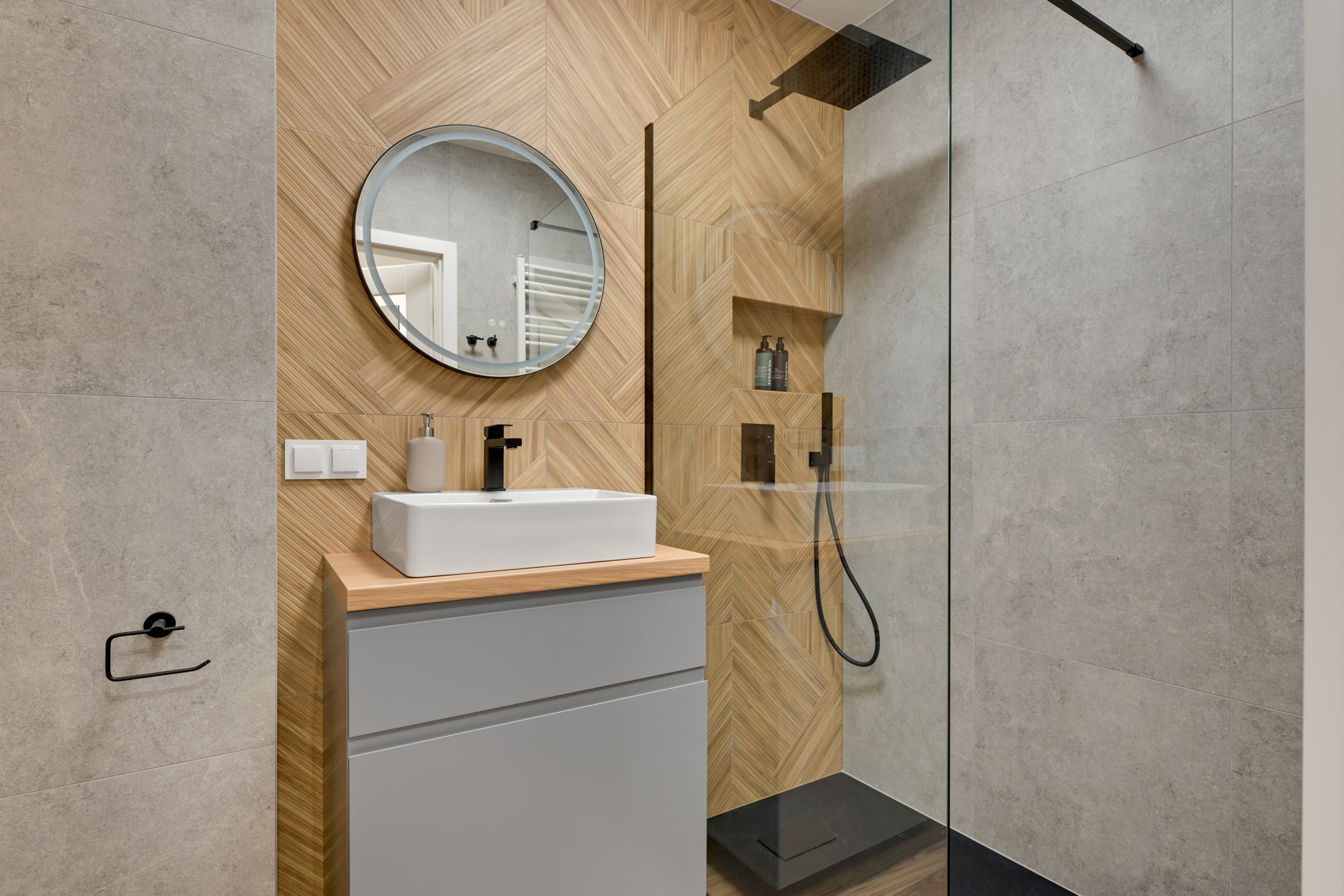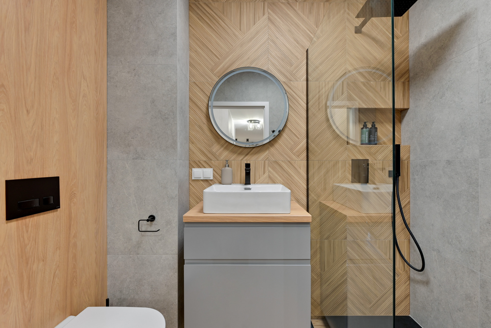 – łazienka (3,75 m2) z WC, prysznicem, umywalką, lustrem,