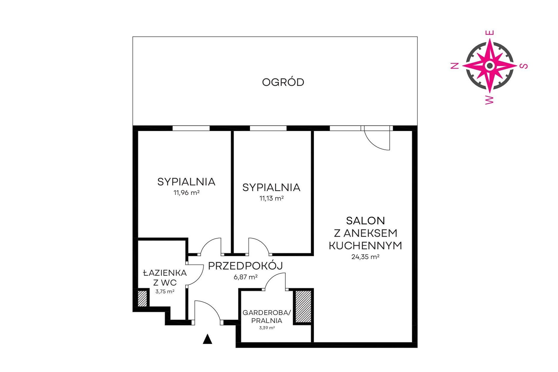 – 2 sypialnie (11,96 m2 oraz 11,13 m2),