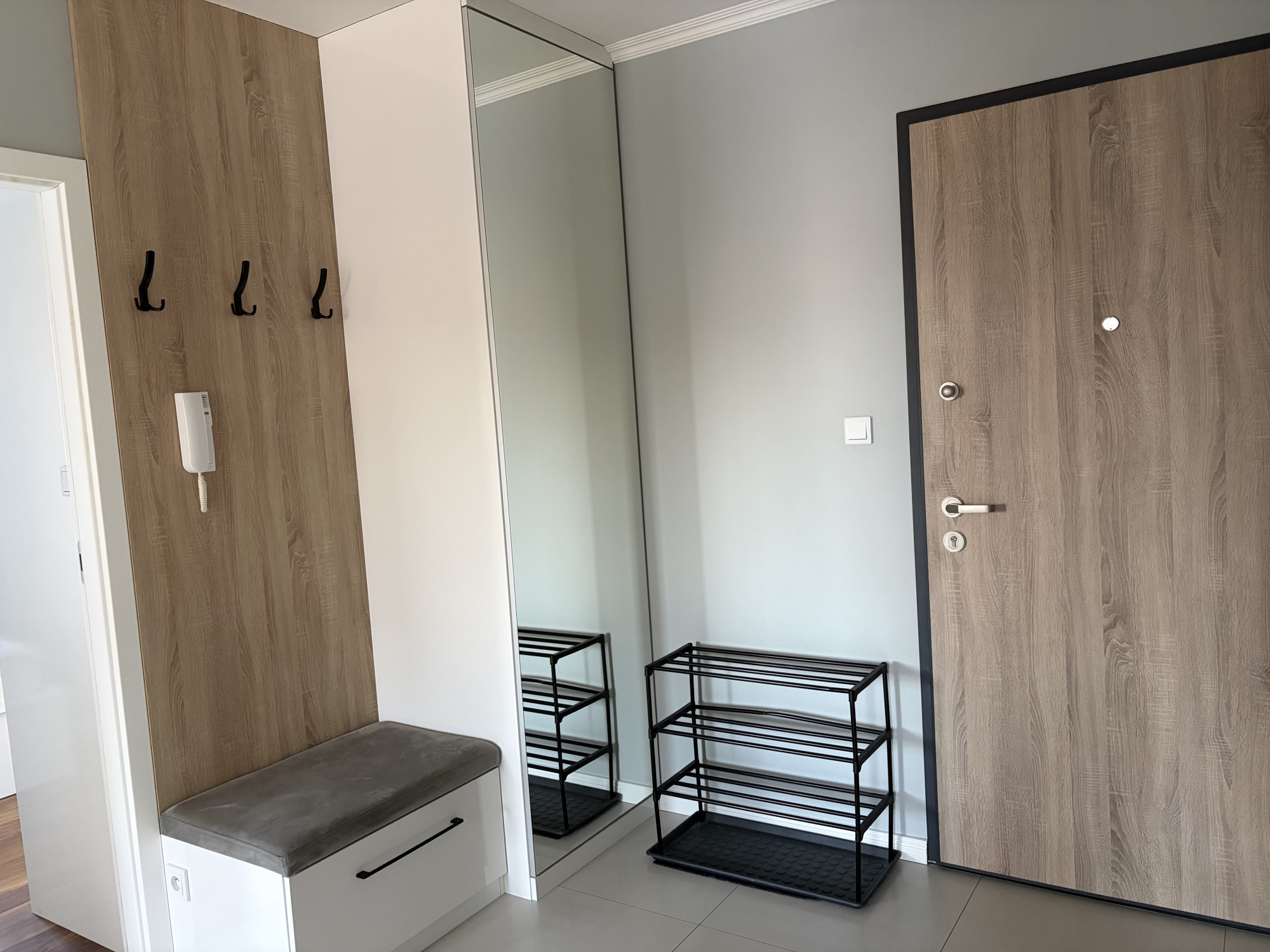 – Łazienka z przestronną kabiną prysznicową, zabudową wyposażona w pralkę i suszarkę.