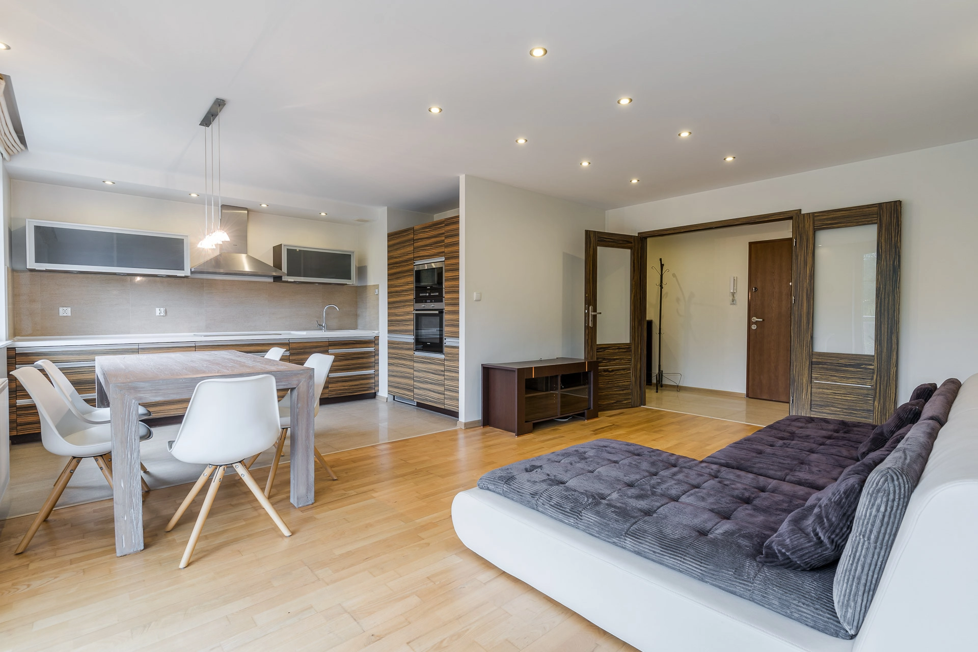 – salonu, ze skórzaną wygodną, narożną sofą,