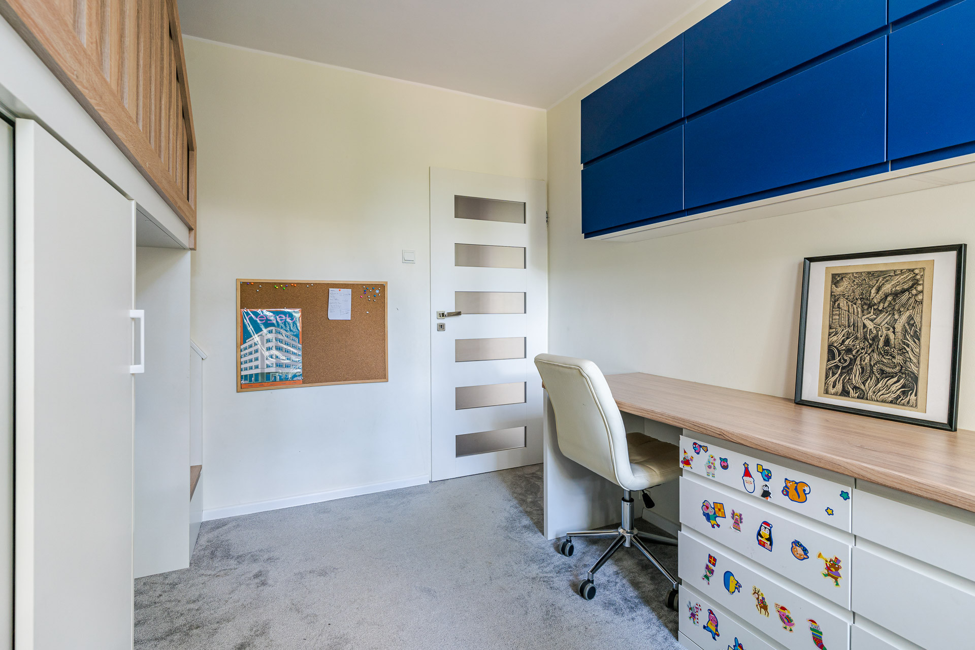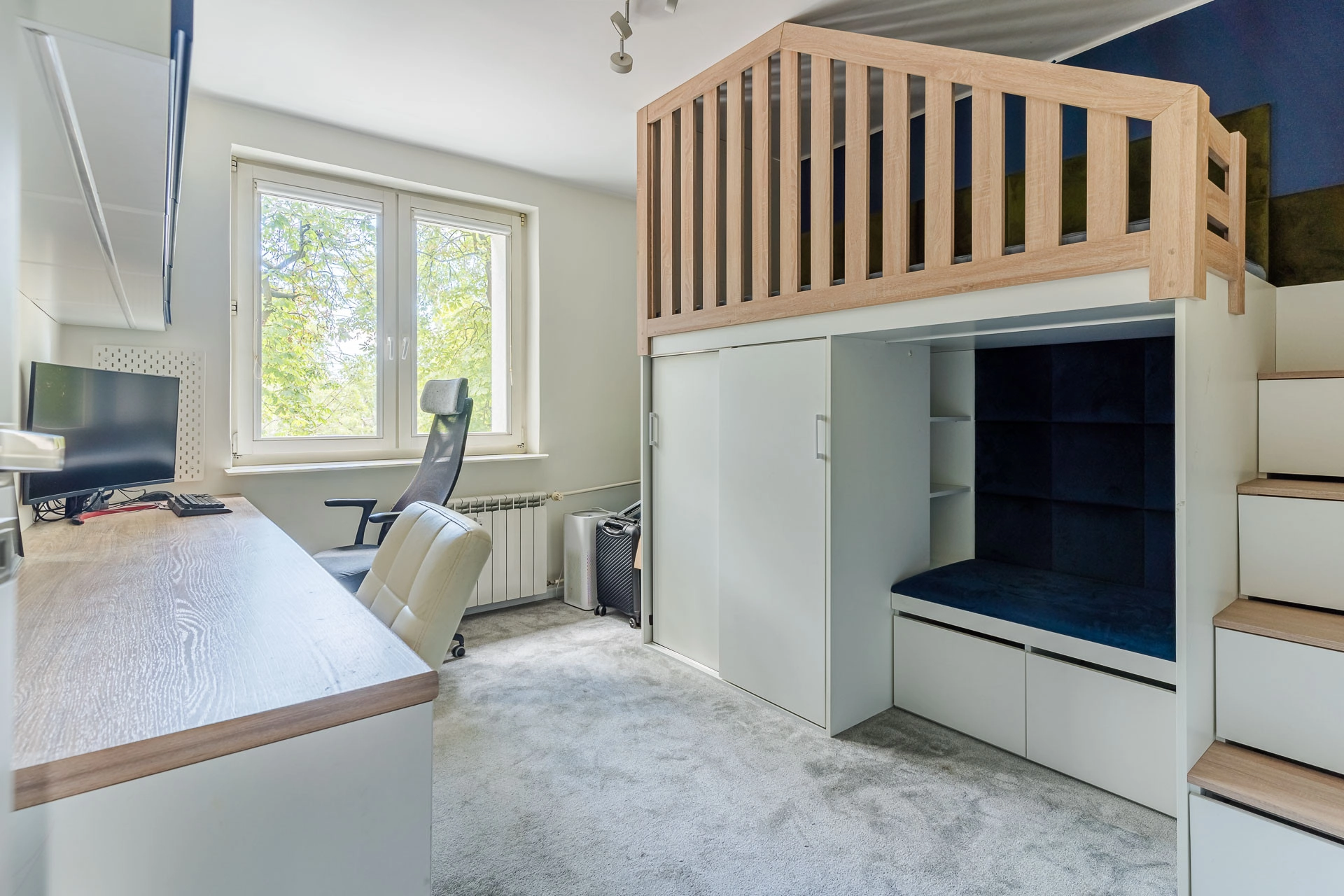 Jeden z pokoi wyróżnia się efektowną antresolą – idealną na dodatkową przestrzeń do spania. Wnętrza są przemyślane, jasne i utrzymane w nowoczesnym, ale przytulnym klimacie, który sprzyja zarówno codziennemu życiu, jak i spotkaniom z bliskimi.