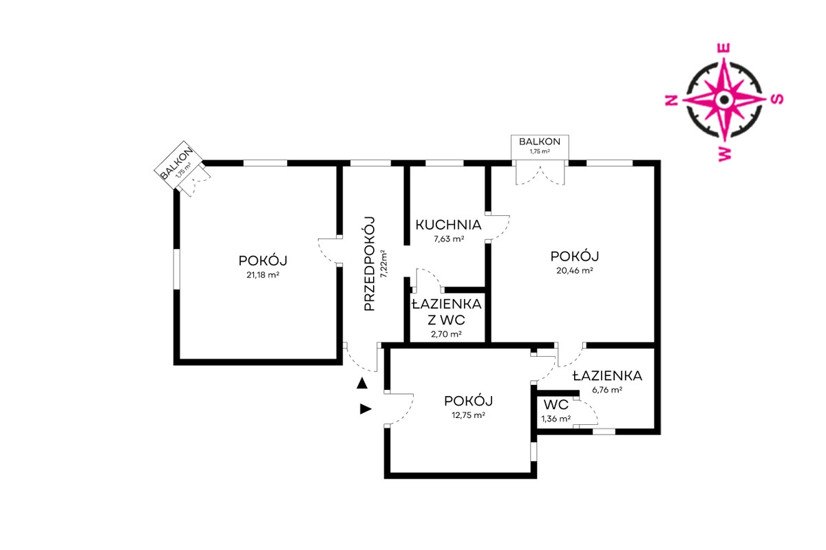 – 3 pokoje (21,18 m2; 20,46 m2 oraz 12,75 m2); dwa największe z nich posiadają własne balkony (każdy po 1,75 m2),