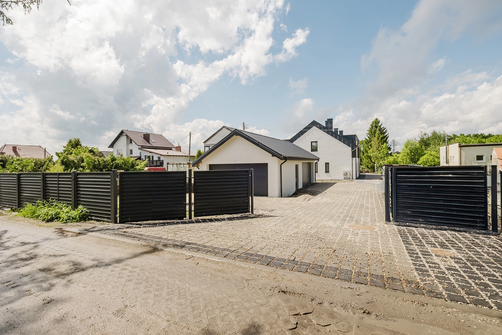 – ogrodzenie z estetycznych paneli, brama wjazdowa sterowana pilotem, furtka otwierana domofonem