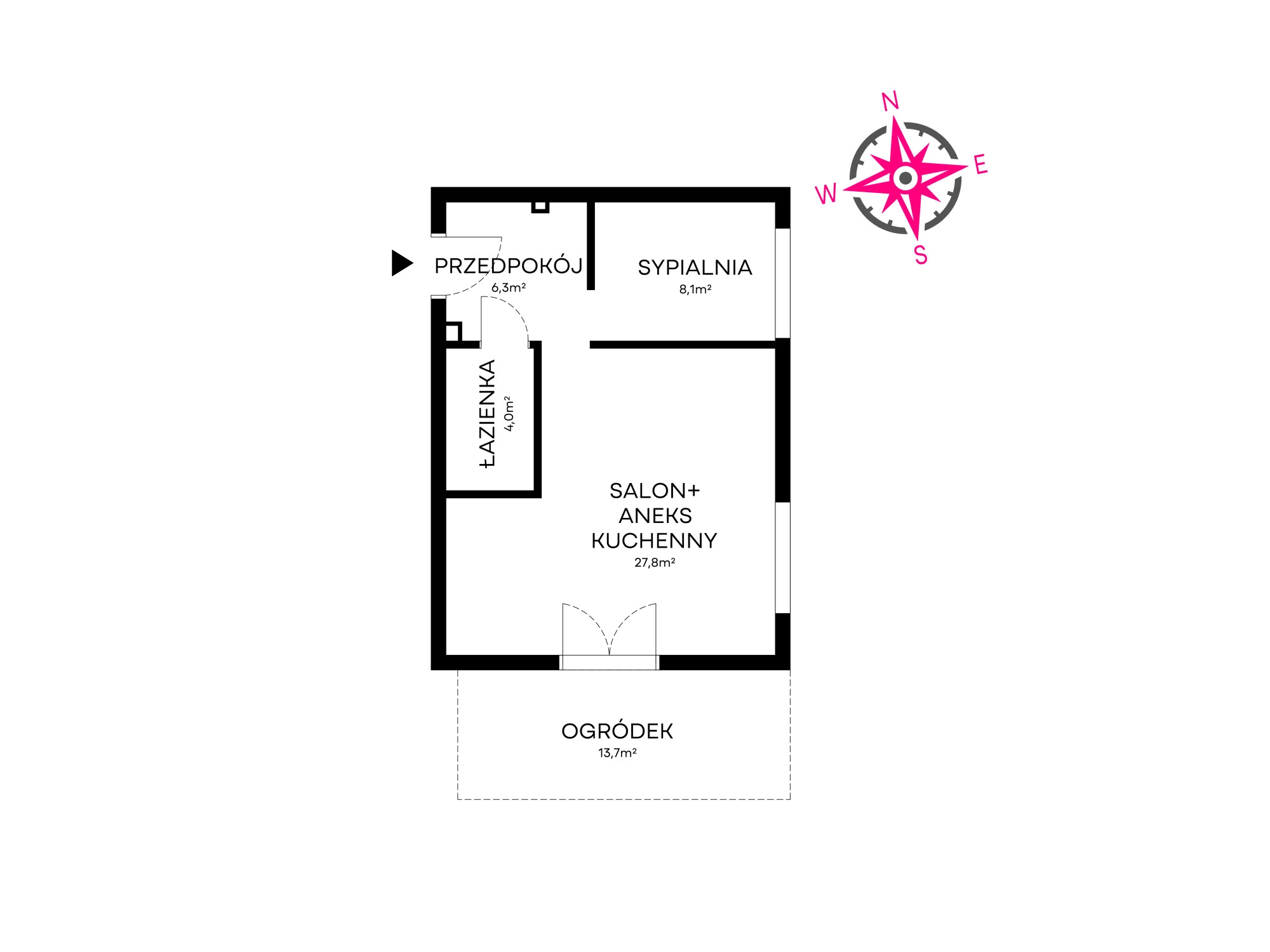 – przestrzeni dziennej z kuchnią w formie aneksu (27,8 m2) oraz prywatnym ogrodem (13,7 m2),