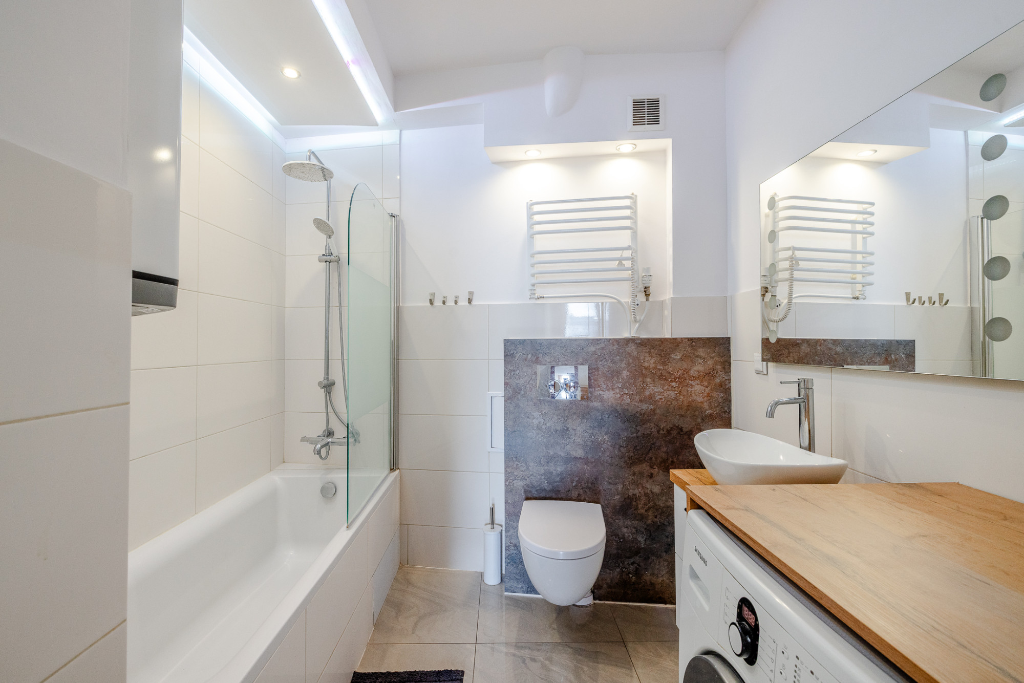 Ogrzewanie miejskie, natomiast ciepła woda podgrzewana jest za pomocą bojlera elektrycznego. Okna PCV.