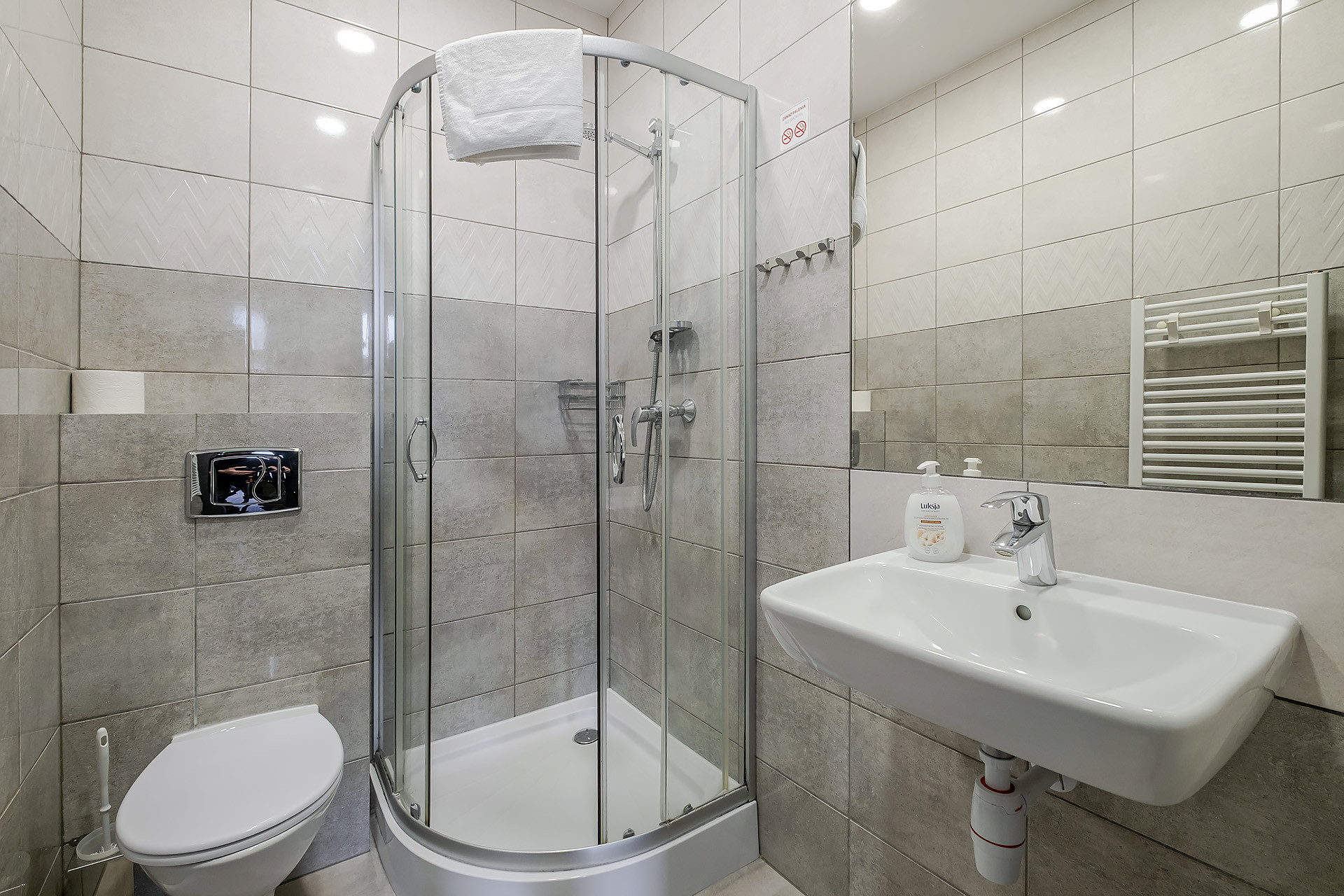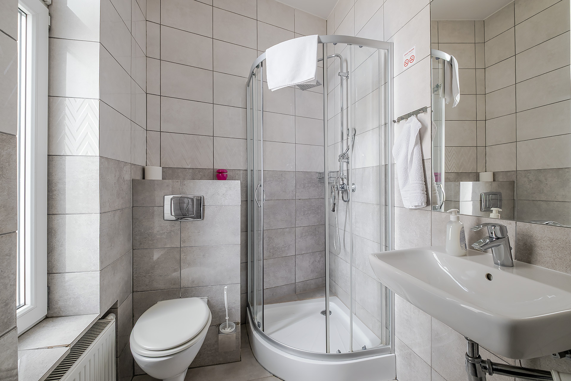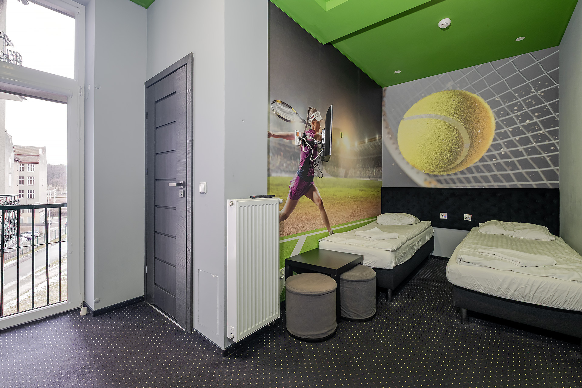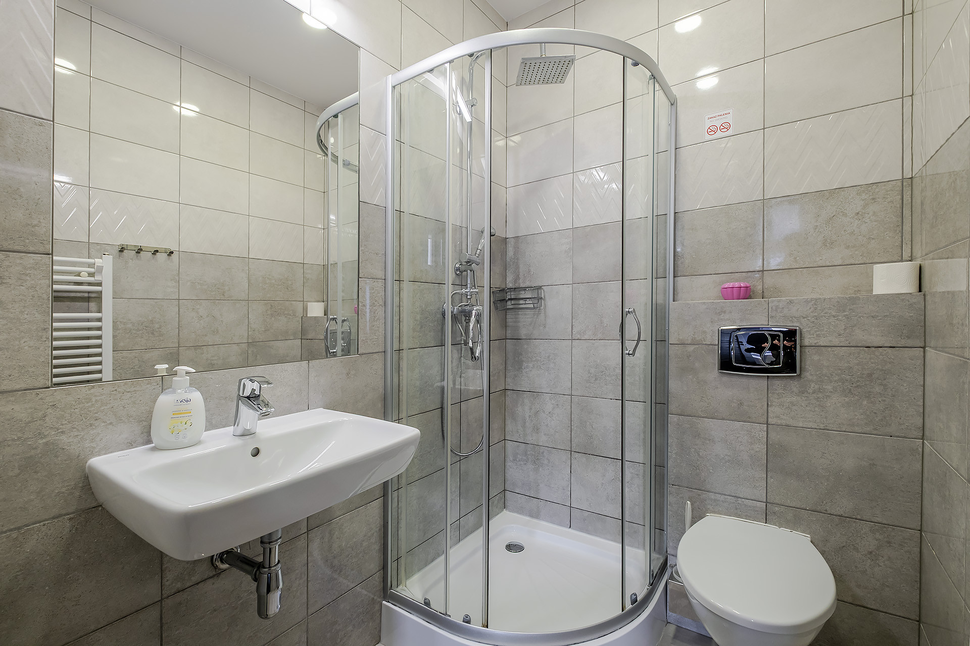 Każdy pokój z własną łazienką (WC, prysznic, umywalka, lustro), telewizorem, meblami. Z niektórych z nich wyjścia na balkon (w sumie 4 balkony).