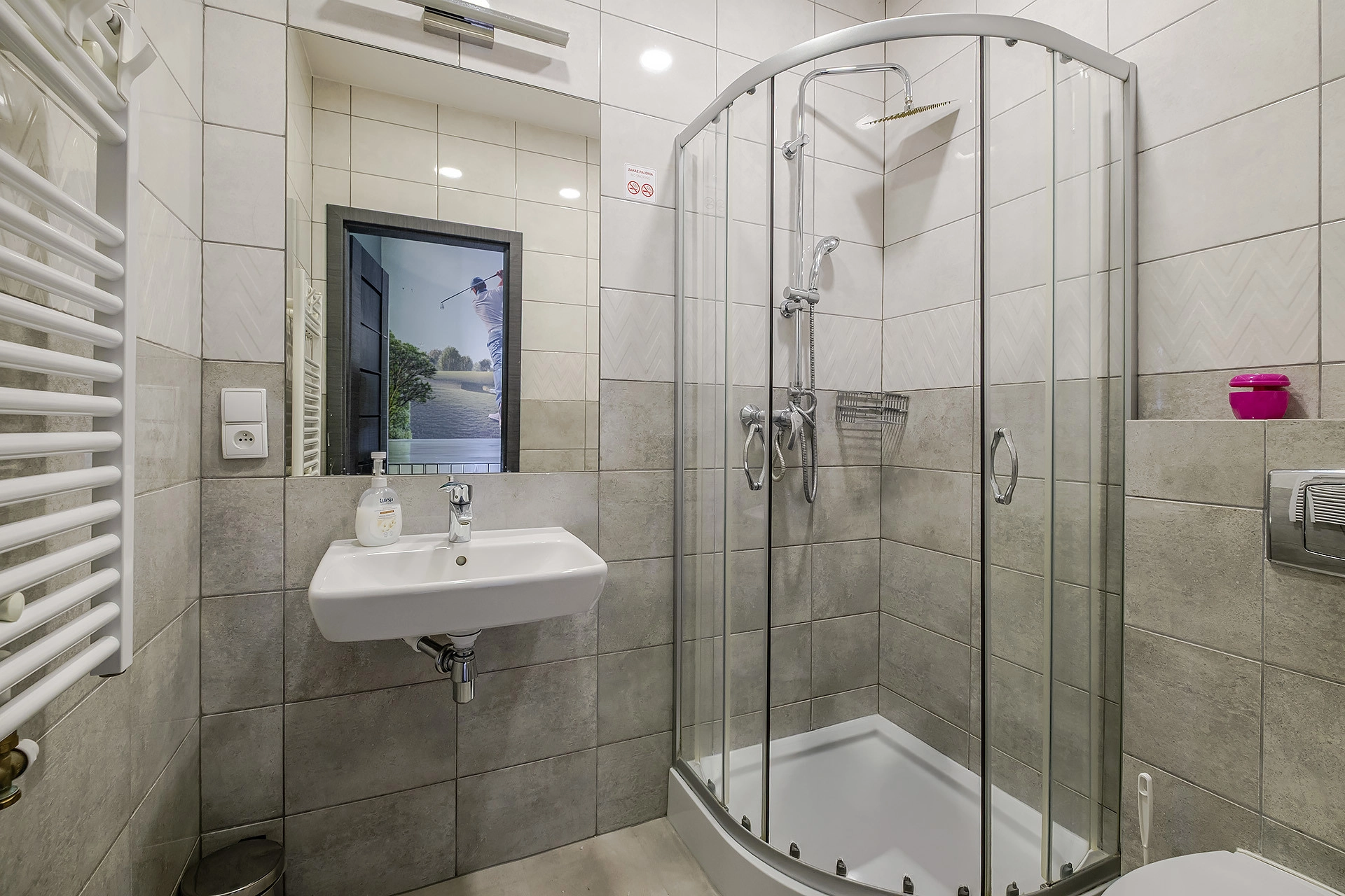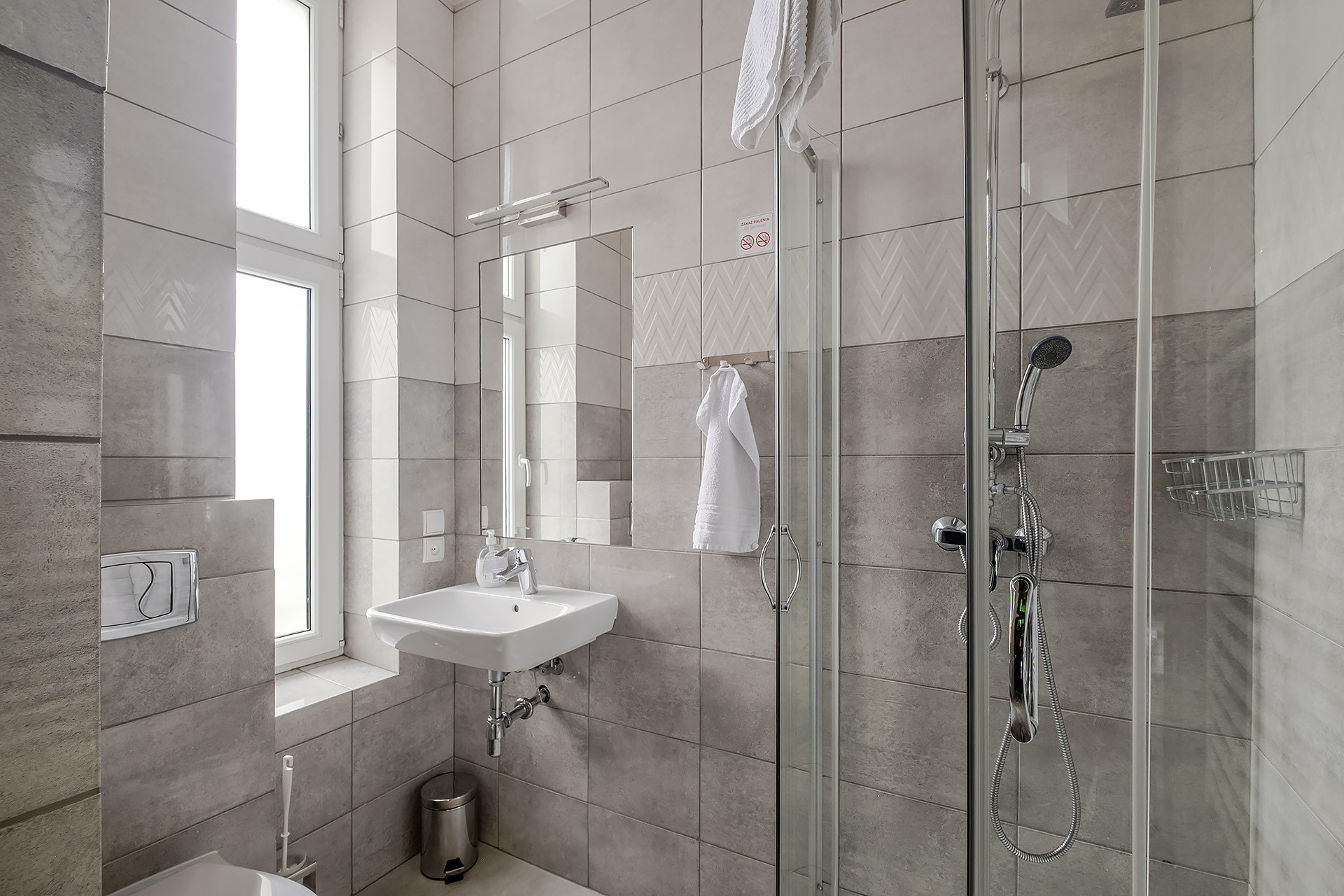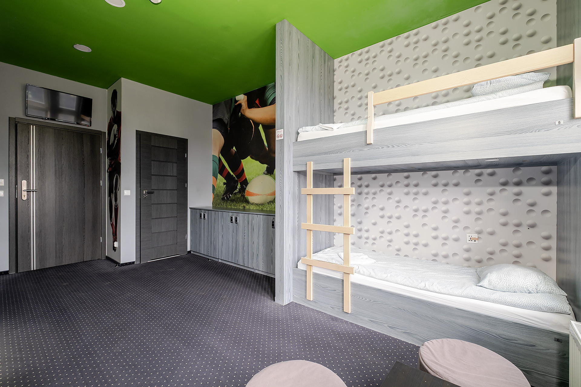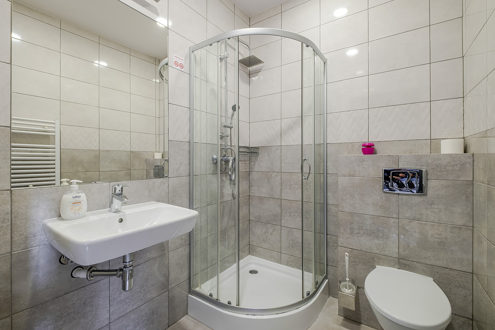Każdy pokój z własną łazienką (WC, prysznic, umywalka, lustro), telewizorem, meblami. Z niektórych z nich wyjścia na balkon (w sumie 4 balkony).