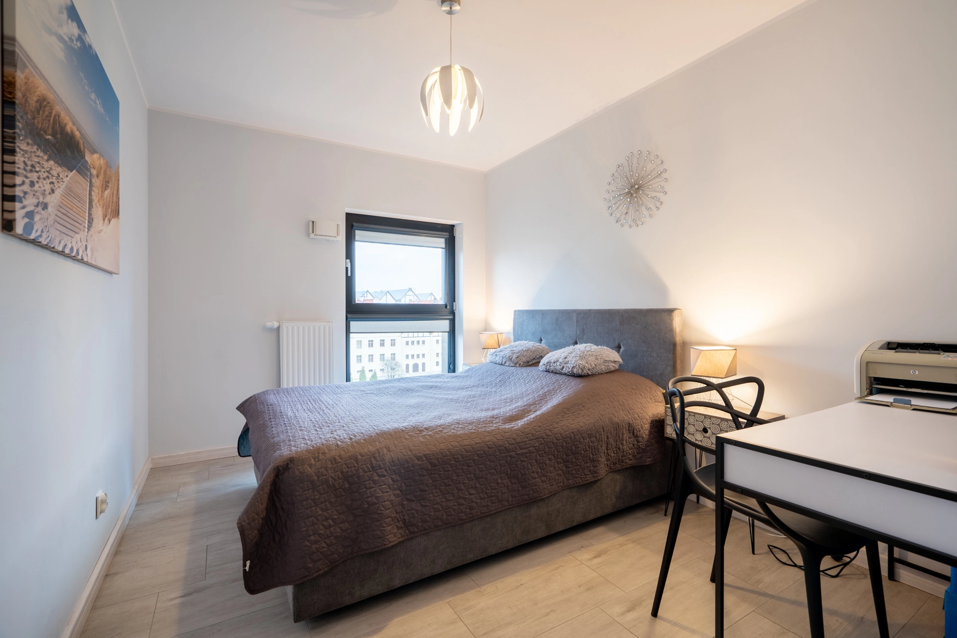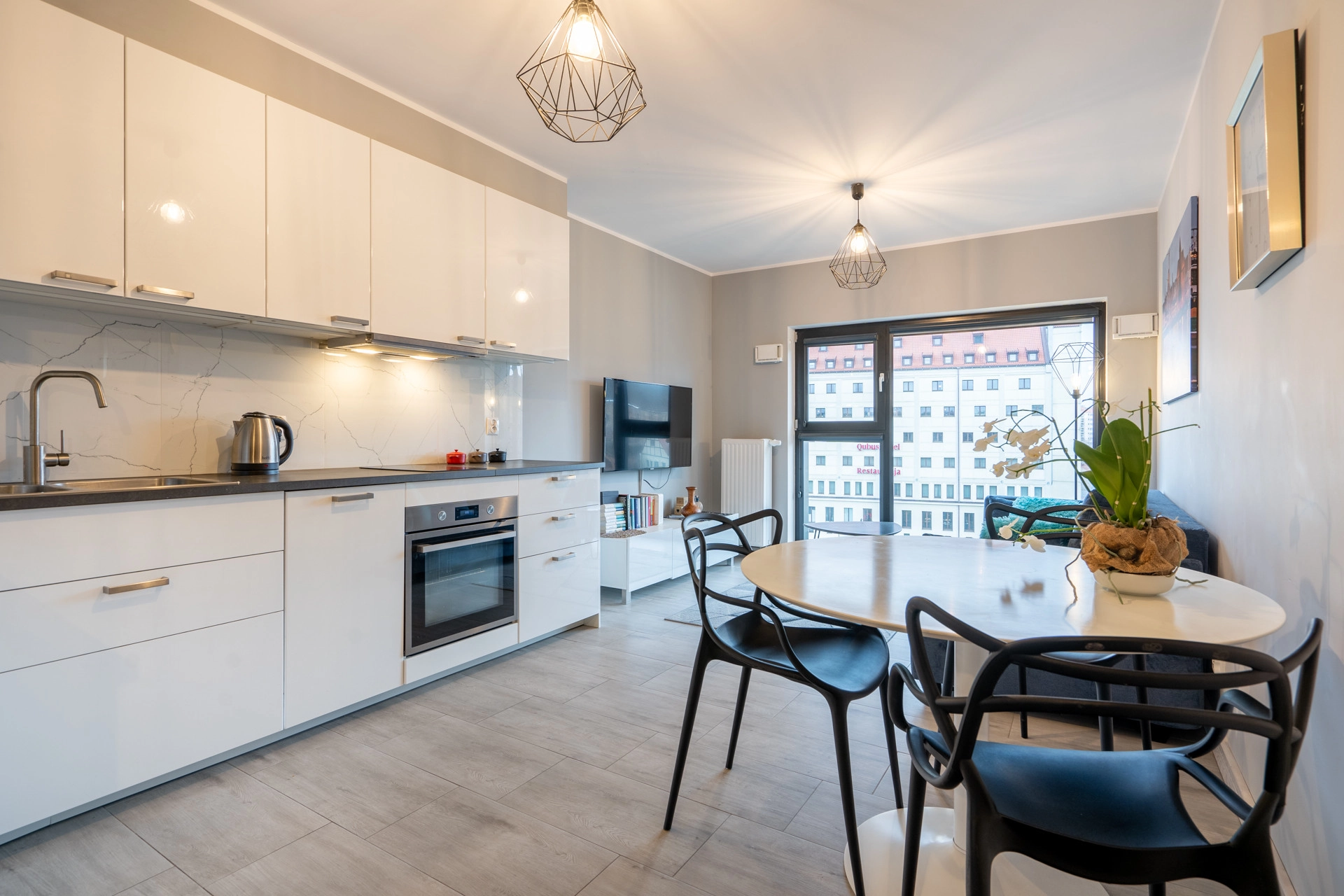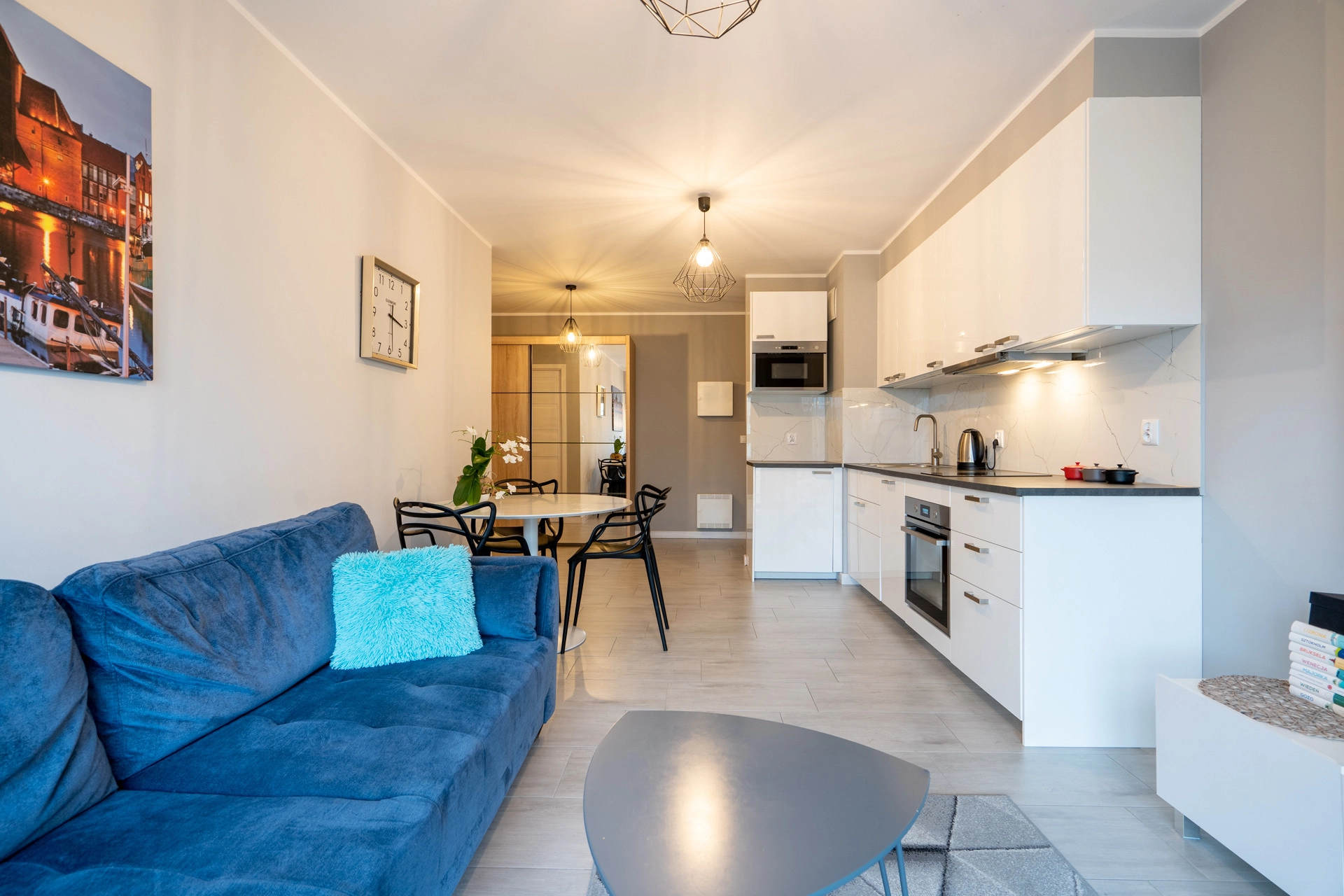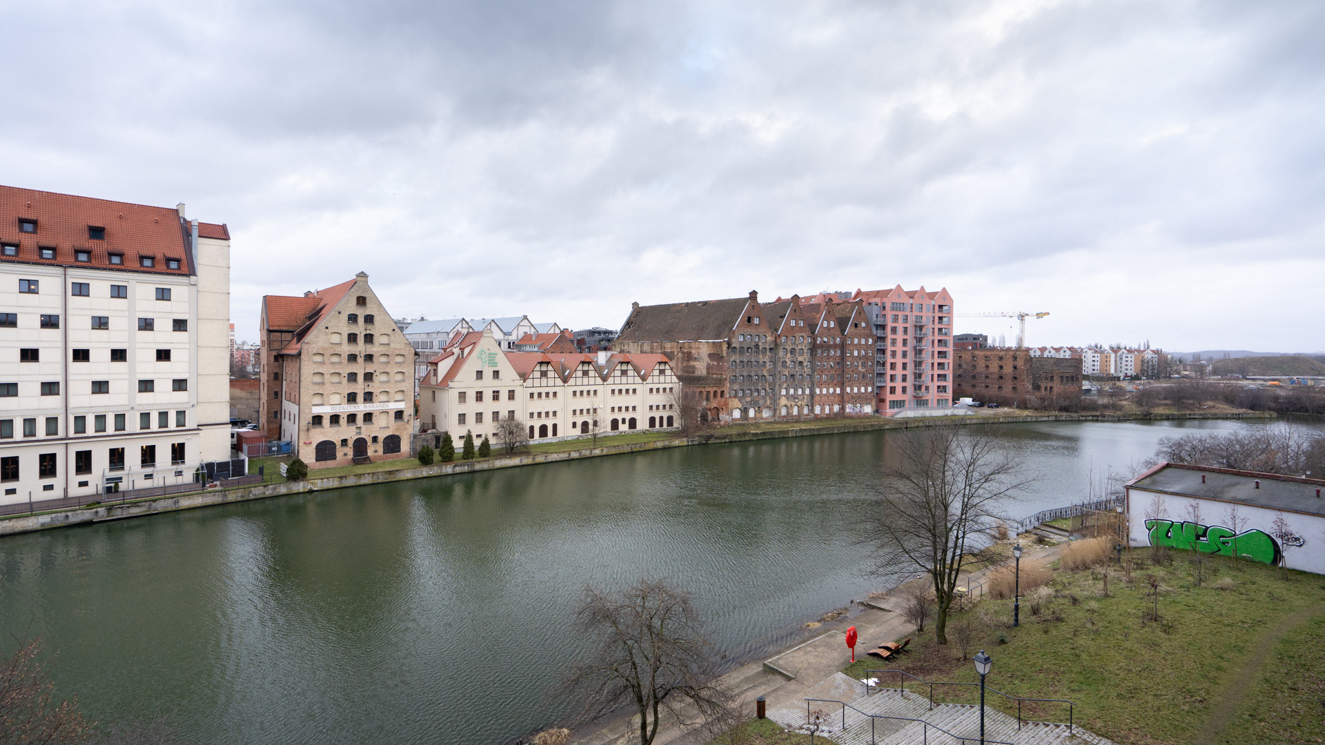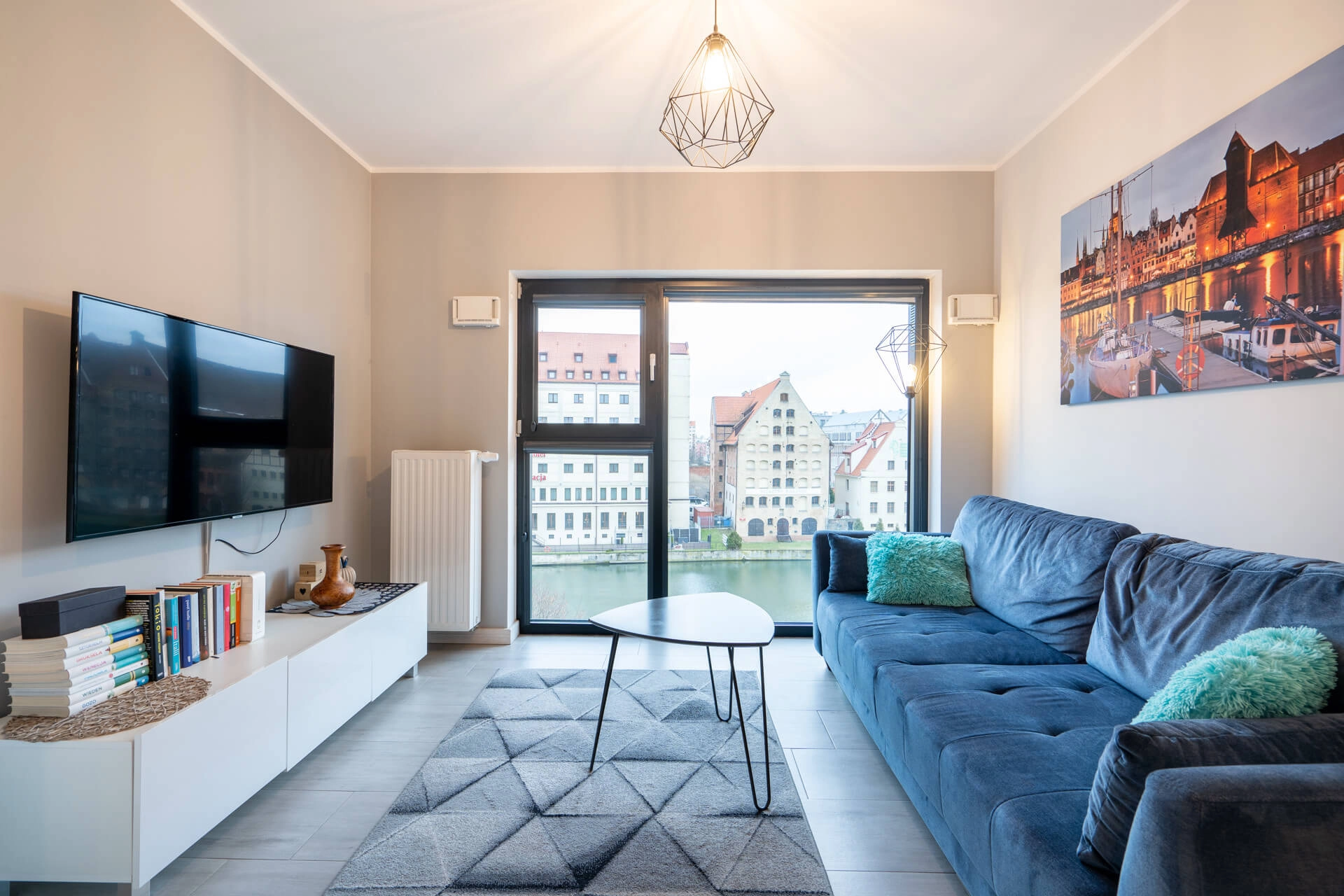 Mieszkanie z dużymi oknami z których rozpościera się widok na Motławę.