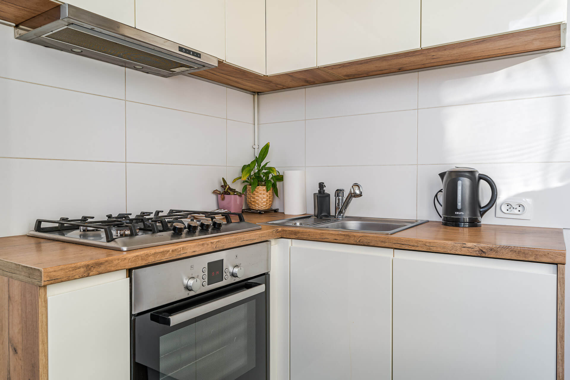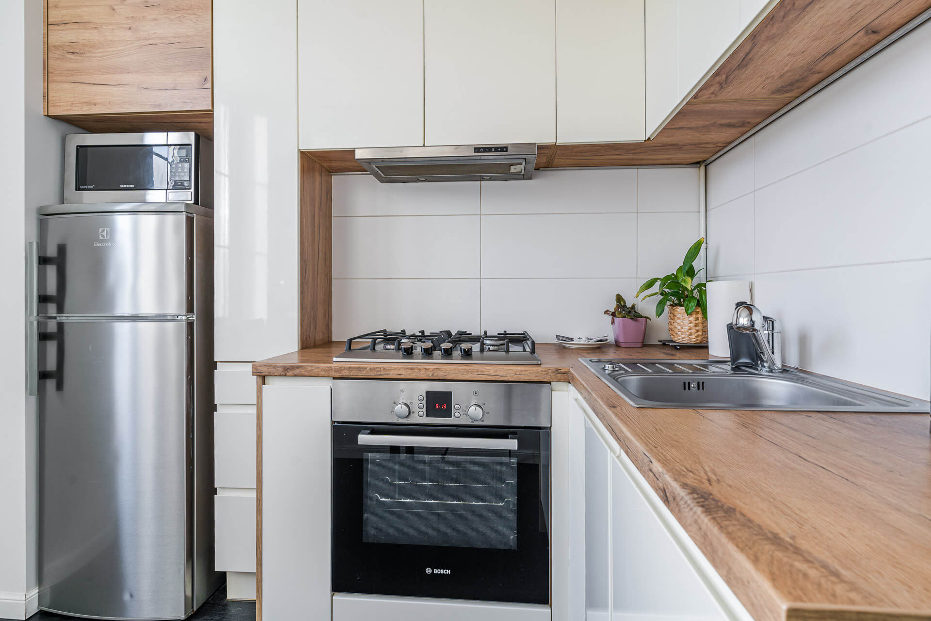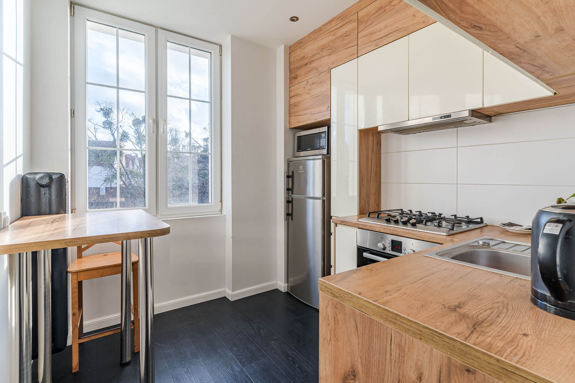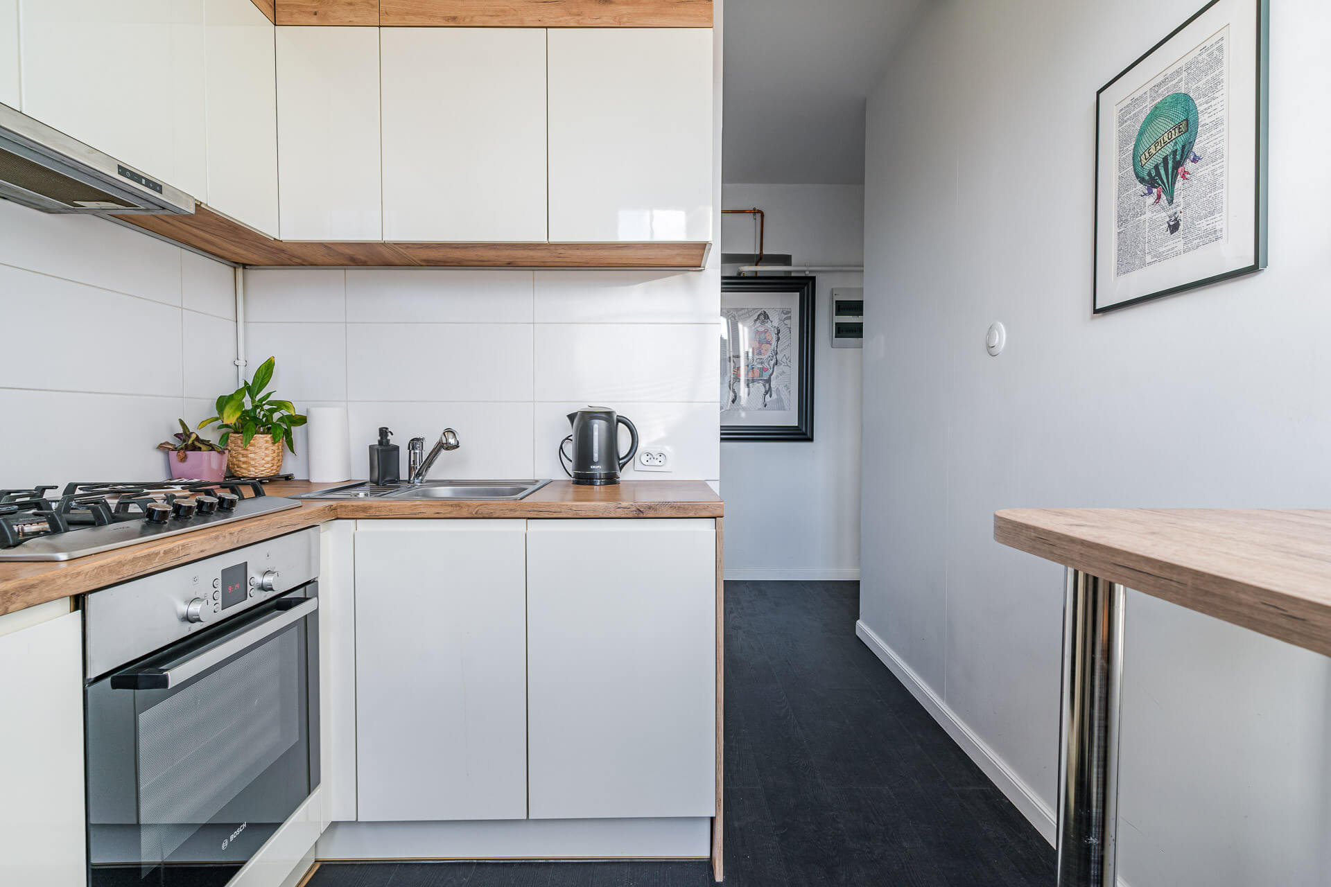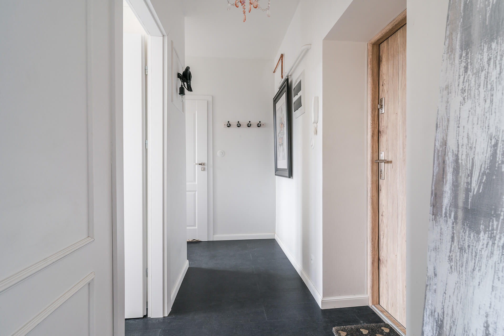 Całe umeblowanie i wyposażenie widoczne na zdjęciach pozostają w mieszkaniu i są objęte jego ceną. Instalacja elektryczna miedziana. Na podłogach panele oraz płytki. Wysokość pomieszczeń: 2,71 m. Ogrzewanie miejskie, natomiast ciepła woda podgrzewana przez piec gazowy. Okna są plastikowe, a ich wystawa południowa.