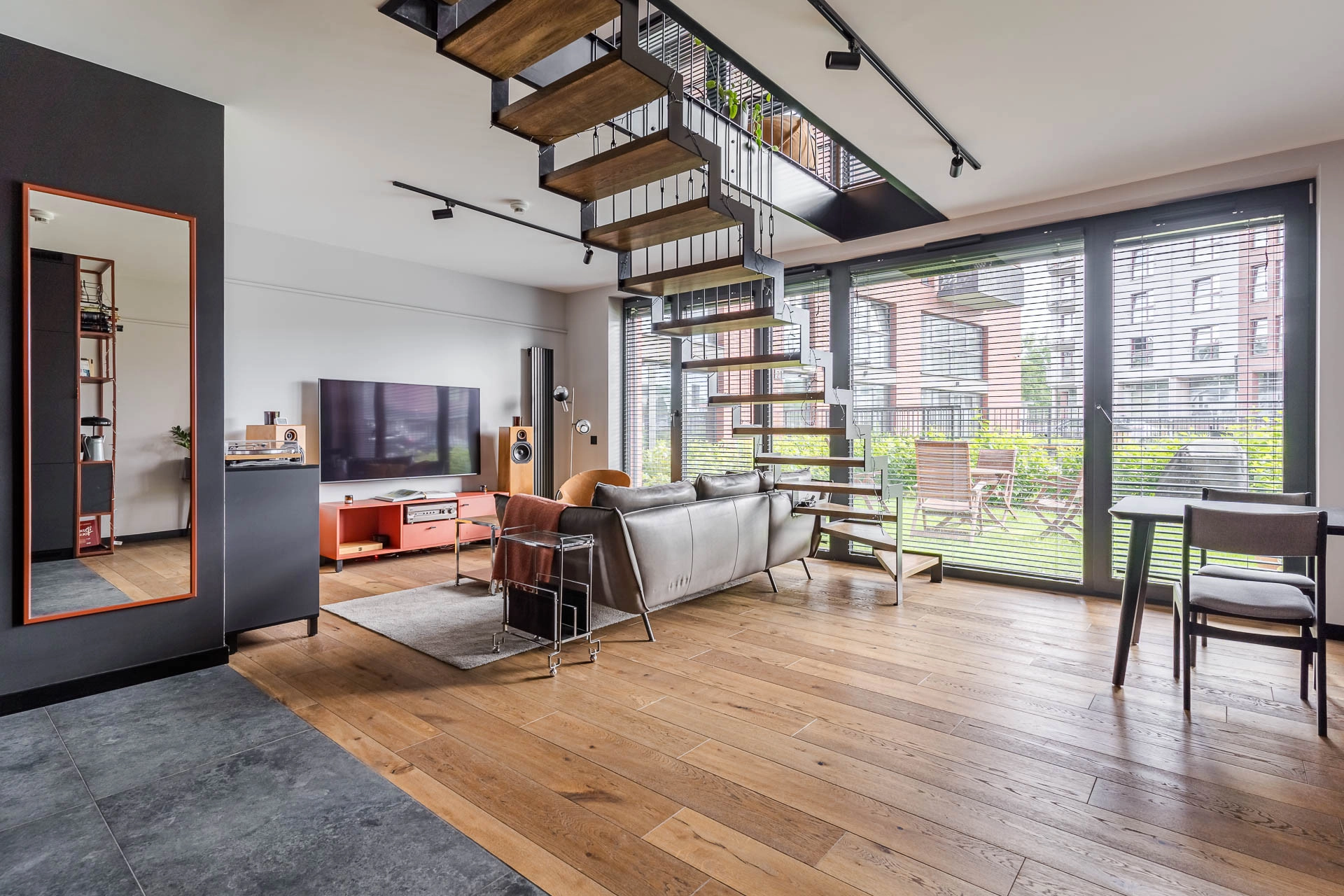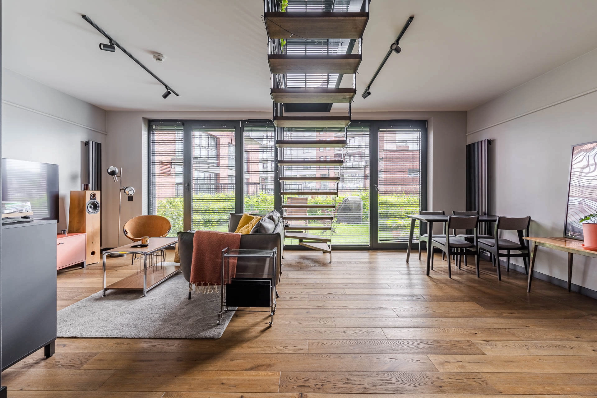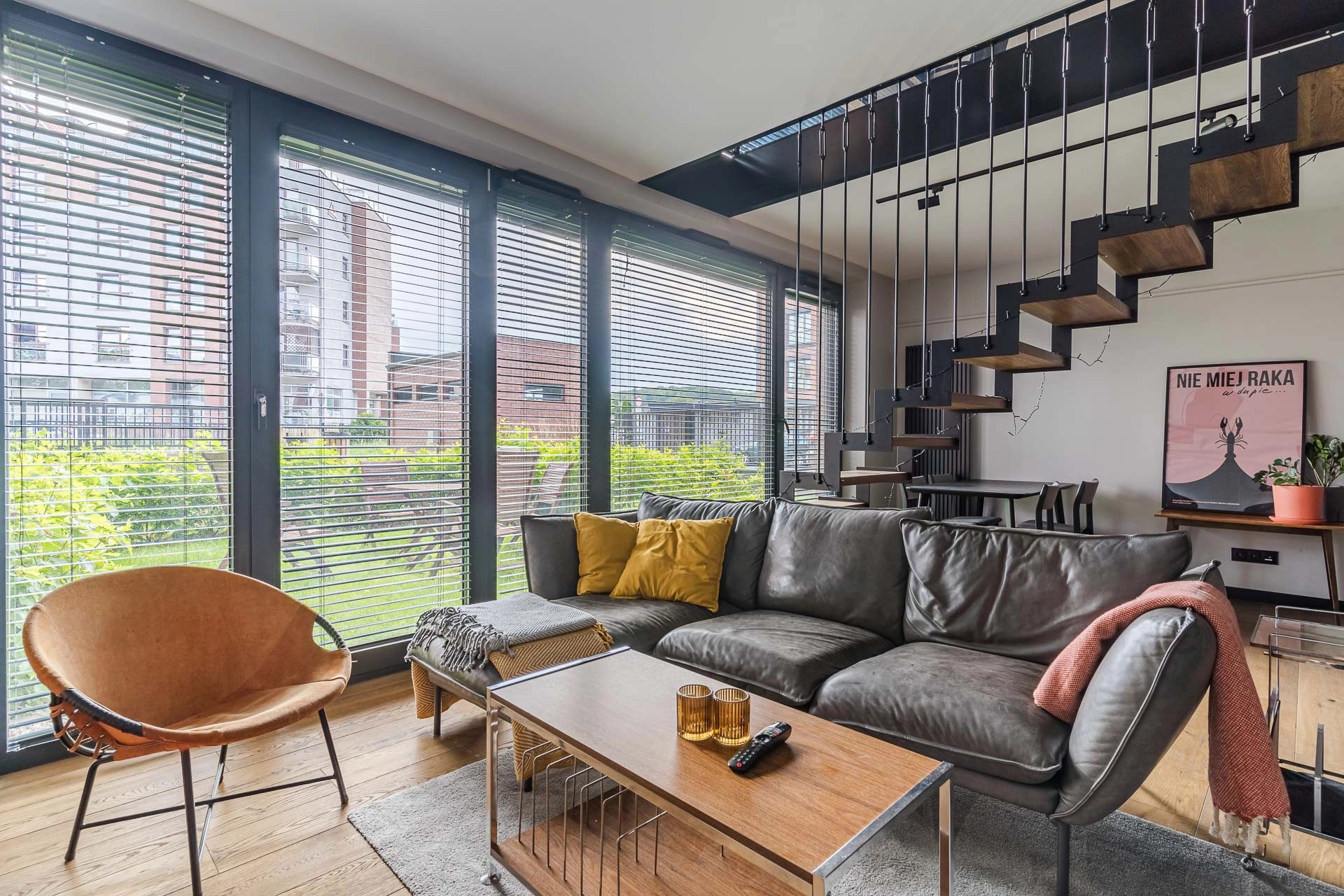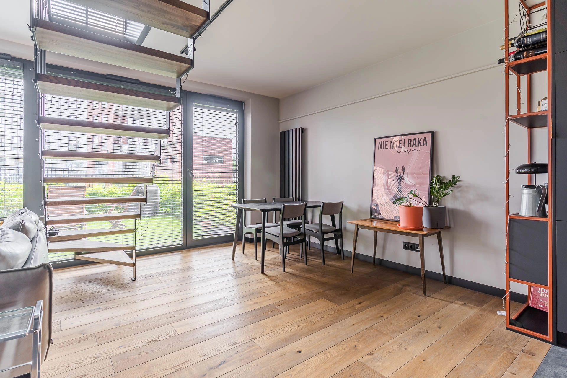 Przestronne, dwupoziomowe mieszkanie zostało wykończone z najwyższej jakości materiałów. Drewniana podłoga w salonie -deska dębowa warstwowa, kamienne blaty w kuchni i łazienkach oraz starannie dobrane wyposażenie zapewniają elegancję i trwałość na lata. Dzięki dużym przeszkleniom wnętrze jest znakomicie doświetlone.