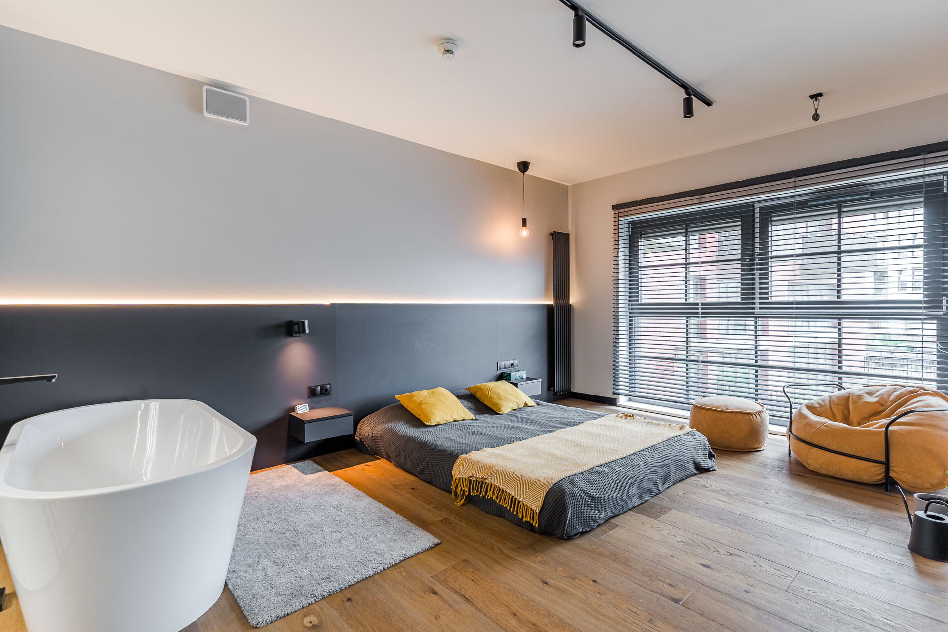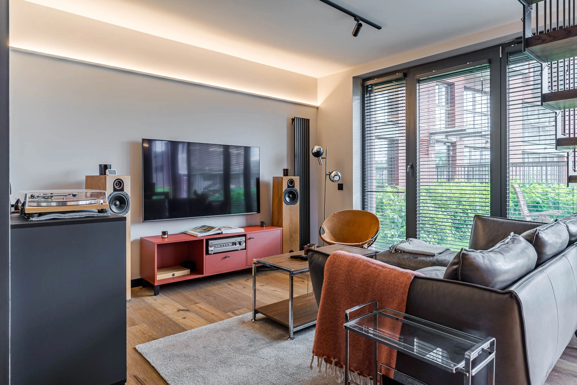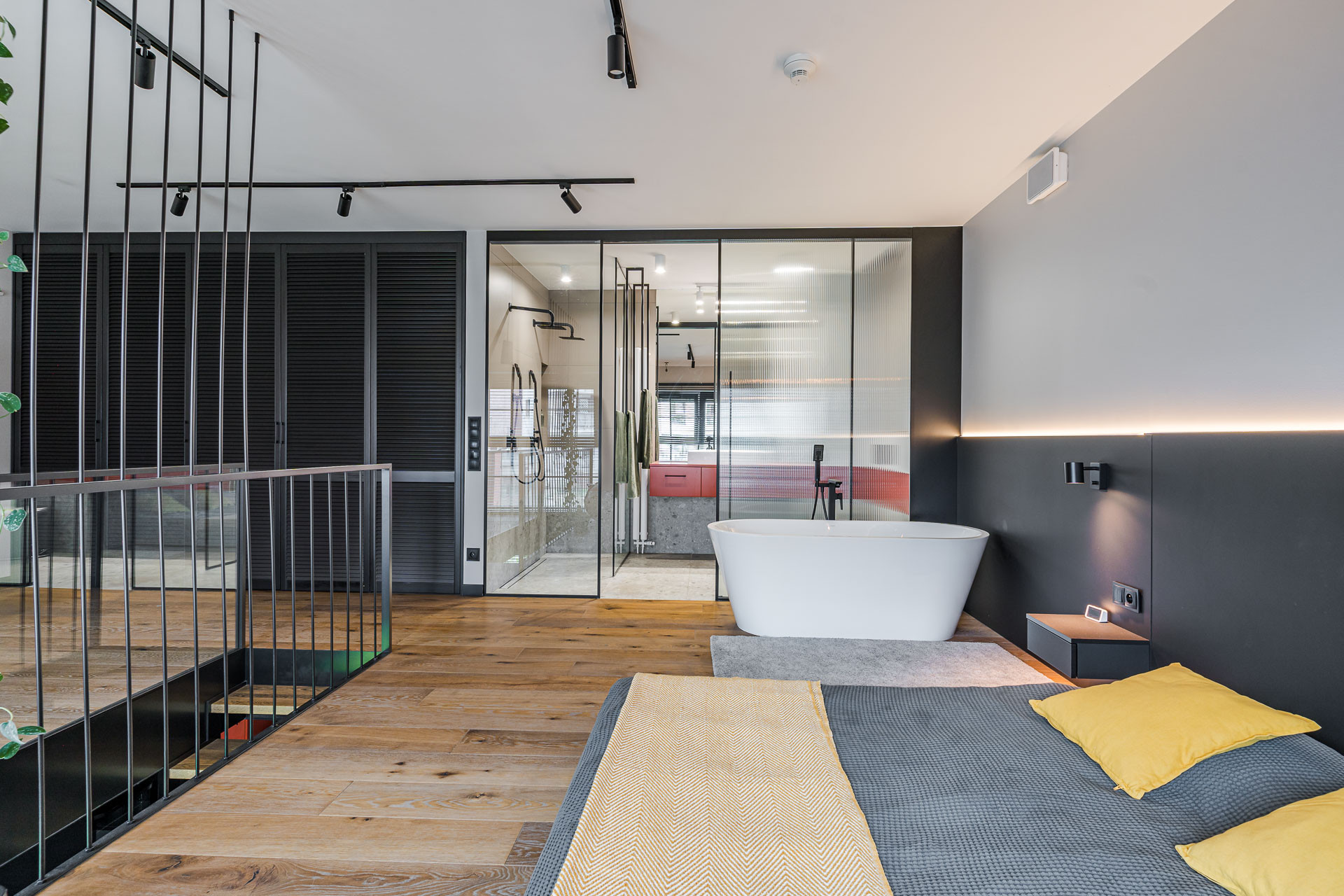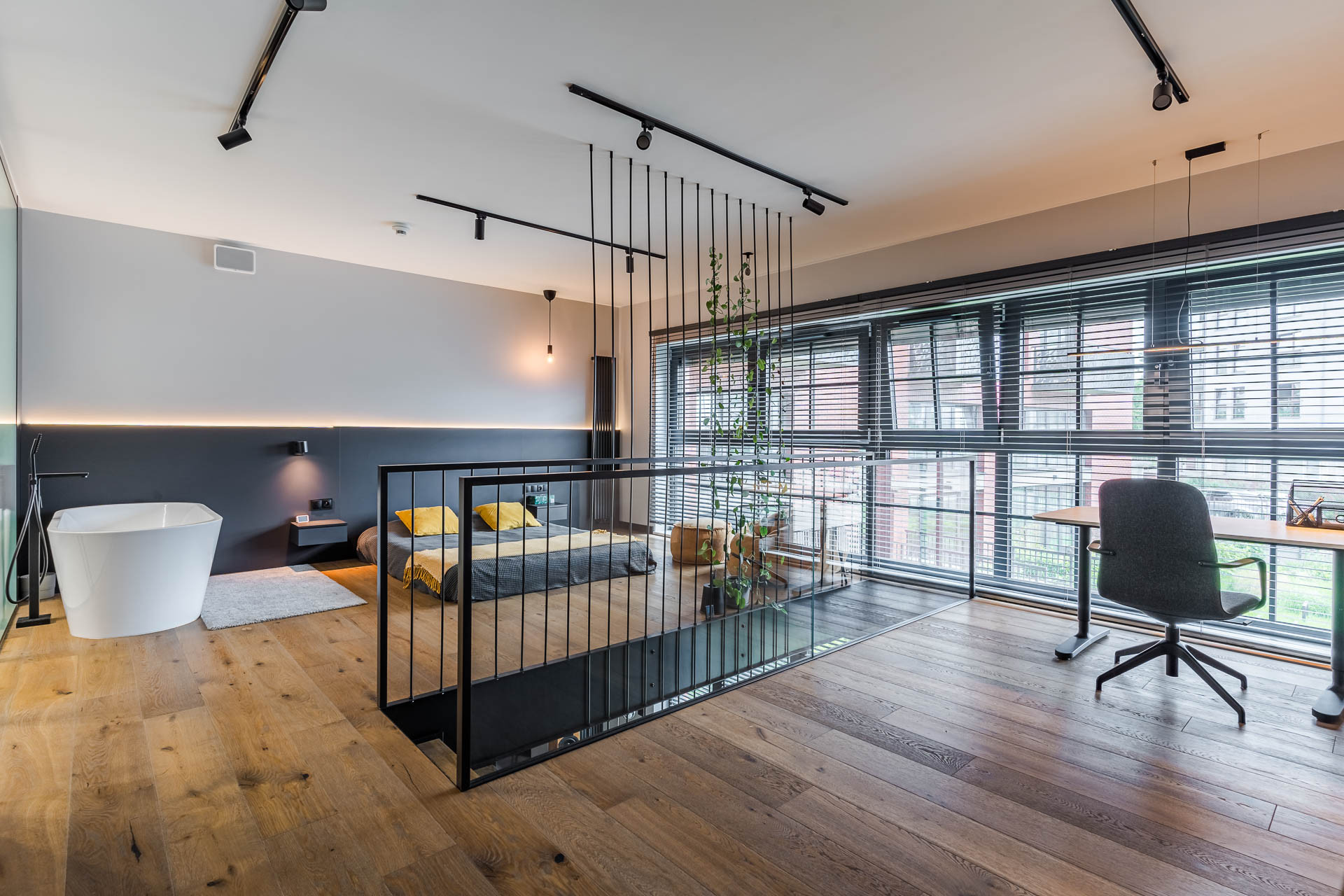 Przestronne, dwupoziomowe mieszkanie zostało wykończone z najwyższej jakości materiałów. Drewniana podłoga w salonie -deska dębowa warstwowa, kamienne blaty w kuchni i łazienkach oraz starannie dobrane wyposażenie zapewniają elegancję i trwałość na lata. Dzięki dużym przeszkleniom wnętrze jest znakomicie doświetlone.