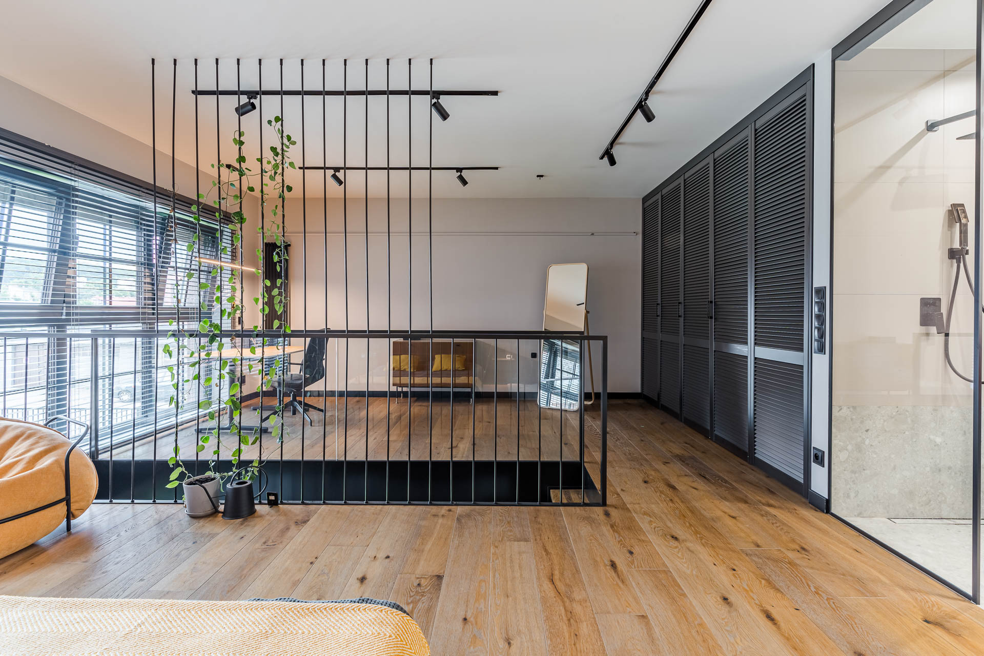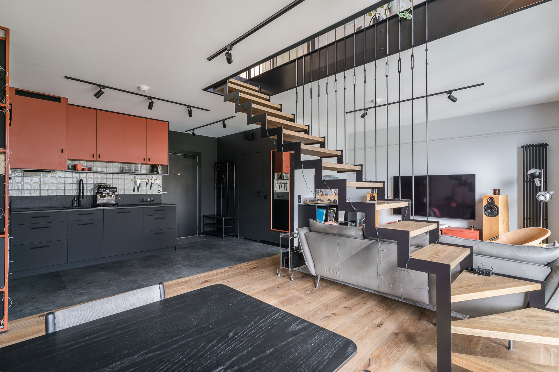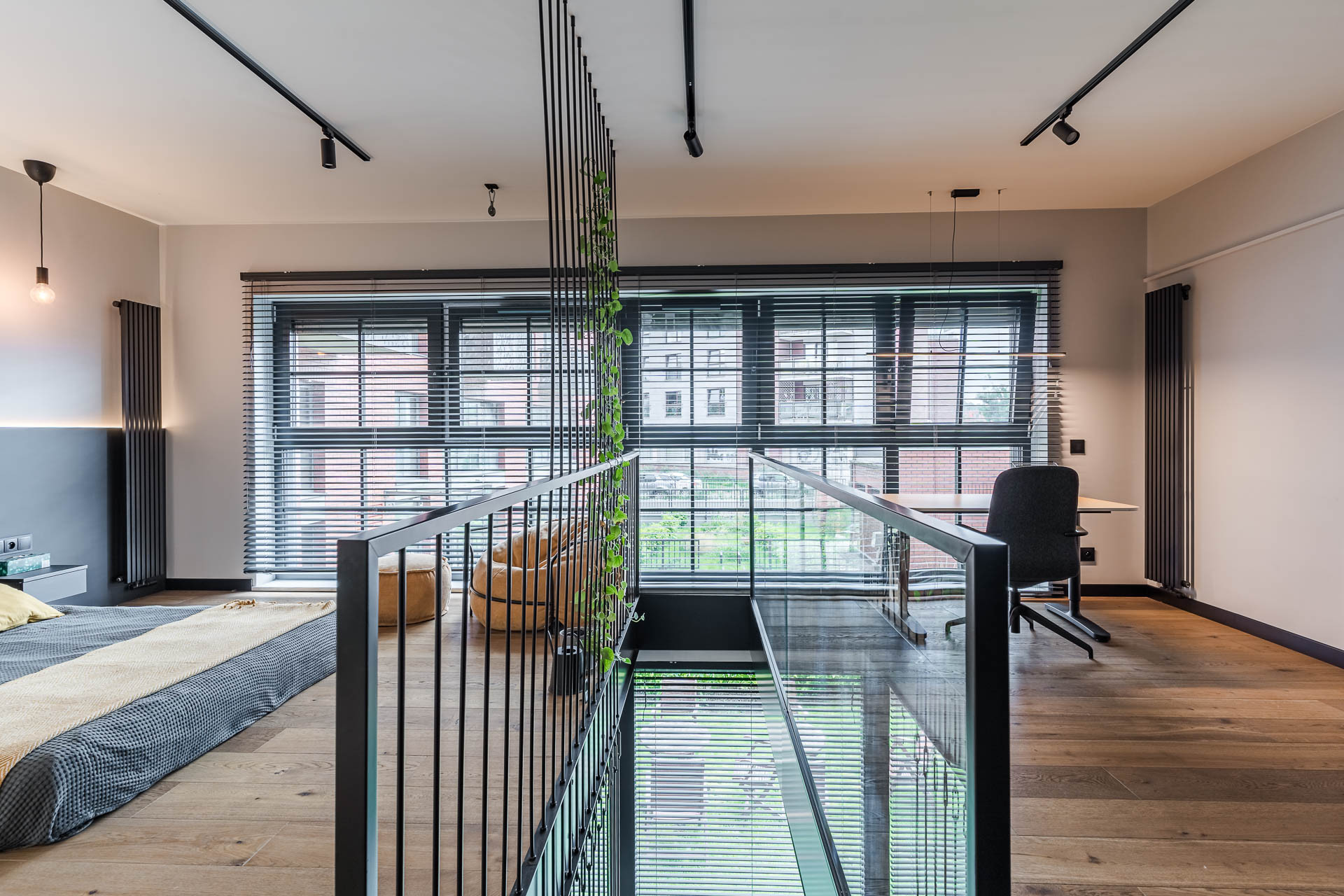 Obie kondygnacje połączone są schodami stalowymi z dębowymi stopniami.
