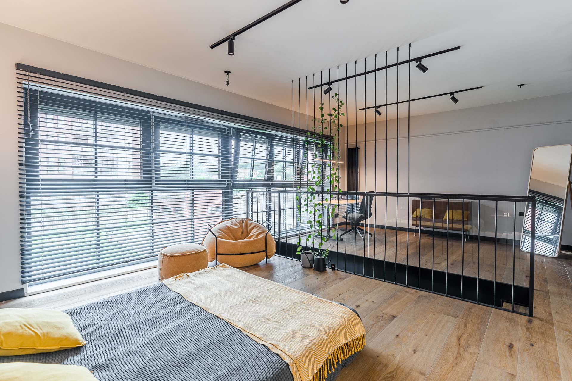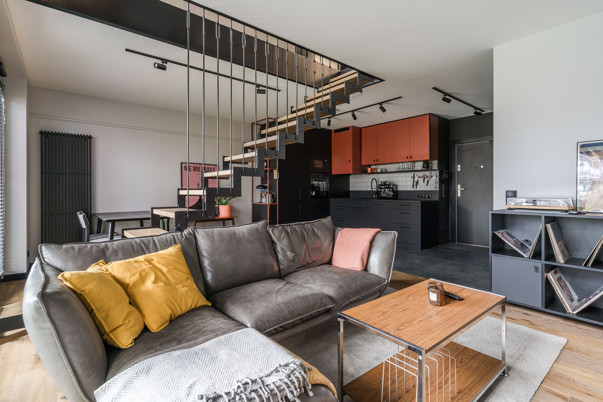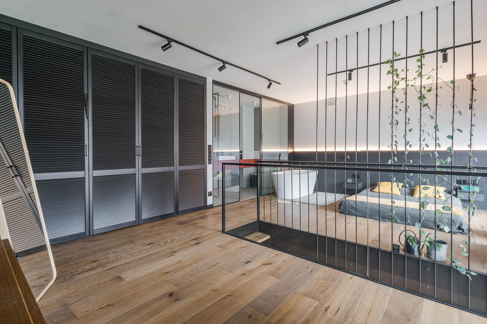 Obie kondygnacje połączone są schodami stalowymi z dębowymi stopniami.