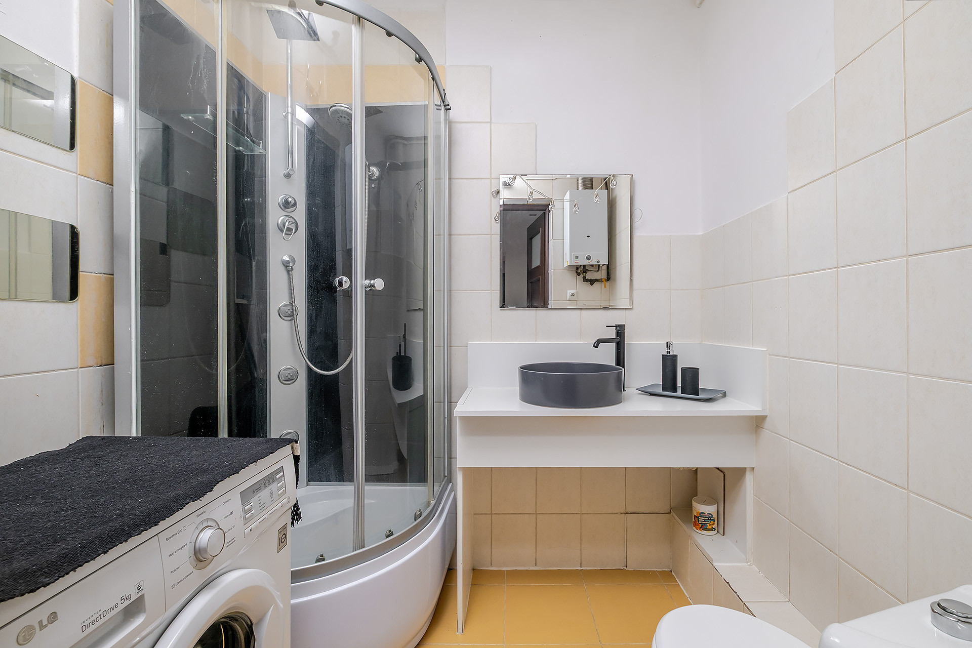 – łazienka (3,26 m2) z WC, prysznicem, pralką, umywalką, lustrem,