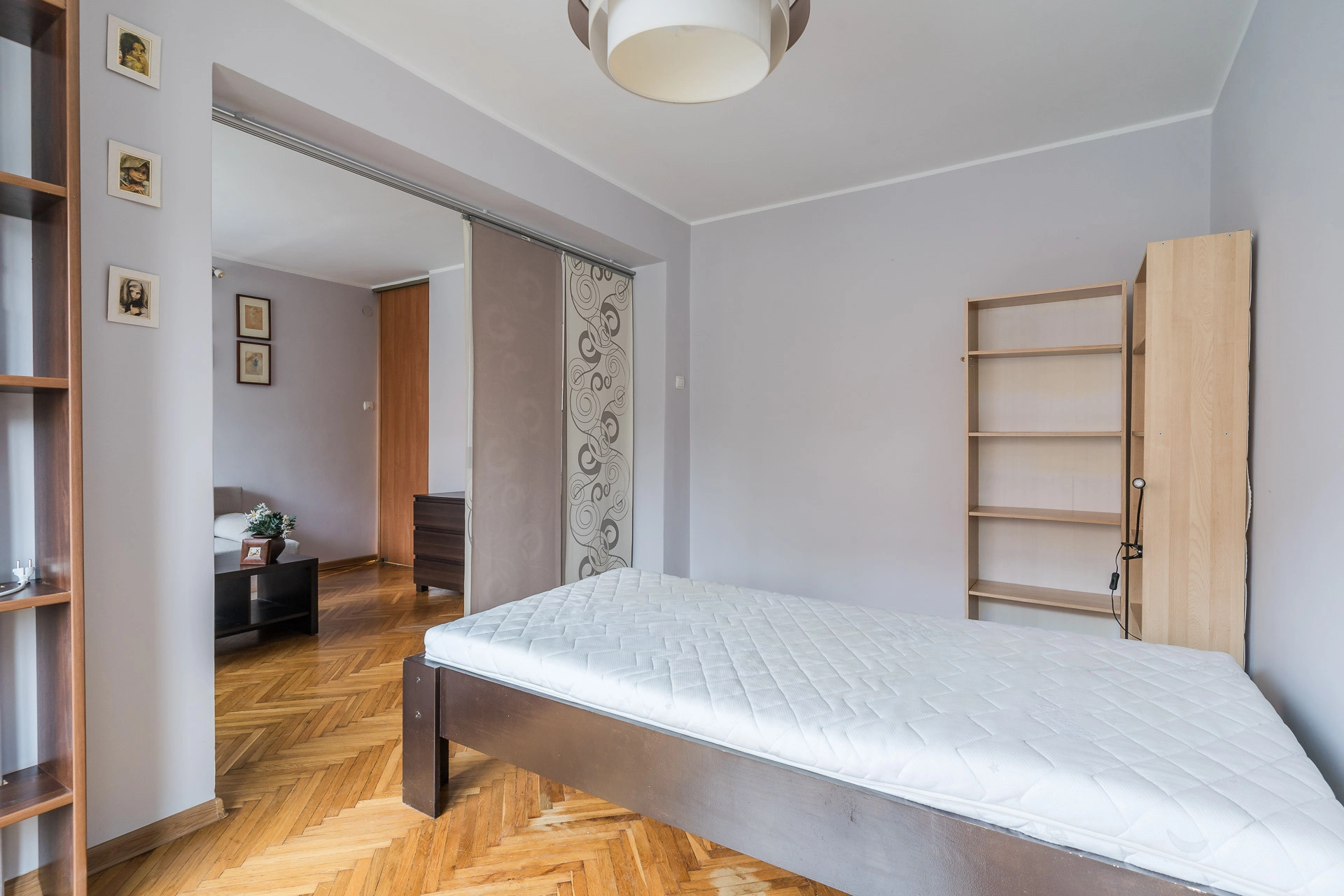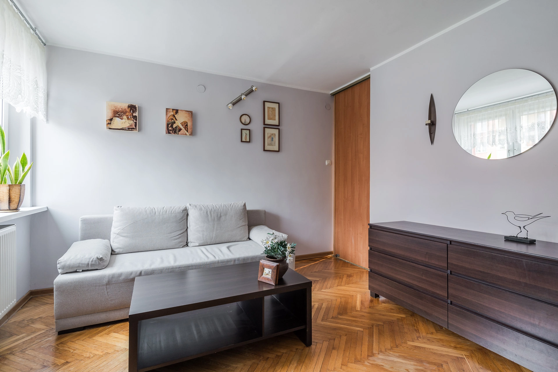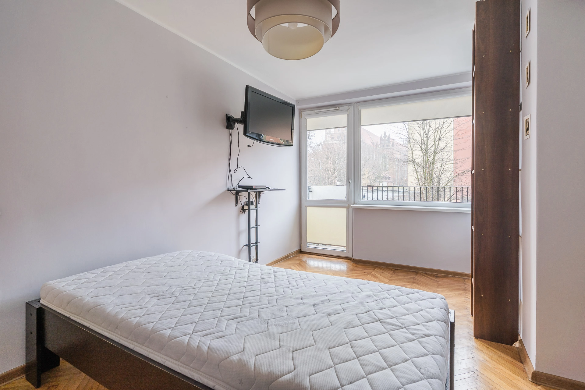 Większość podłóg w mieszkaniu pokryta jest parkietem. Lokal jest gotowy do zamieszkania i sprzedawany wraz z pełnym wyposażeniem — meble oraz sprzęty pozostają gratis dla nowego nabywcy.