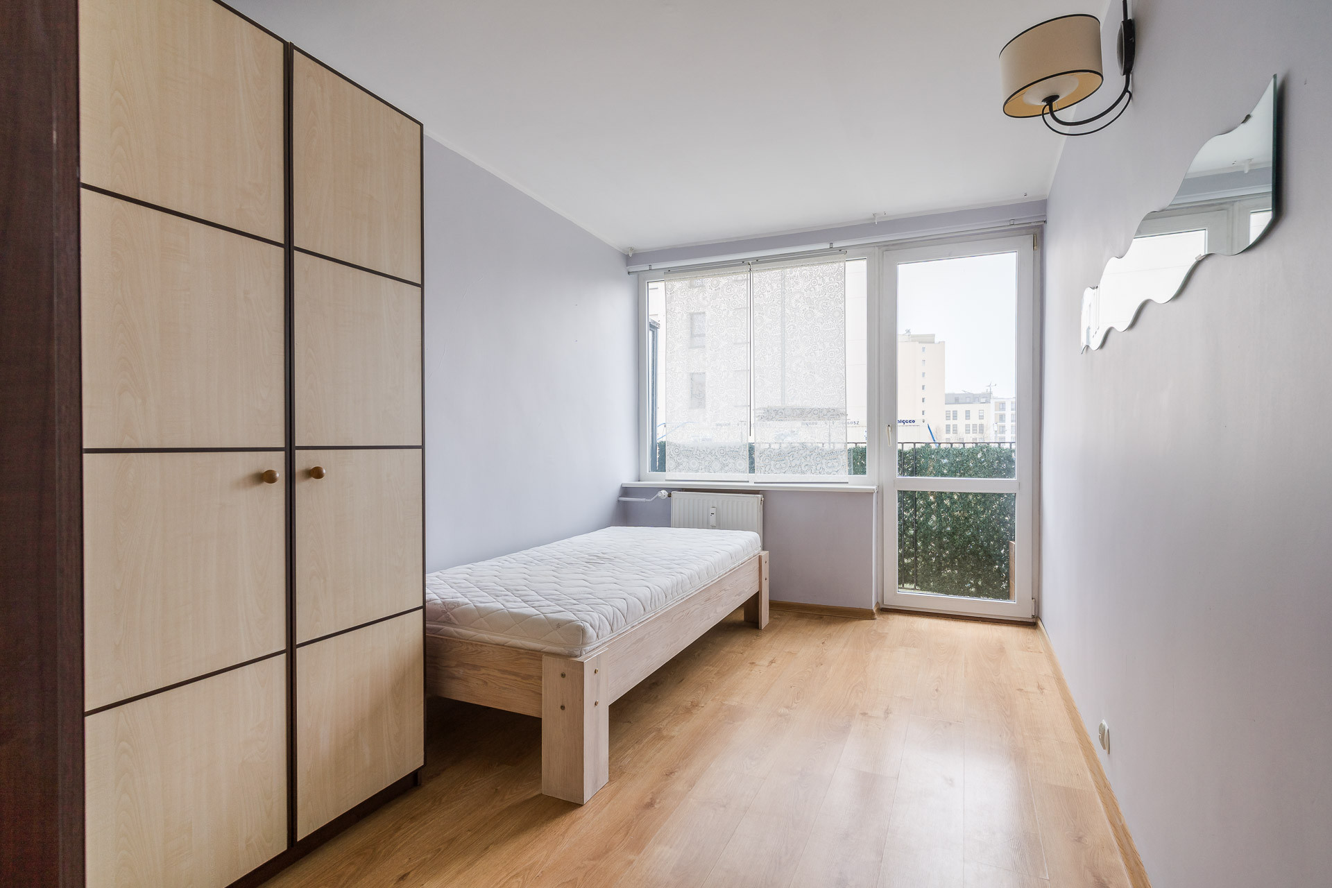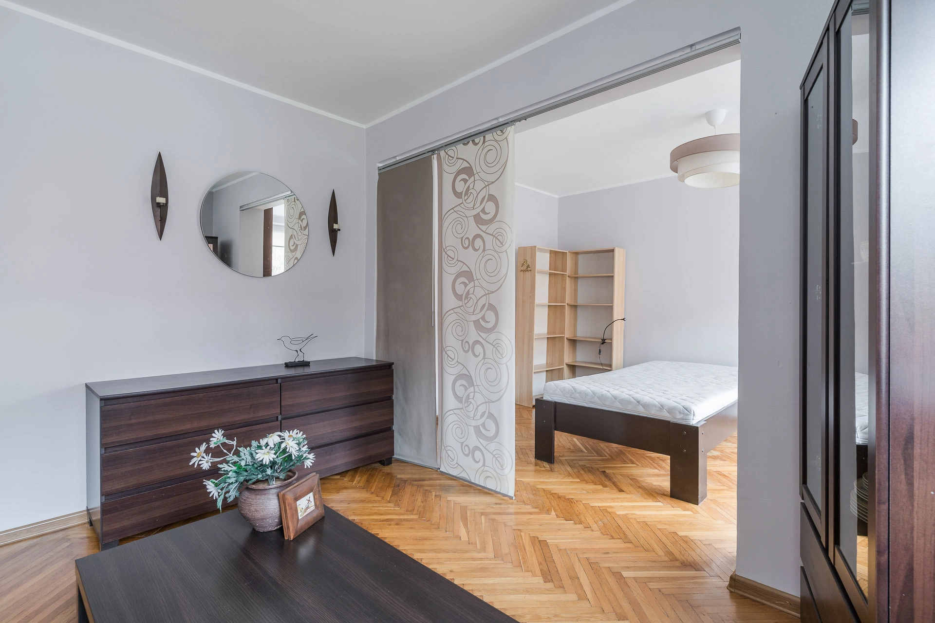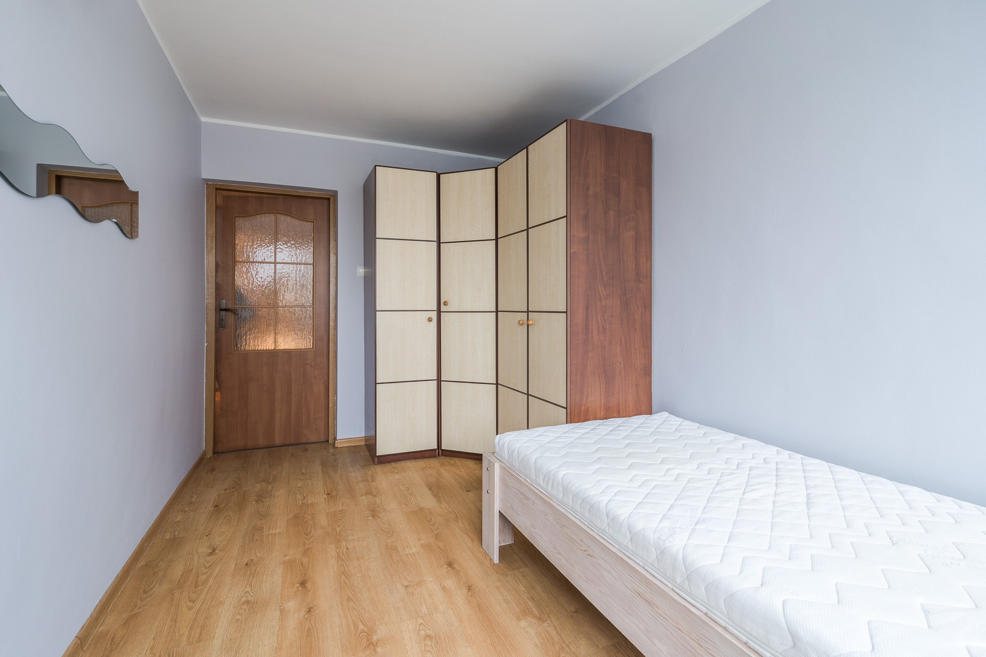 Większość podłóg w mieszkaniu pokryta jest parkietem. Lokal jest gotowy do zamieszkania i sprzedawany wraz z pełnym wyposażeniem — meble oraz sprzęty pozostają gratis dla nowego nabywcy.