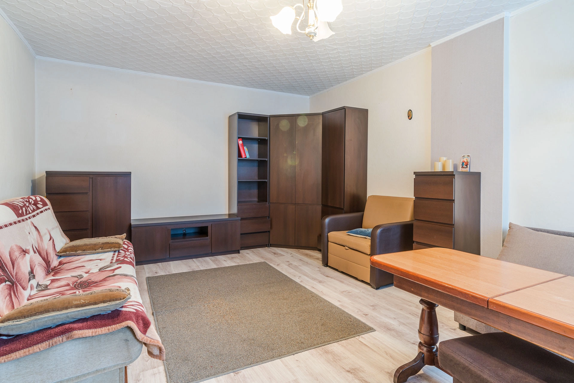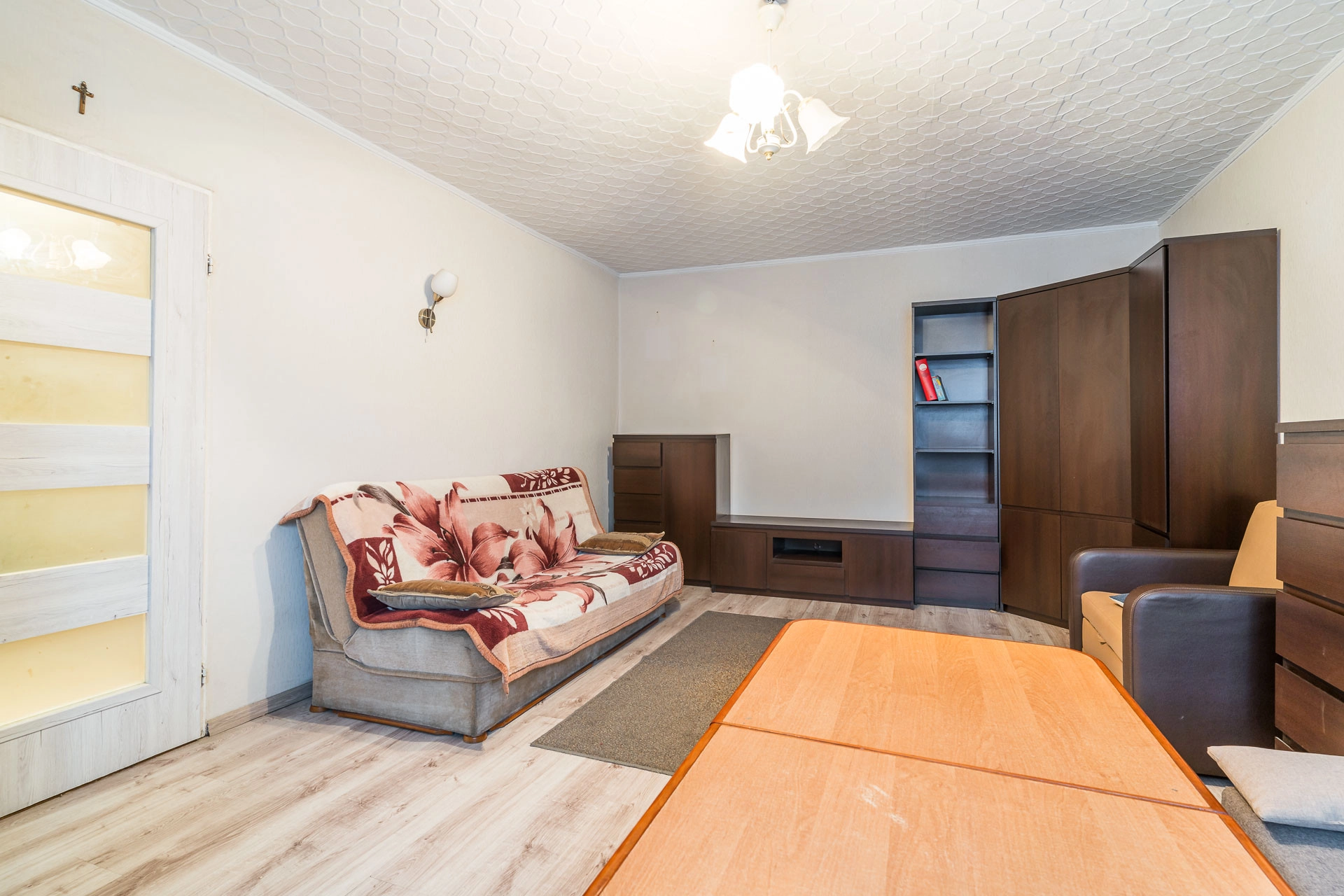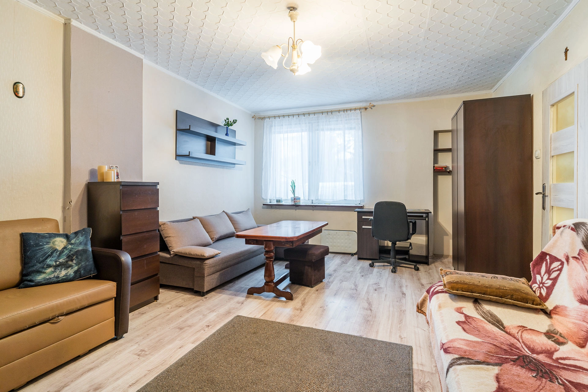 Mieszkanie składa się z dużego, przestronnego pokoju, łazienki z wc, kuchni i przedpokoju z werandą. Jest to przestrzeń, którą z łatwością można dopasować do własnych potrzeb – zarówno jako wygodne mieszkanie do zamieszkania, jak i atrakcyjną inwestycję pod wynajem.