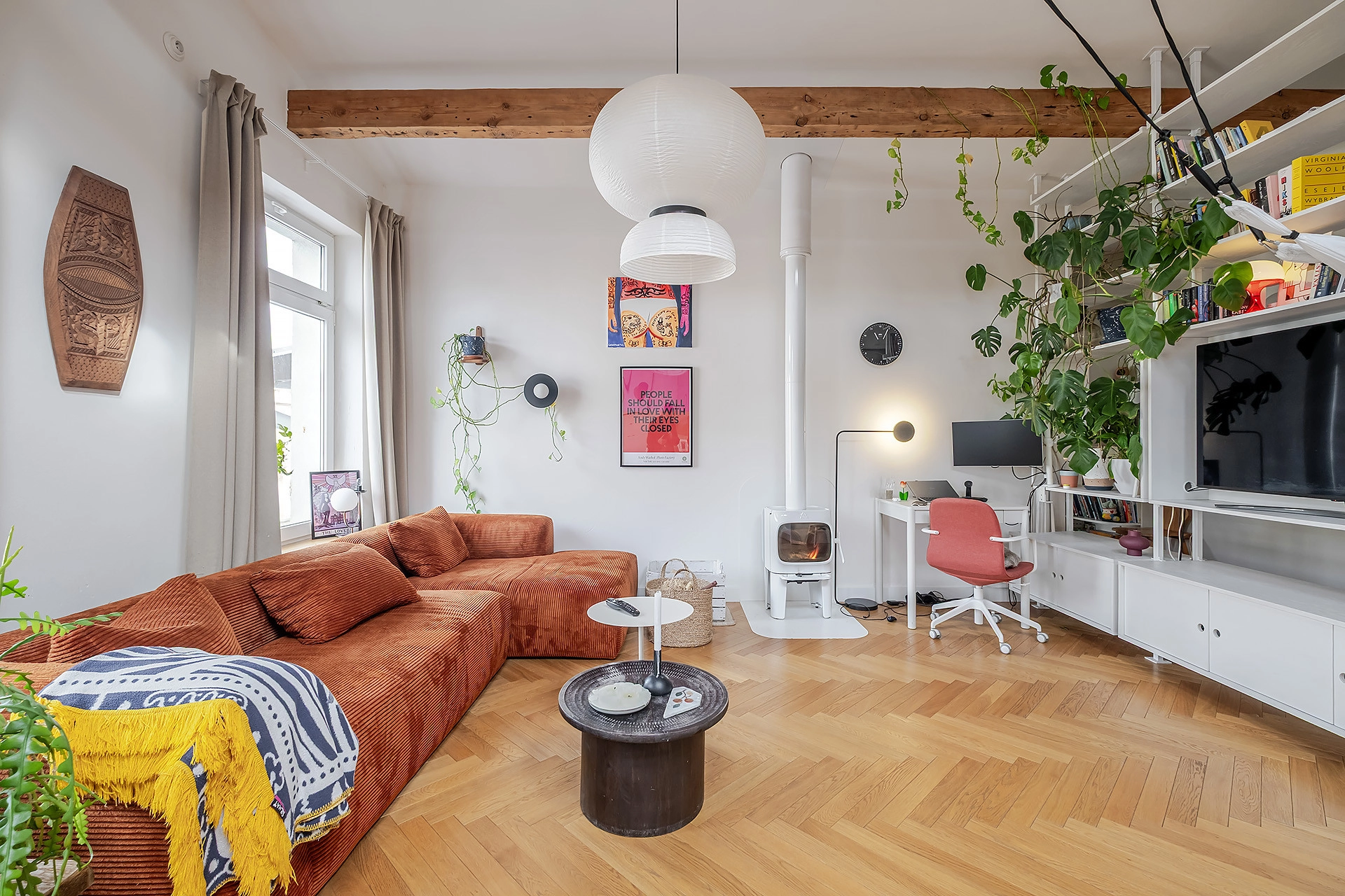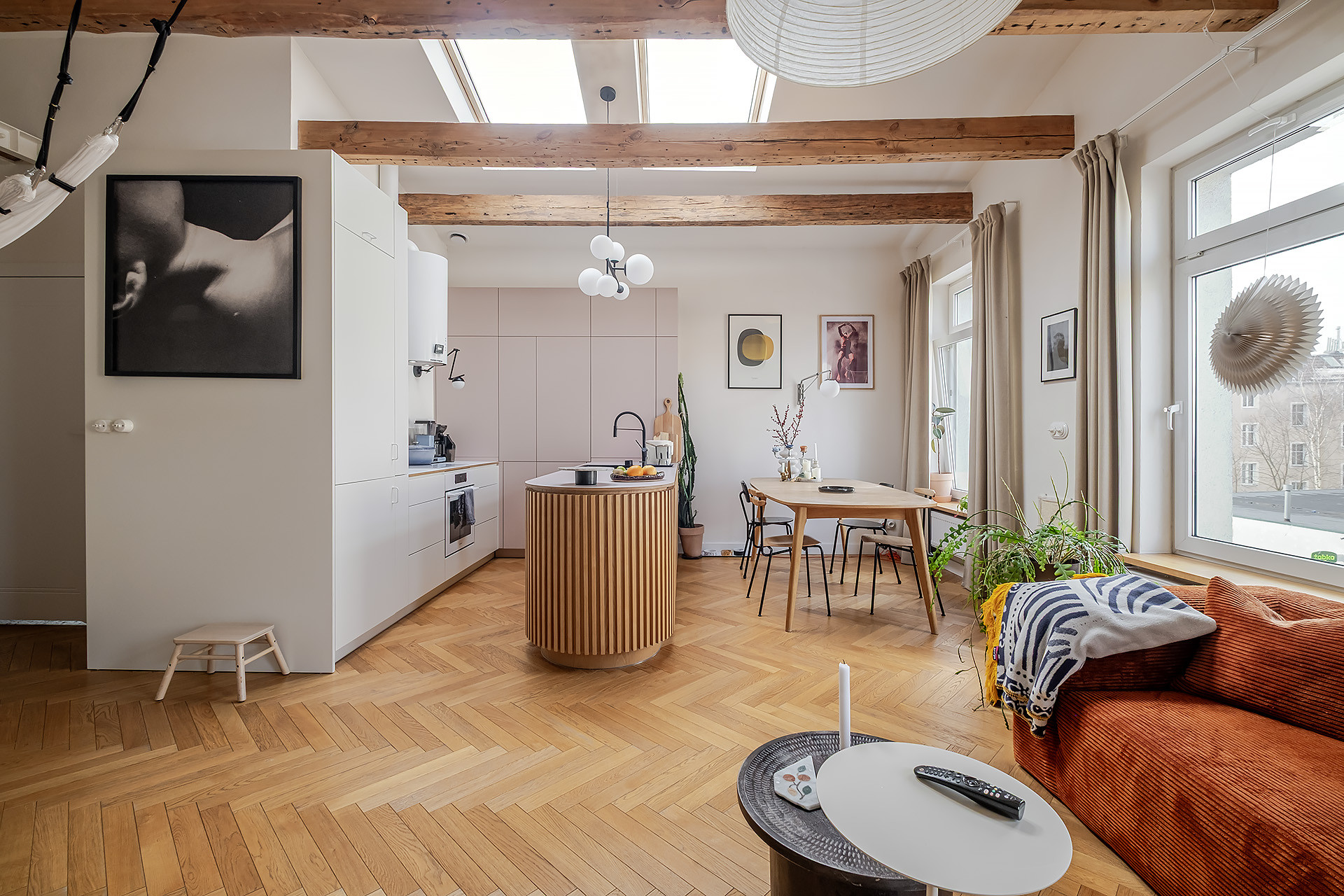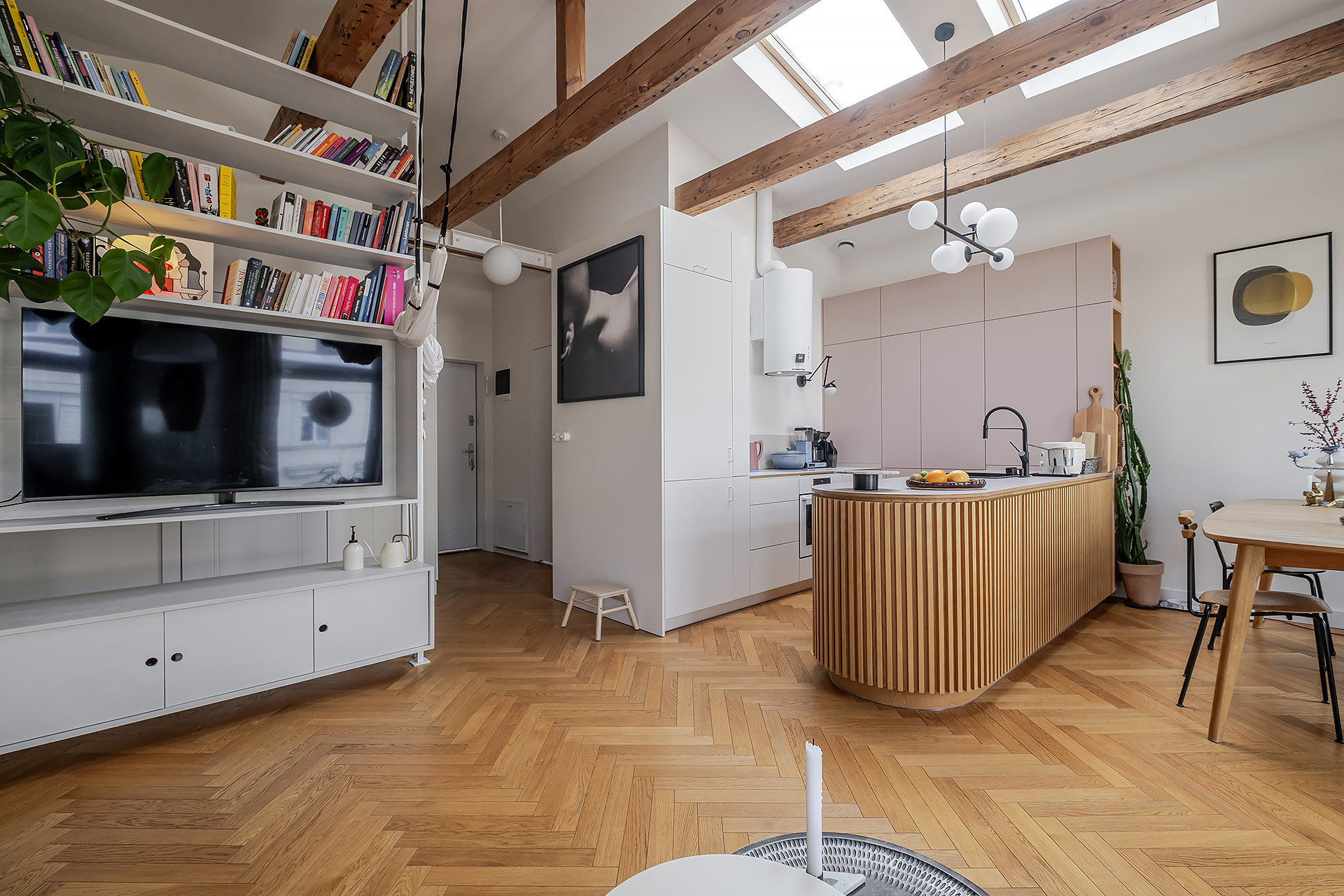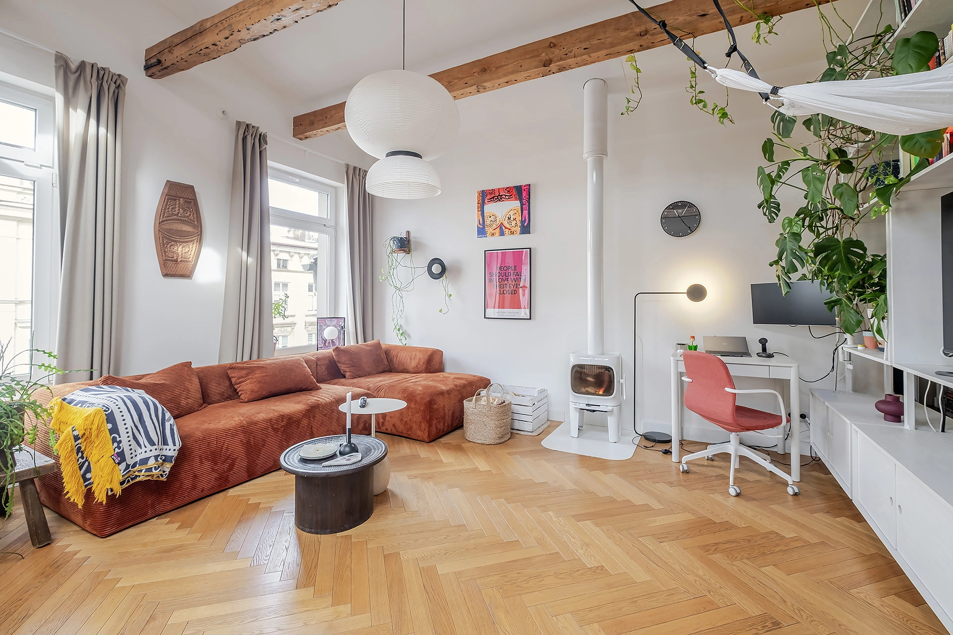 Niezwykłym atutem tego mieszkania jest jego zróżnicowana wysokość, doskonałe naświetlenie i niewątpliwie standard wykończenia. W przestrzeni dziennej mamy również możliwość korzystania z nowoczesnego i bardzo wydajnego kominka JOTUL.